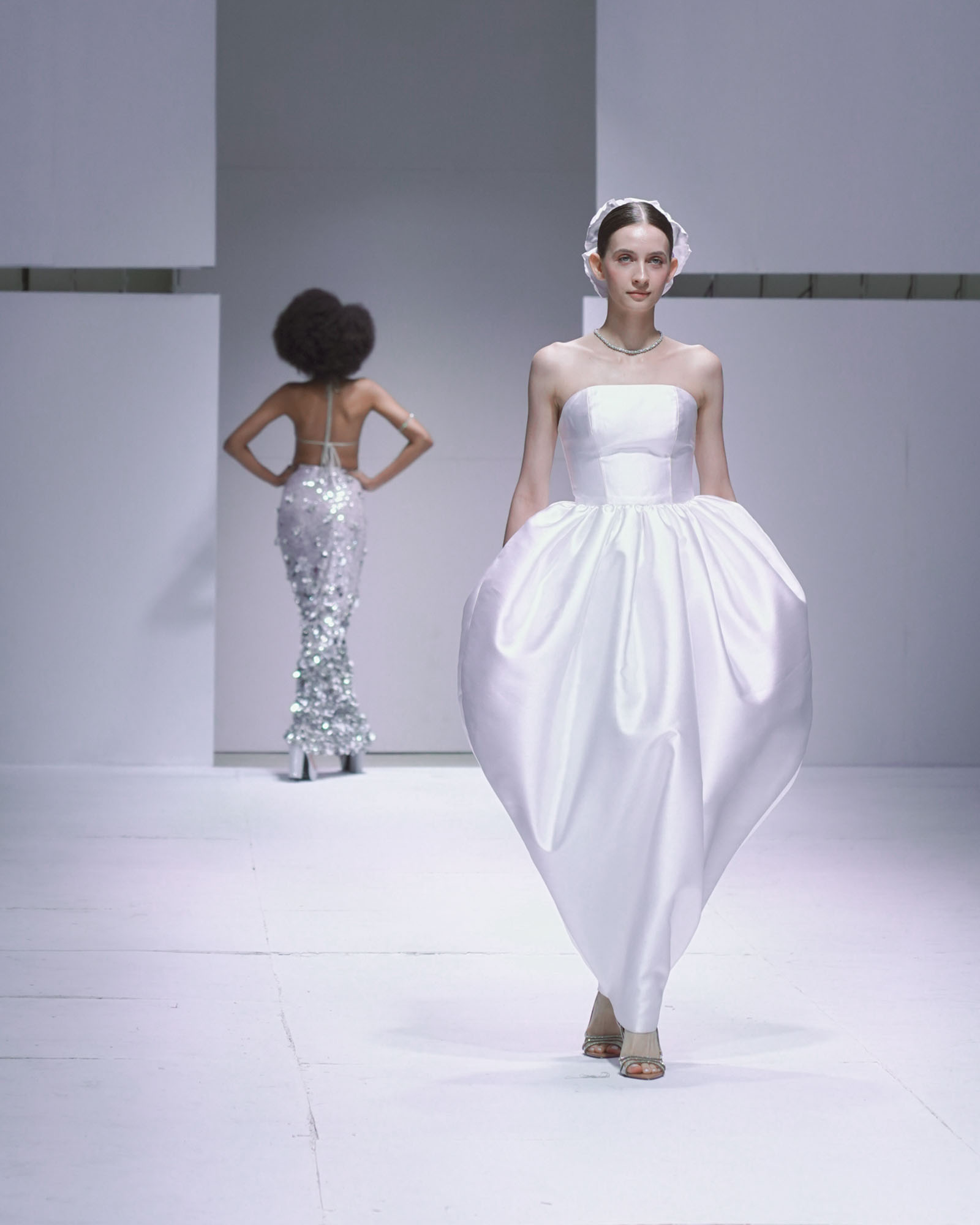 But his palette also made room for pieces that held an emphasis on form, like the tulip-shaped evening gown; floral assemblages that enveloped the body in a gauzy crush; trailing supersized bows; and vertical, narrow tube dresses and skirts. They’re a part of this new envisioning of his DNA, “statement-making pieces, in their loudest and quieter forms.” Altogether, the collection held the tone of a celebration, offering a playful reinterpretation of what bridal wear could be. Beltran explained, “I want to show that, nowadays, the bridal garment can and should be worn over and over, not just to sit in the closet after the wedding.”