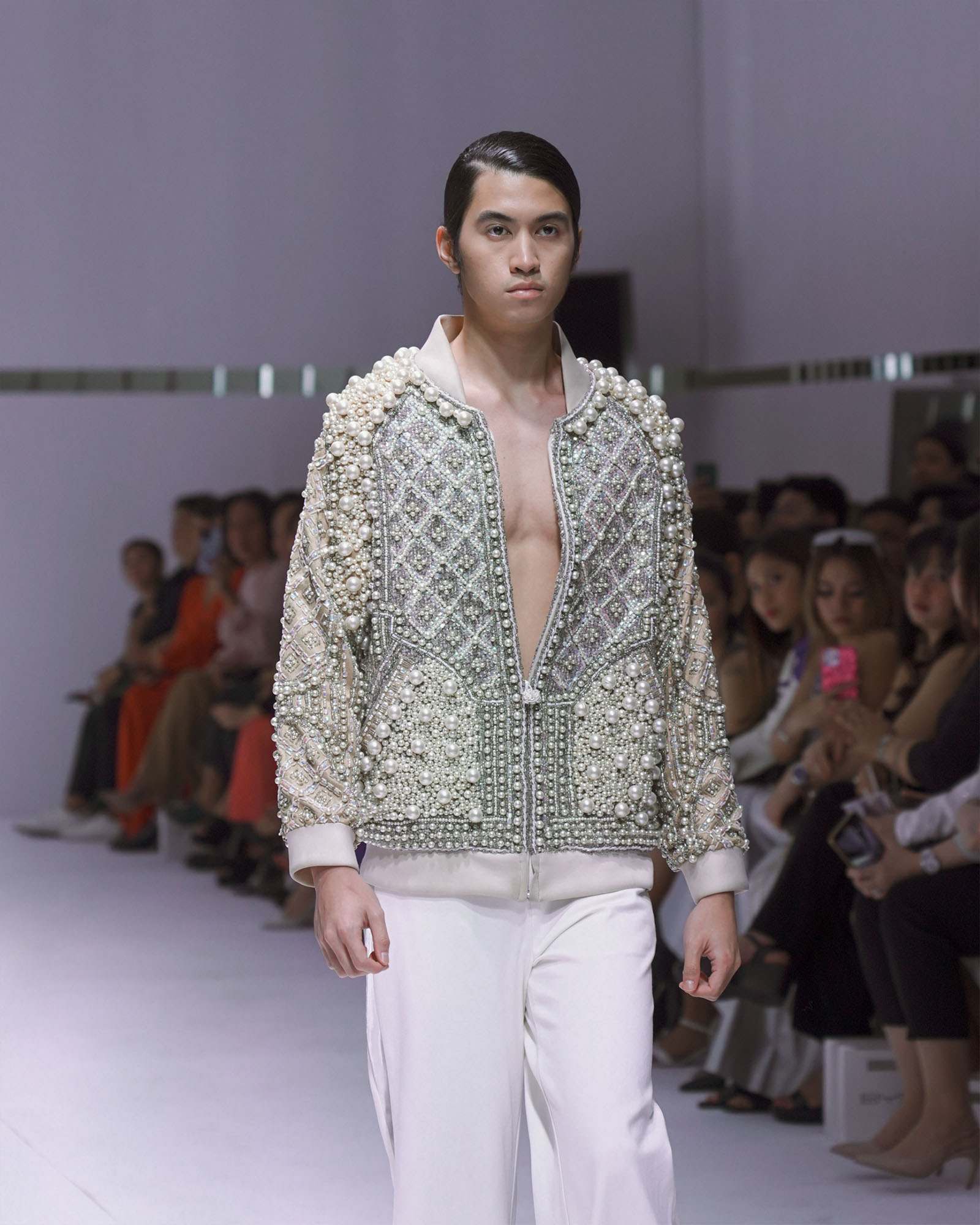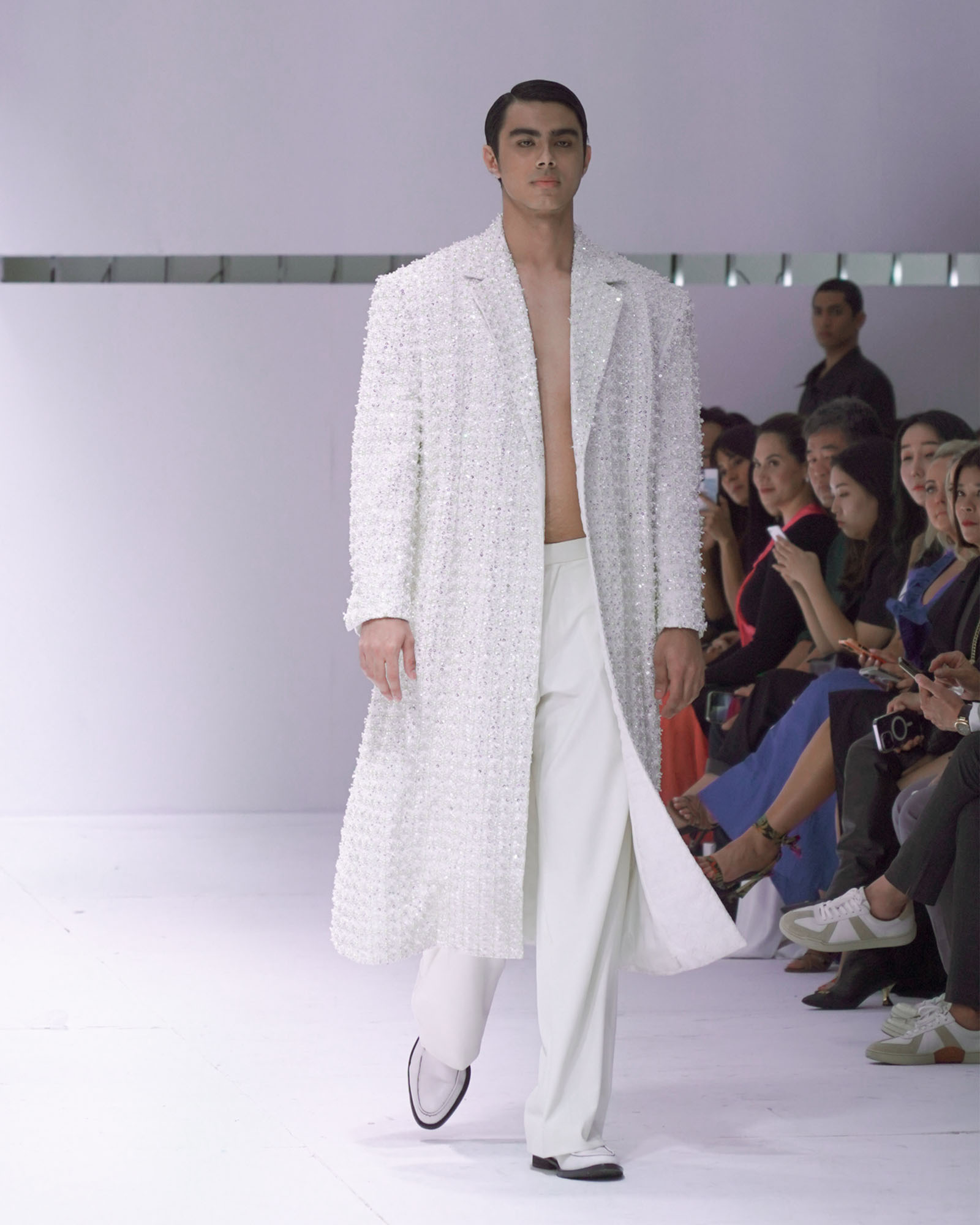 For his first bridal collection, Beltran abided by a bit of superstition. After he presented his last ensemble (a glittering long-line men’s jacket “instead of the usual bride-as-a-finale-look”), he surprised his guests with a special performance. The members of P-Pop group SB19 lined down the runway, crooning to the slow, bass-heavy beat of their song, “I Want You.”