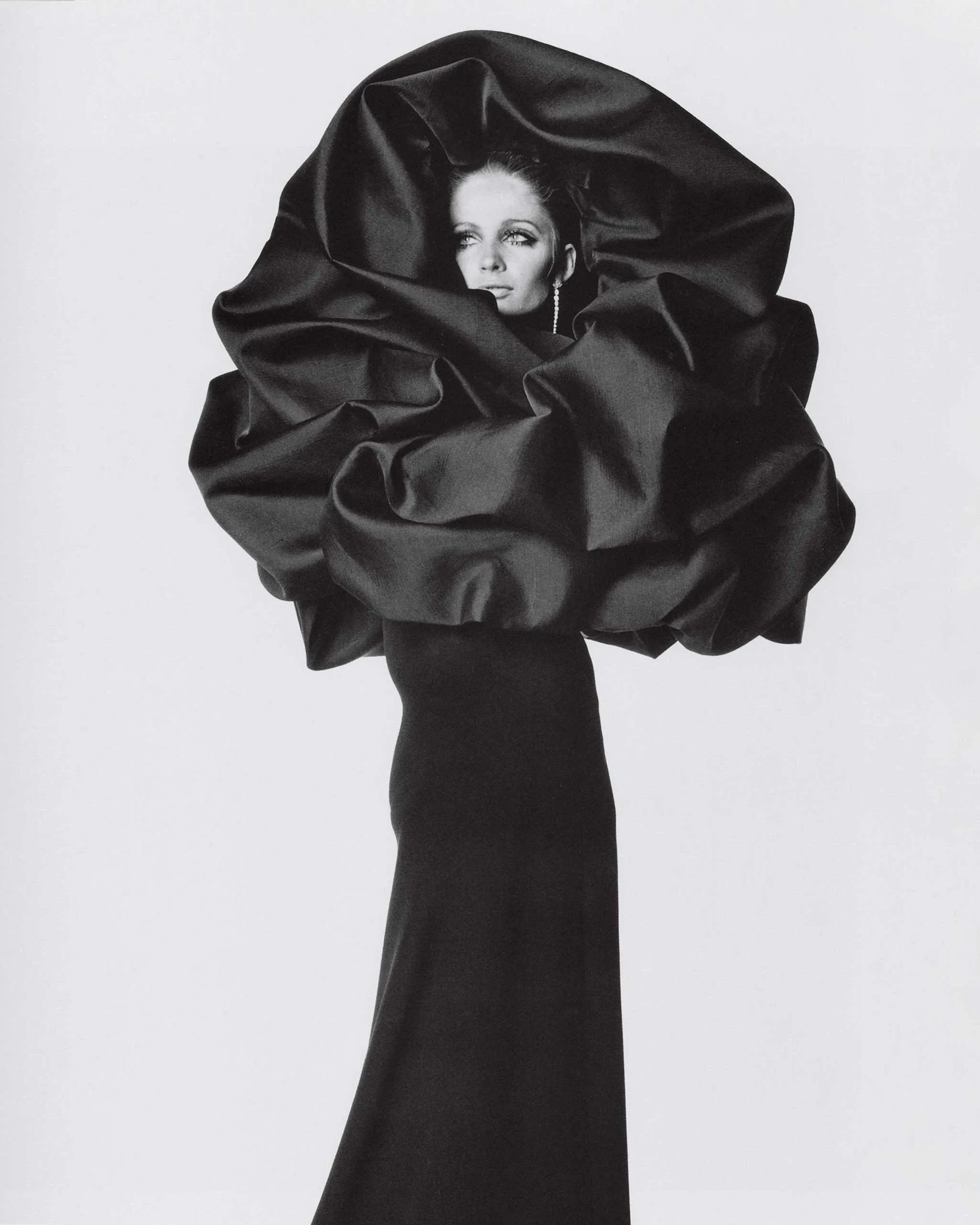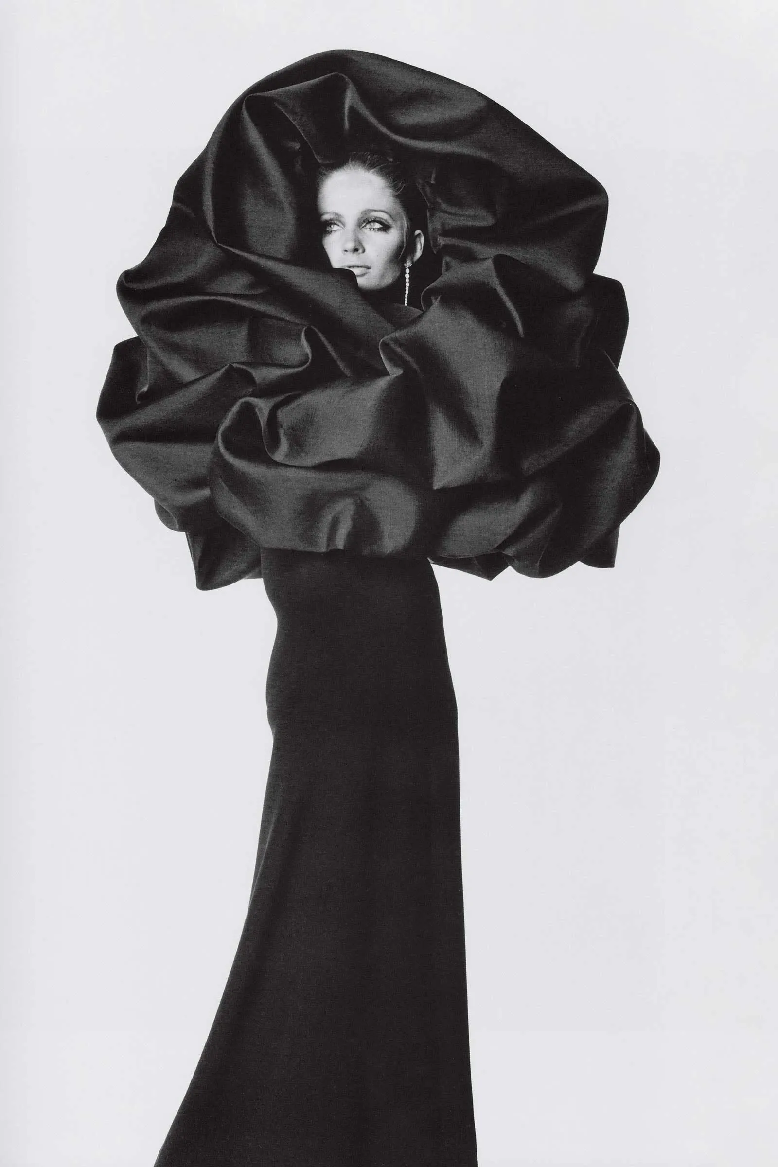 A rose is a rose is a rose is a rose. Susan Murray wears Cristóbal Balenciaga’s black crepe dinner dress with black gazar rose headdress. Photographed by Irving Penn, Vogue, September 15, 1967