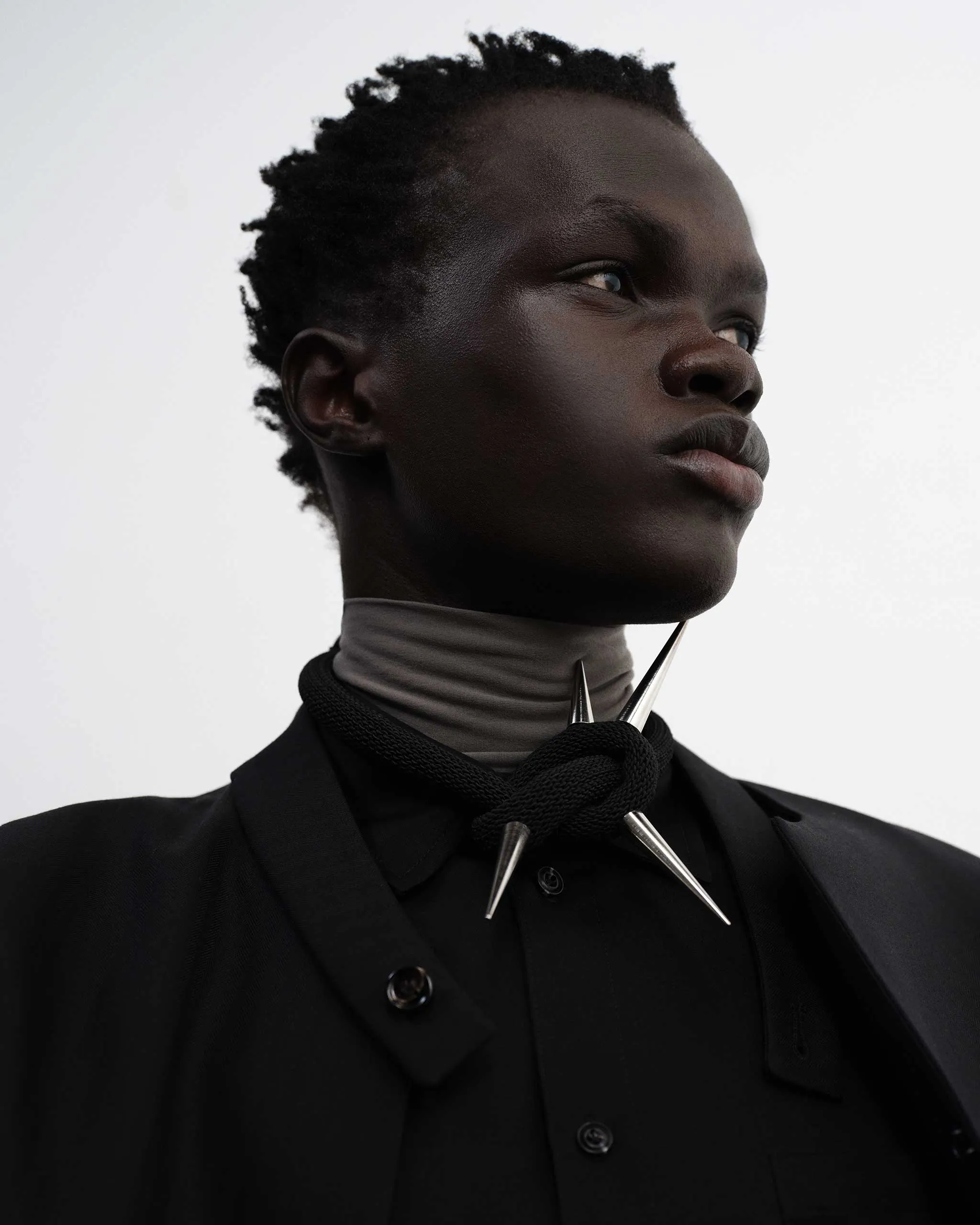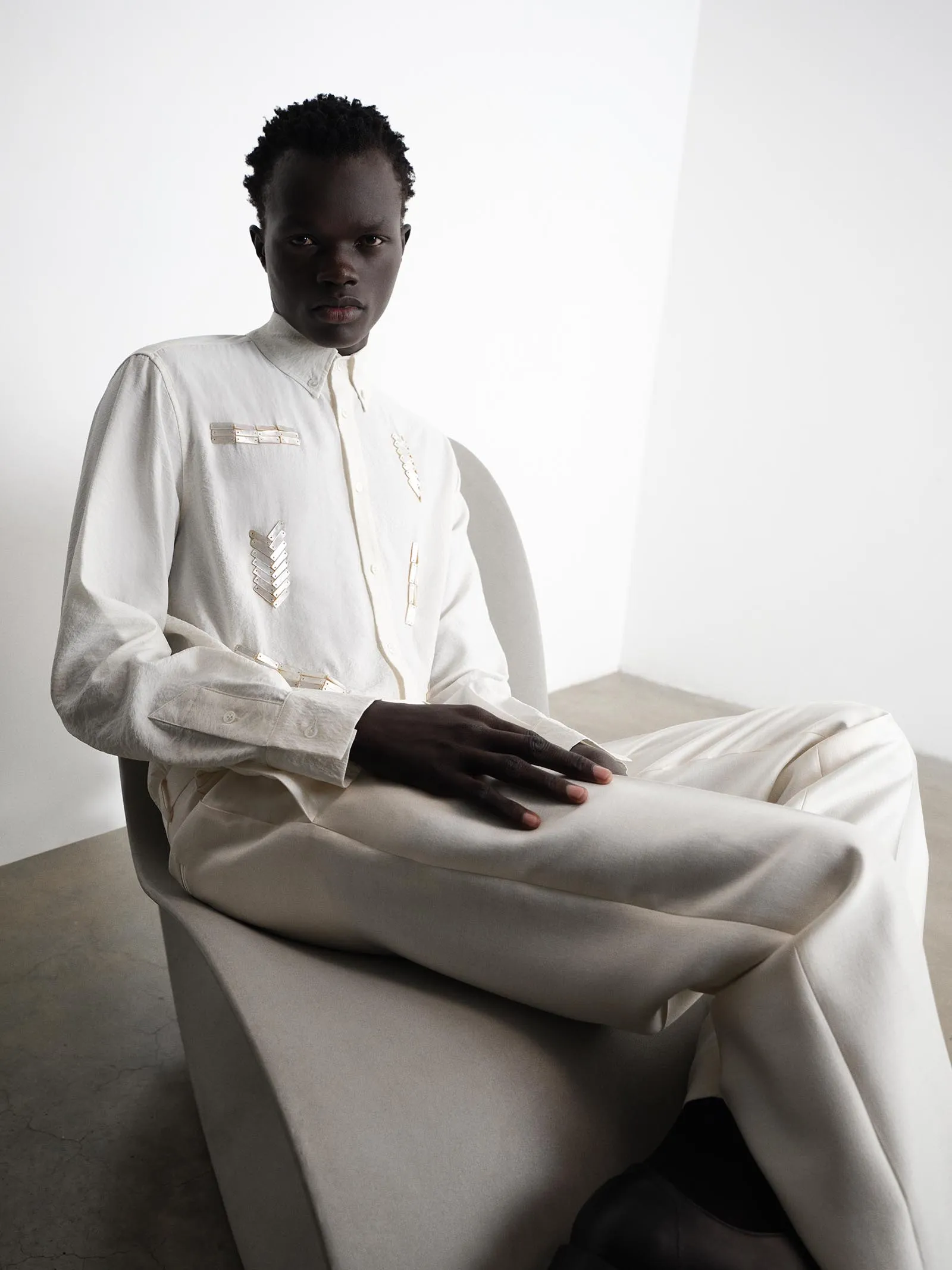 Those memories materialise with tessellating mother-of-pearl embroidery and cowrie shells detailing on cuffs, ties, and clothes, translating traditional Filipino craftsmanship for the modern era. Handmade jewelry by classmate Berlin-based designer Ekaterina Pronina continues an ongoing partnership, incorporating geometric beads, crystals, and studs that he describes as a ‘British’ attitude. The hats reinterpret the box forms in Luz’s paintings as escarpment-like structures, intended for flexibility for the wearer.