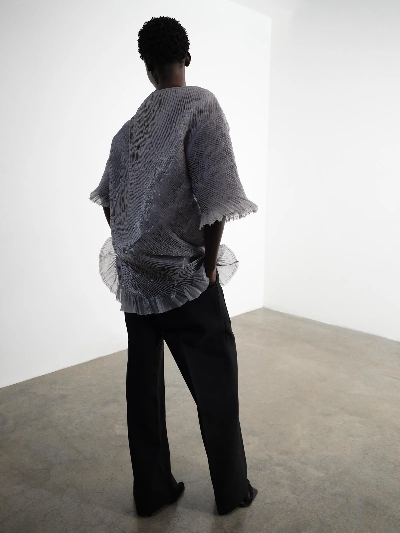 Deconstructed lapels and reworked collars appear throughout, synthesized with equilibrate folds, pintuck stitches, and drapery. “Tailoring is quite integral for me,” the designer says. “I wanted to bring a sense of freedom and irregularity. I felt like it was a modern take of a classic.” The result is clothing that feels intellectually avant-garde, yet accessible to an international luxury customer.