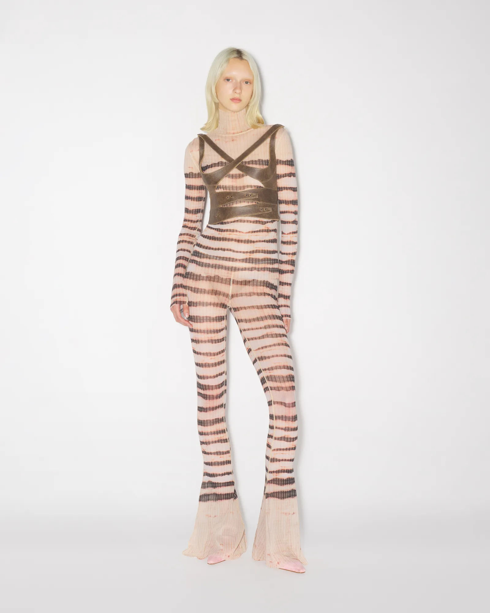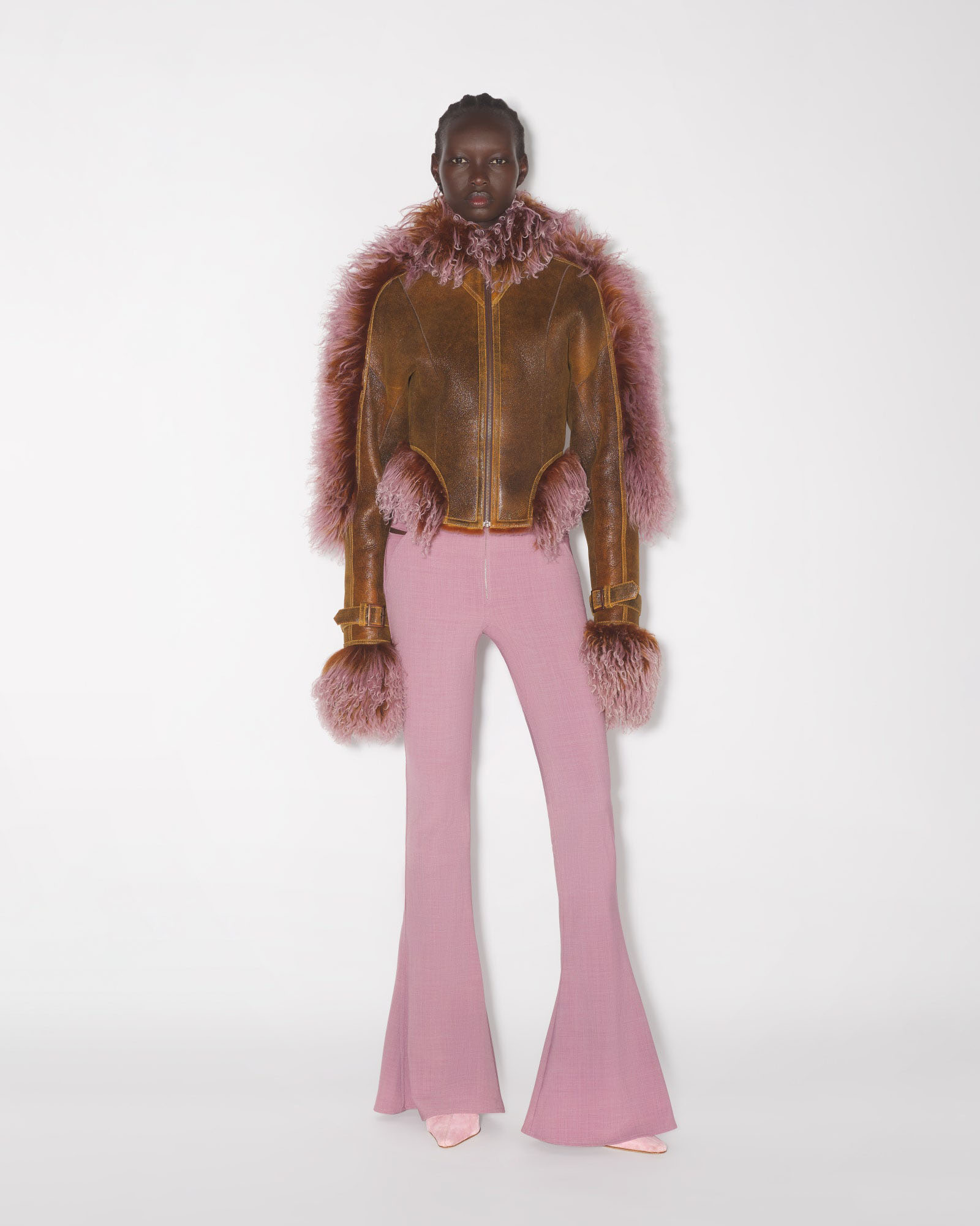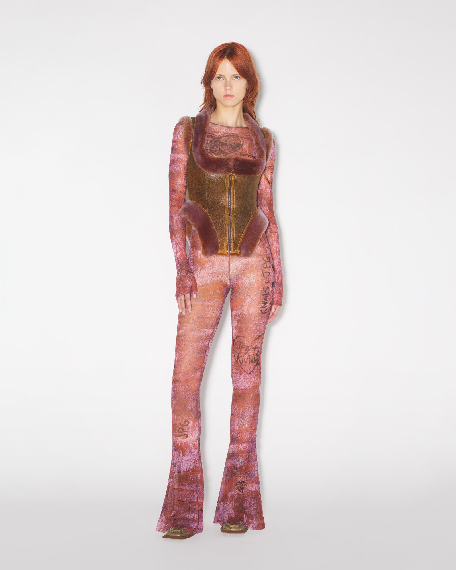 It helps that the designers are using the Jean Paul Gaulter Knwls collaboration to expand their offering beyond groin-slicing undergarments. “At first it was all about layering minuscule bits of fabric. But as I mature, I want the wardrobe to develop with me. I want trousers and knitwear and coats,” Knowles says. One of the strongest proposals in this collaboration, then, is a maniacally-cropped biker jacket with pale pink fuzz rupturing through its seams; a more imposing silhouette that will continue into their spring/summer 2024 collection. “It feels like something that could exist in both the Jean Paul Gaultier and Knwls archive.”