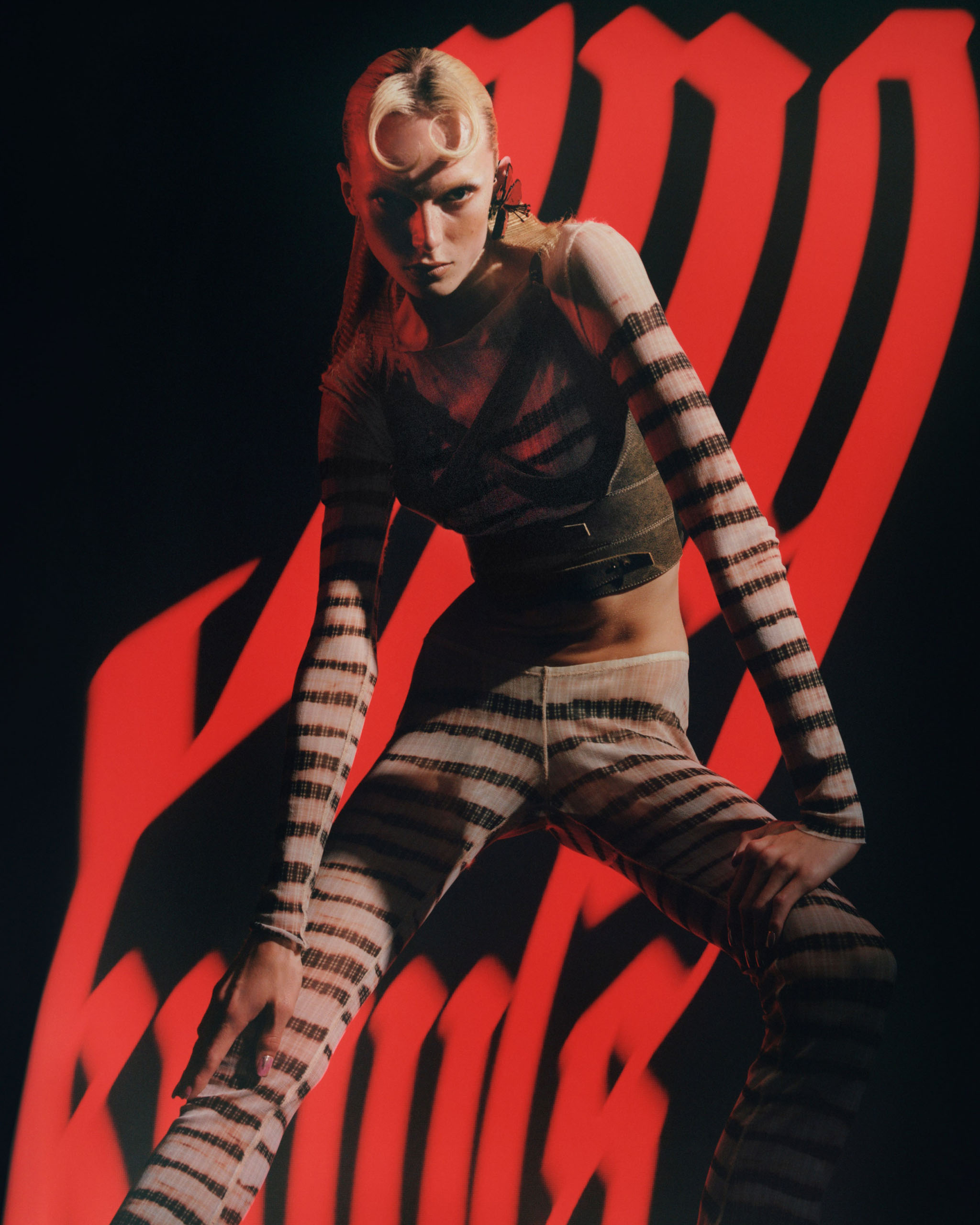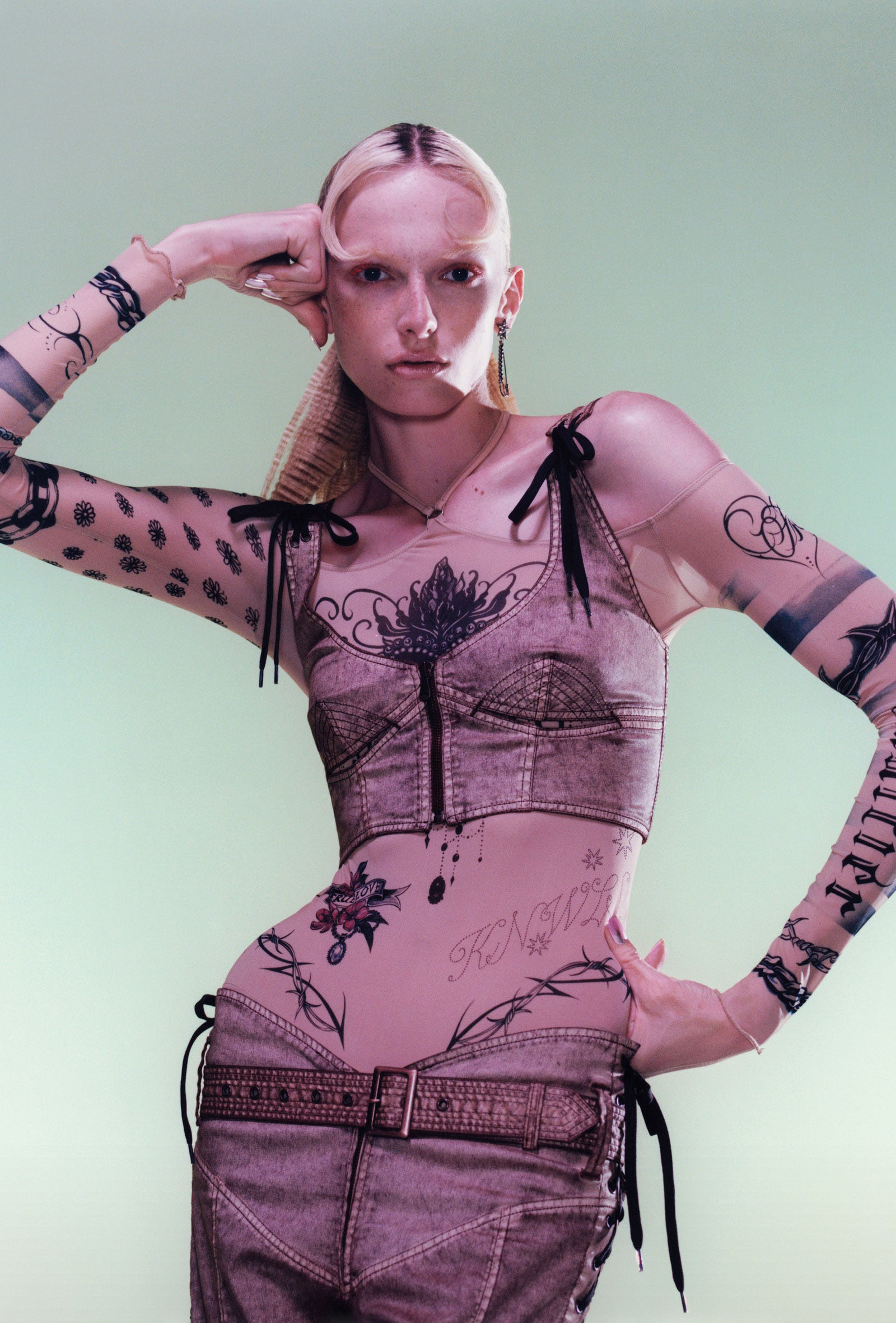 The same goes for Gaultier’s signature marinière print, which has been rendered in bleached plaid across skin-tight minidresses and lithe flares and off-the-shoulder knits that look as though they’ve been sundered in a riptide. “We were always going to be drawn to things that could exist in our world, but we also wanted to choose these very classic tropes to make it obvious,” Knowles says. Fashion nerds will also recognise the tattoo-illusion leotards, borrowed from Gaultier’s spring/summer 1994 collection, and redrawn with wailing serpents and crystalline love hearts and industrial barbed wire.