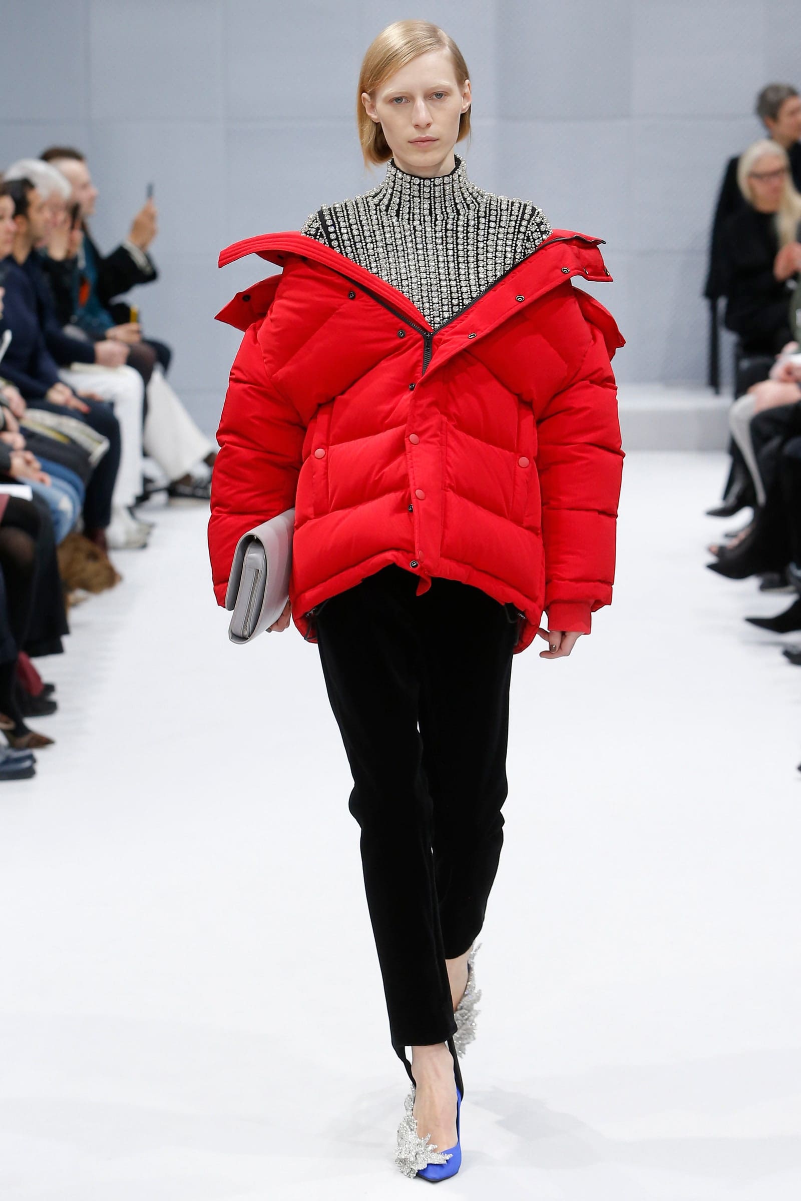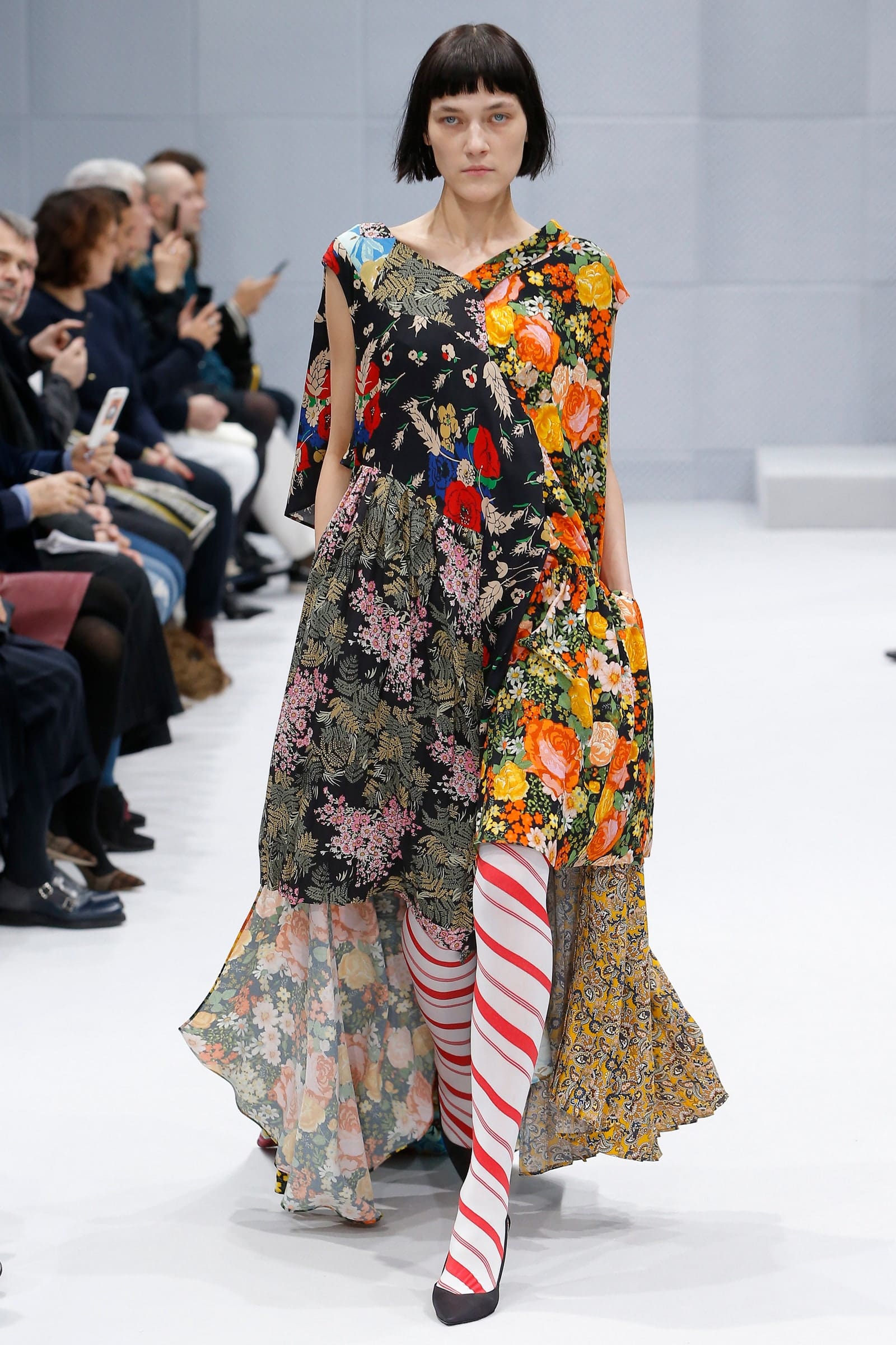 Obvious because he’s an internal hire, hiding in plain sight. Both Gucci and Balenciaga, where Demna has been creative director for nearly 10 years, are owned by Kering; the familiarity and comfort level on both sides will ease the transition. Also obvious because his Balenciaga was so original. Glancing back at his silhouette-shifting Balenciaga debut, with its sculptural parkas, the injection molded business suits, the floral dresses with the candy stripe tights—those pieces look as definitive now as they did at the time. The collective thrill across the audience was palpable—it was a real, rare wow moment, one that sparked instant desire.