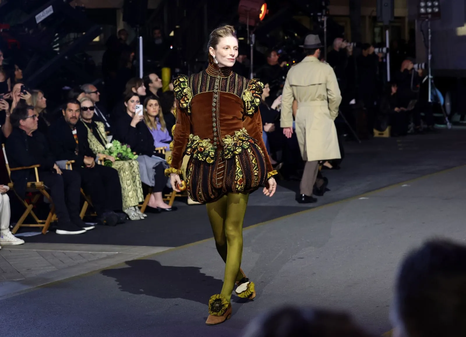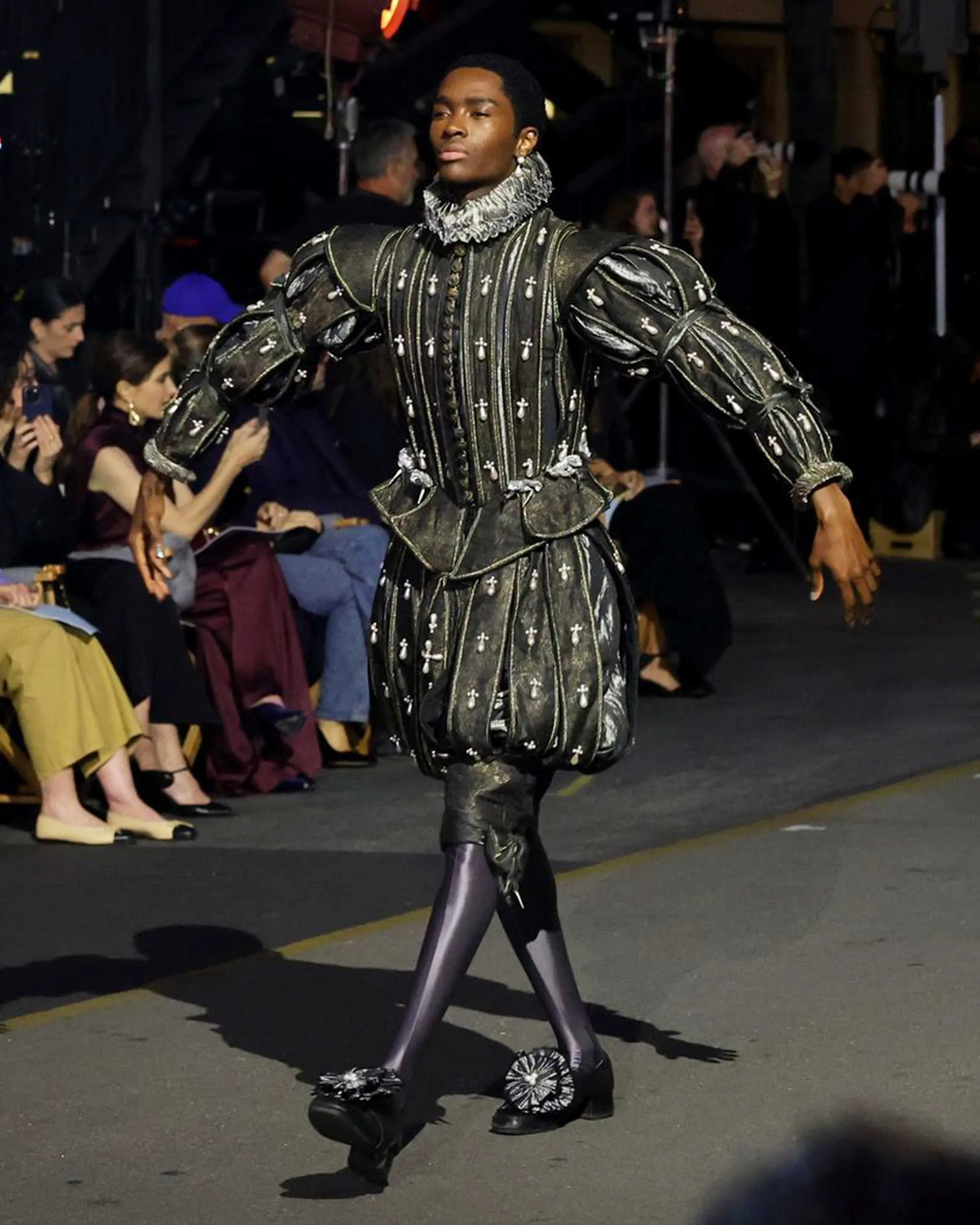 At Vogue World: Hollywood, this question was revisited in the “Avant-Garde” chapter, curated by Orlando’s costume designer Sandy Powell. The segment brought Woolf’s vision of fluid identity to life through a collection of costumes and looks by designers including Demna, Nicolas Ghesquière, Dries Van Noten, and Alessandro Michele. Actress Hunter Schafer opened the tableau in one of the original costumes from the film, while Jeff Goldblum strutted in a silver and electric-blue Gucci power jacket, echoing the glam-rock energy of Powell’s work for Velvet Goldmine. Closing the sequence, Alex Consani appeared in a Valentino haute couture reinterpretation of the opening look: a cream Shakespearean blouse with ruffled sleeves, a bridle leather corset, juniper-green and pearl bloomers, and a dramatic capelet.