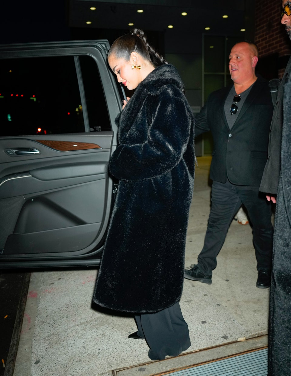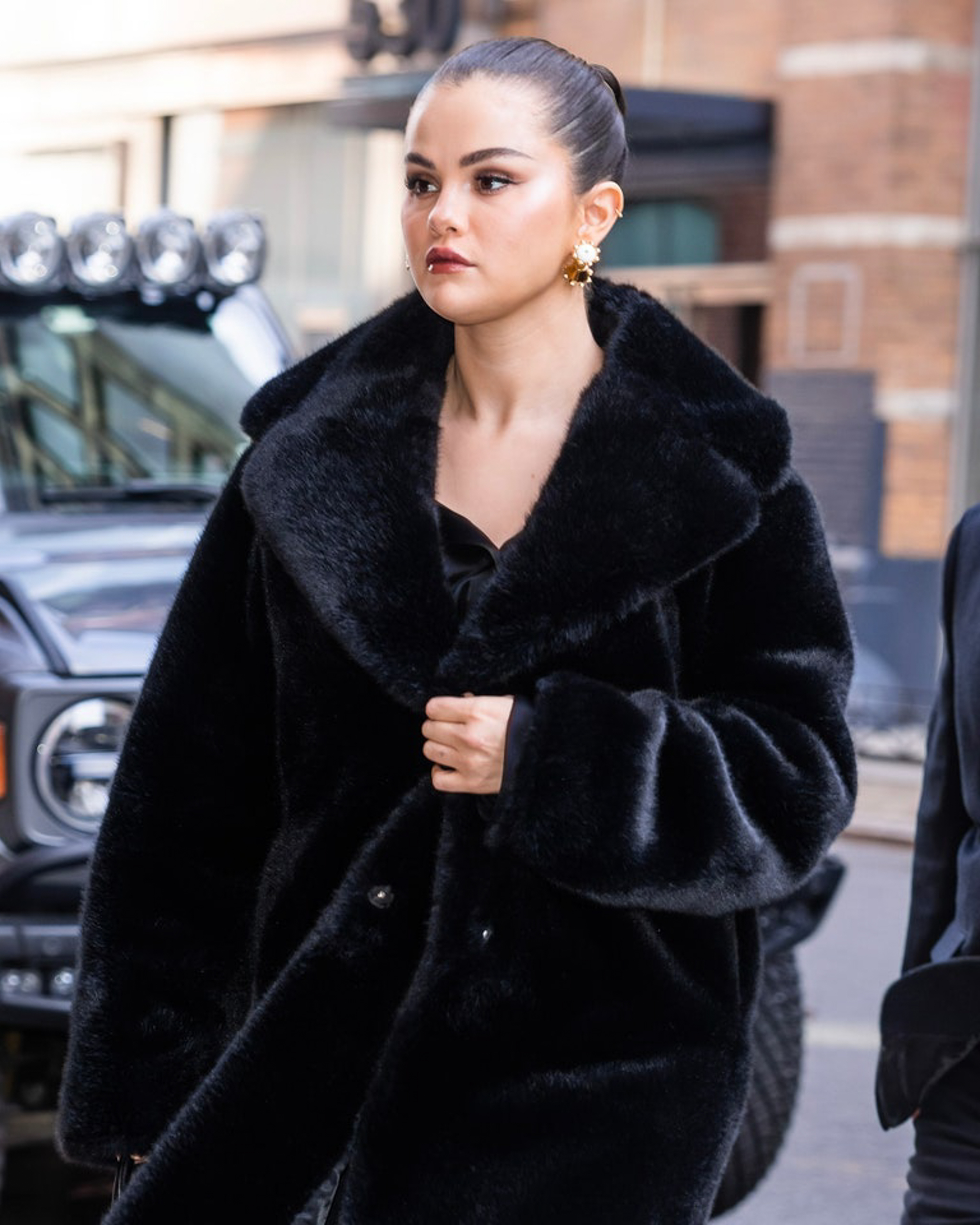 Gomez nailed her hair and make-up, and her outfit meant business, too. Her stylist Kate Young selected a fuzzy coat, tailored trousers and smart boots from Paris Texas for her client to wear, complete with a work-meets-play bag from Delvaux.