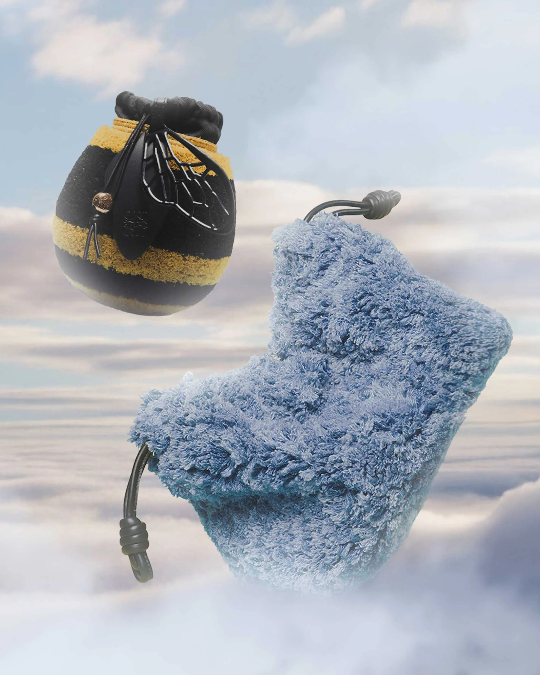 LOEWE Bee bucket bag and Flamenco denim clutch available at Greenbelt 3. Photographs by Joseph Bermudez, art by Mcaine Carlos