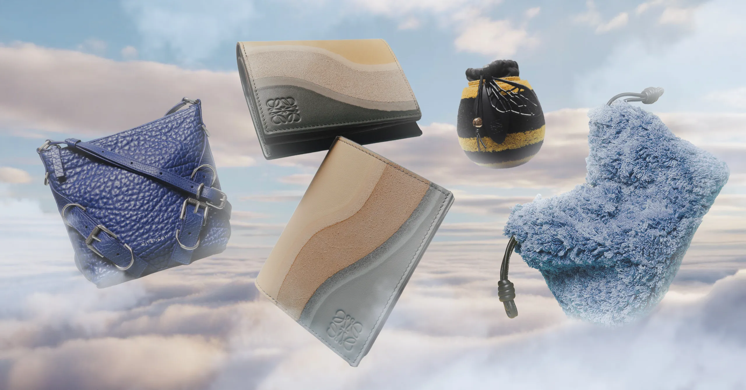 GIVENCHY Voyou body bag available at Greenbelt 4, LOEWE Compact Landscape wallets, LOEWE Bee bucket bag, and Flamenco denim clutch available at Greenbelt 3. Photographs by Joseph Bermudez, art by Mcaine Carlos