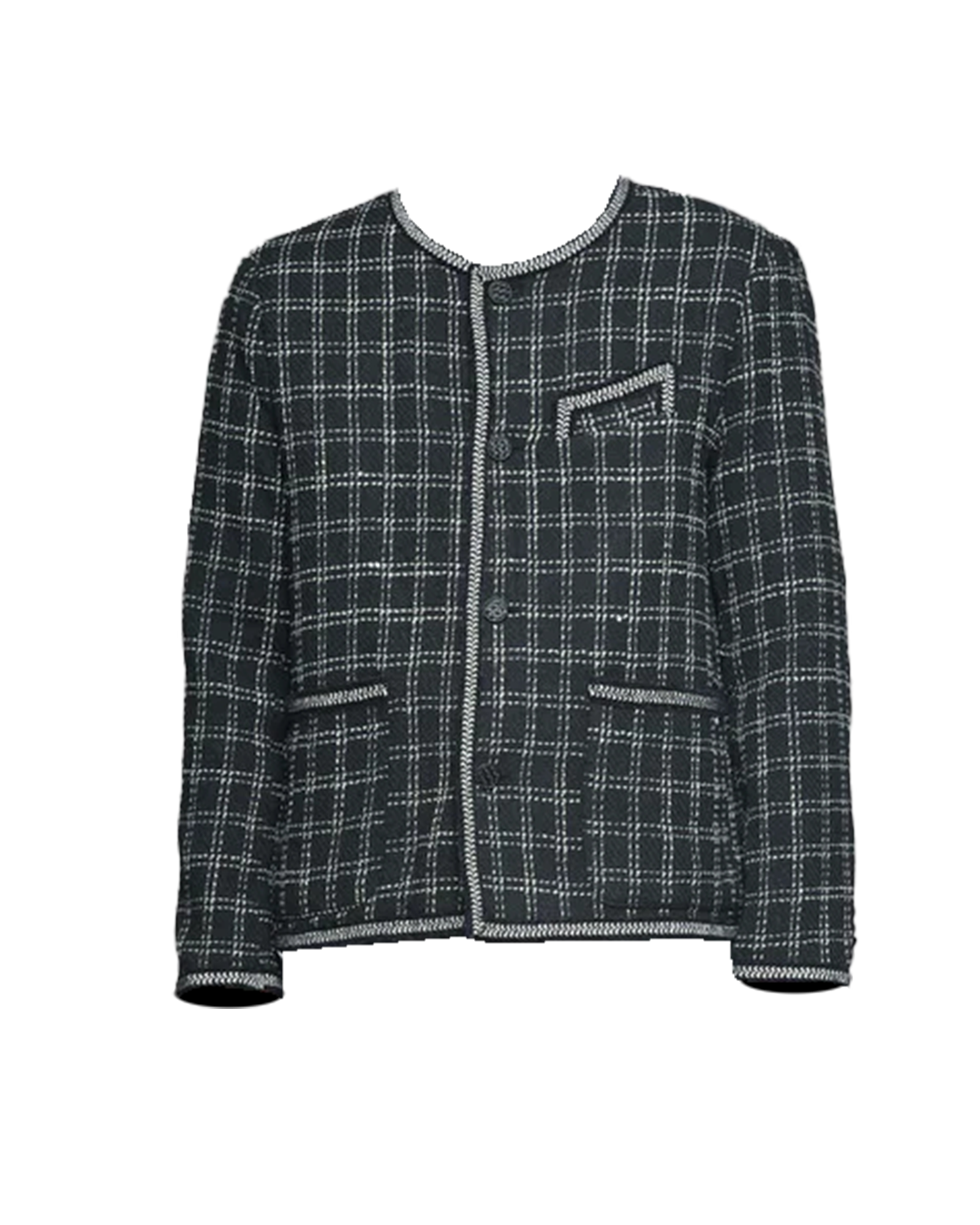 With a rounded collar, braided trimming on the edge and a cropped silhouette, D.D.Daily’s Black Windowpane Check Tweed Jacket is the perfect alternative to the usual all-black notched lapel suiting any noir loving person would own.