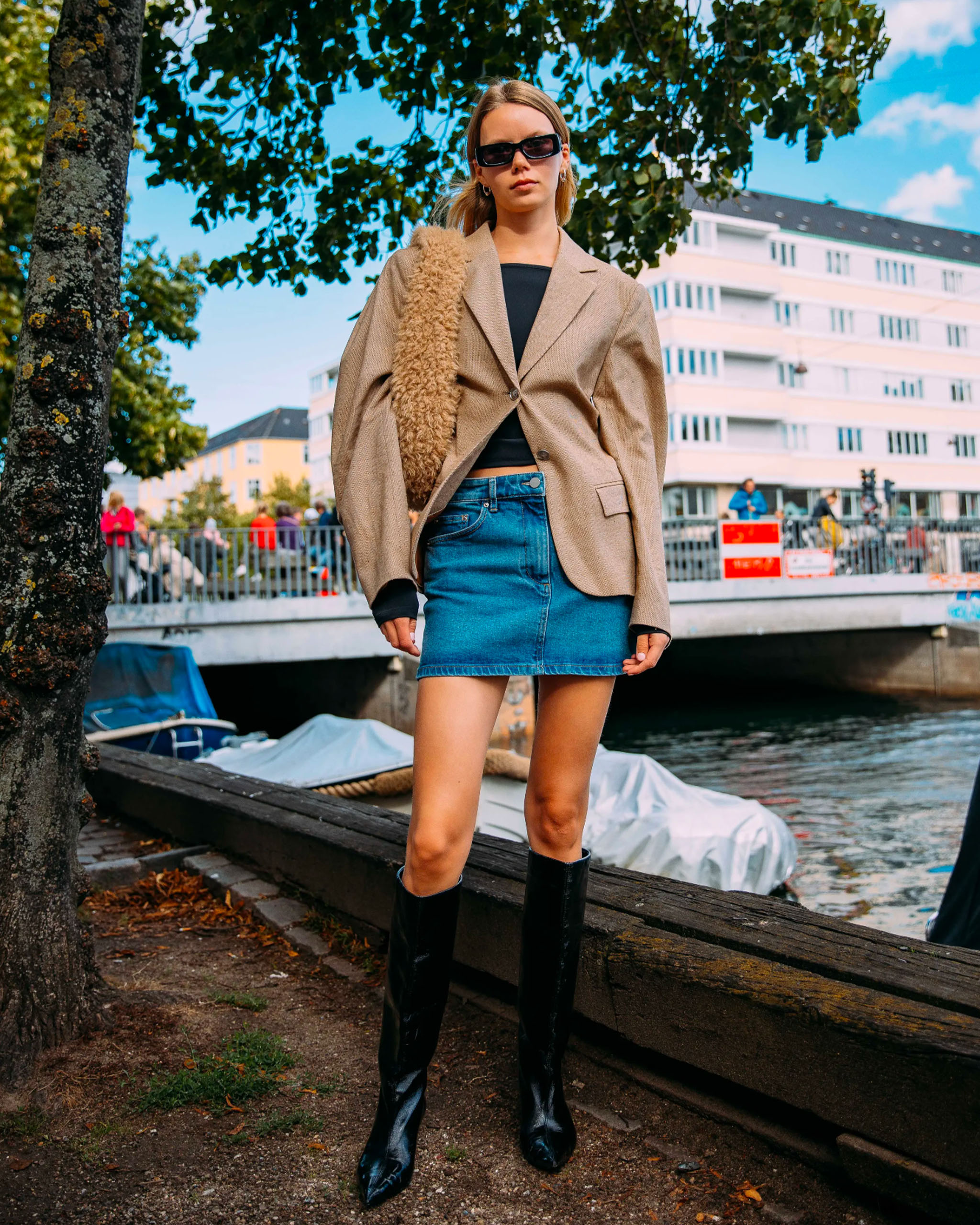 Not ready to let go of summer just yet? With this outfit combination, you don’t have to. Give your classic denim miniskirt another few weeks of wear when paired with knee-high riding boots (which are sure to maintain relevance well into fall). Add a proper autumn feeling to the look with a neutral blazer. Still feeling summer nostalgia? A pair of structured sunnies, such as Dior’s acetate sunglasses, are sure to make the season endless.