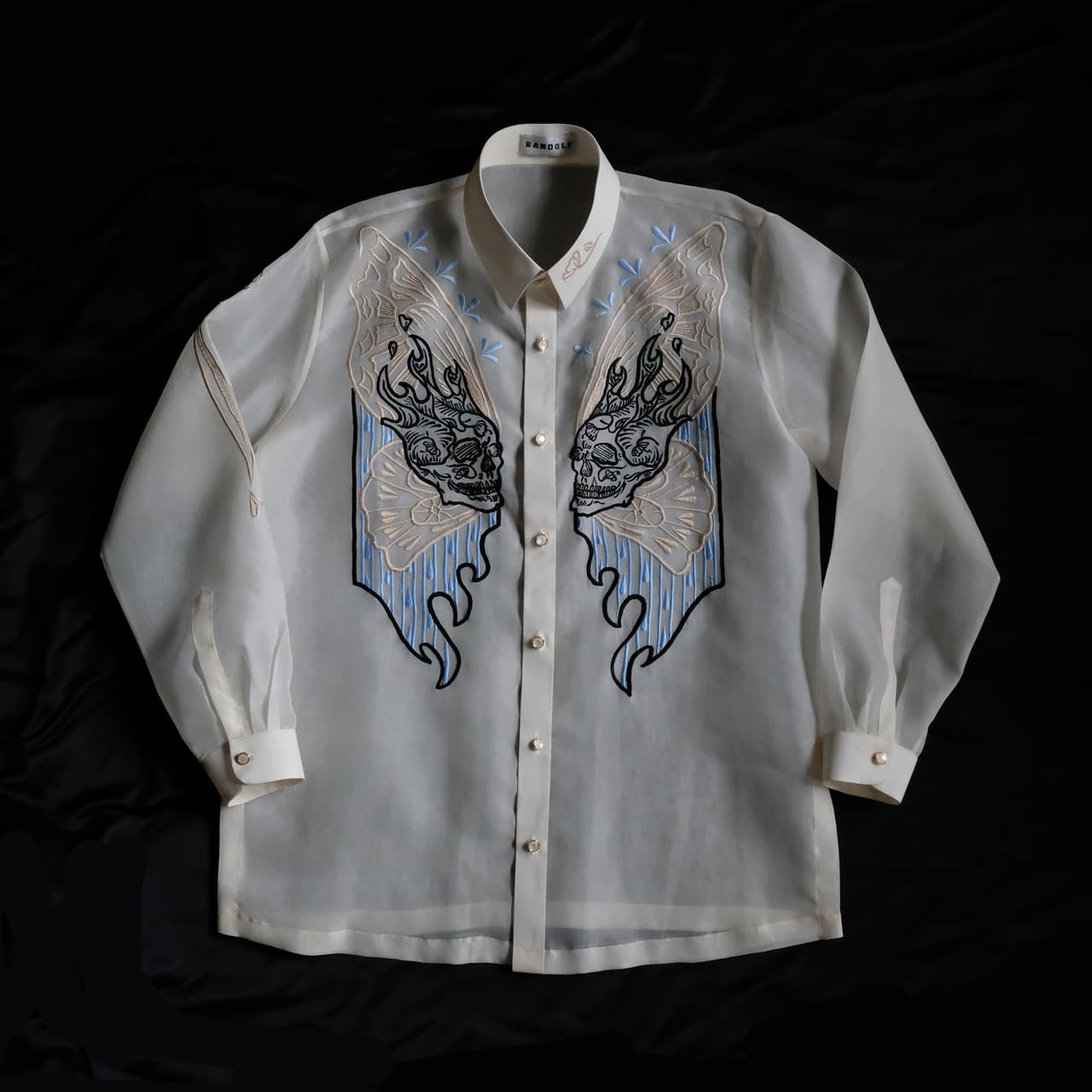 Embrace the whimsical, fun, and outrageous with Randolf‘s reinterpretation of the traditional barong. Inspired by pop cultural references (like a client’s favorite song), the label’s modern barongs are adorned with fiery skulls, hearts overflowing with roses, angels, and colorful roosters. Proving that a fresh perspective can resonate with barong-wearers and beyond, Randolf brings a custom touch to the traditional garb.