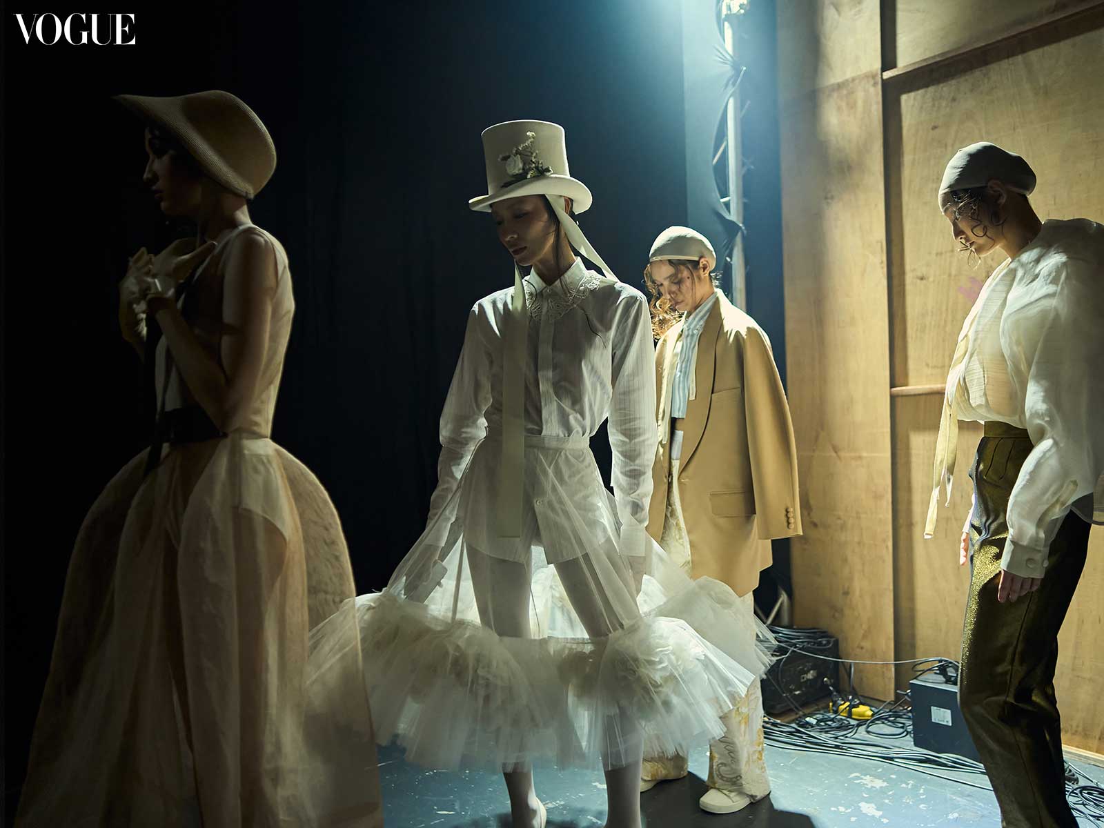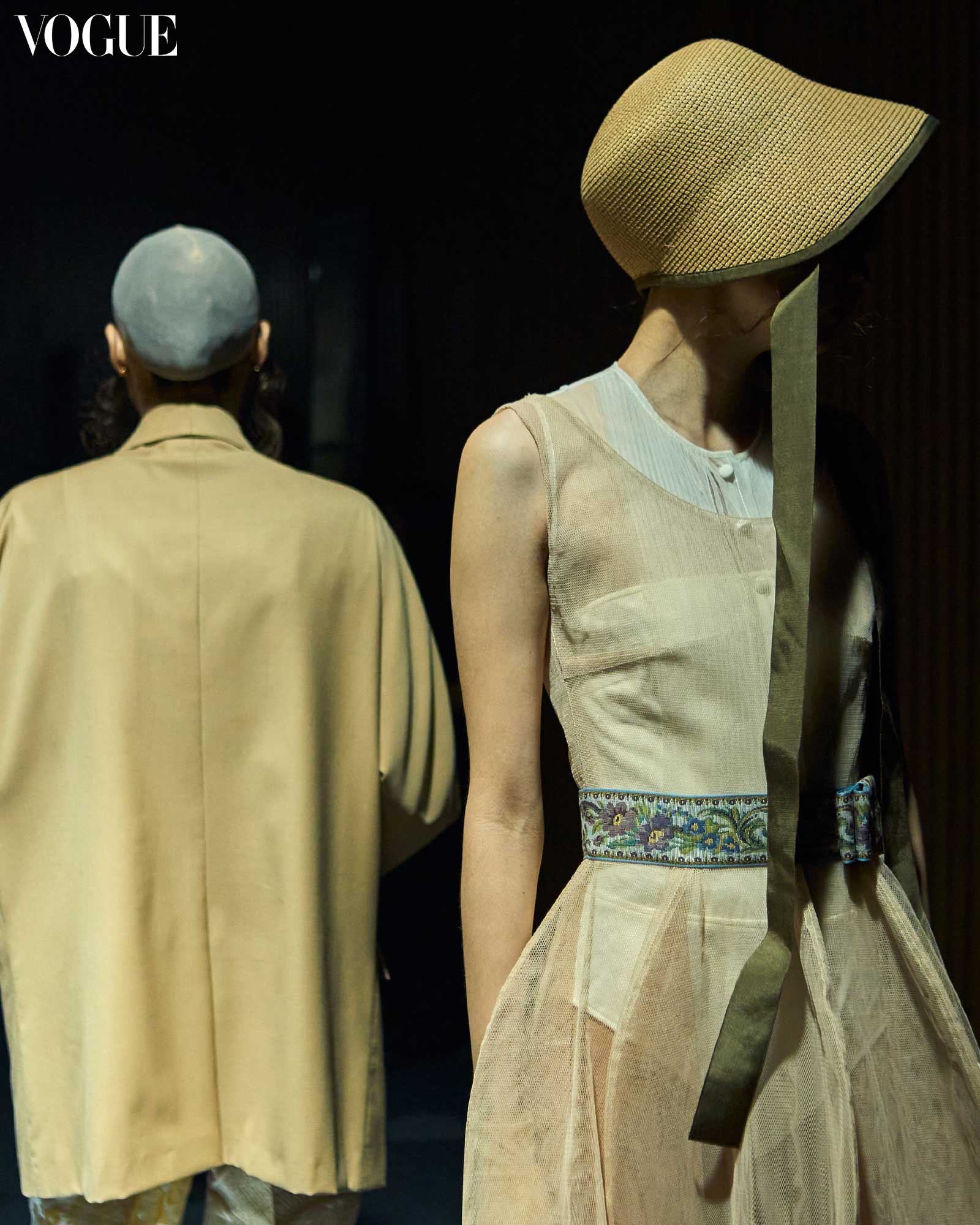Despite the number of layers, the garments both appear and feel light to the touch. This is a result of Joey’s selection of fabrics, with both sheer and translucent textiles that allow for each article of clothing to feel ventilated and breathable. “I know I’m working with very challenging silhouettes, I get that. But it’s just a matter of modifying the [fabric] or using the proper weaving technique. I’d like to think that I am quite successful, because these silhouettes are often very cumbersome and heavy, but I wanted my version to be light, airy, and dreamy which is a good contrast.” Apart from each garment’s fabrics and proportions, the show’s color palette also adds to the lightness of the entire collection. “If you notice it’s been the whites, beiges, cream, and camel, and a bit of texture with the metallic and the brocade,” Joey adds.