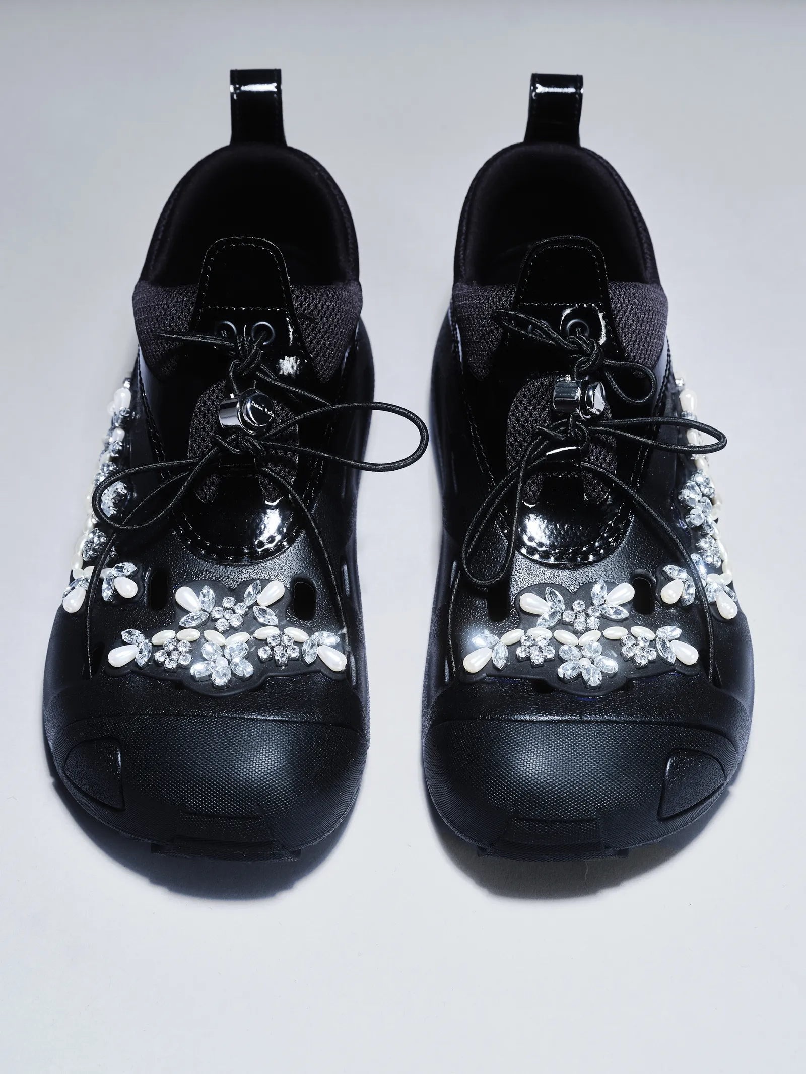 For those familiar with Rocha’s work – whimsical dresses, bedazzled details and romanticism aplenty – Simone Rocha X Crocs is exactly what you’d expect. Three core silhouettes, comprising the platform “Siren Clog” – which the designer has been wearing on repeat – the beloved “Classic Clog” and the #Gorpcore-esque “Quick Trails”, as styled with taffeta tracksuits on Rocha’s spring/summer 2024 runway, which will arrive in black, white, khaki and rose colourways, swathed in crystal and pearl embellishments. “I wanted to create a crossover from my world and theirs to create something otherworldly,” she says, as an avid Crocs champion. “I was introduced to them because my daughters wear them, and I’ve always worn them for gardening”.