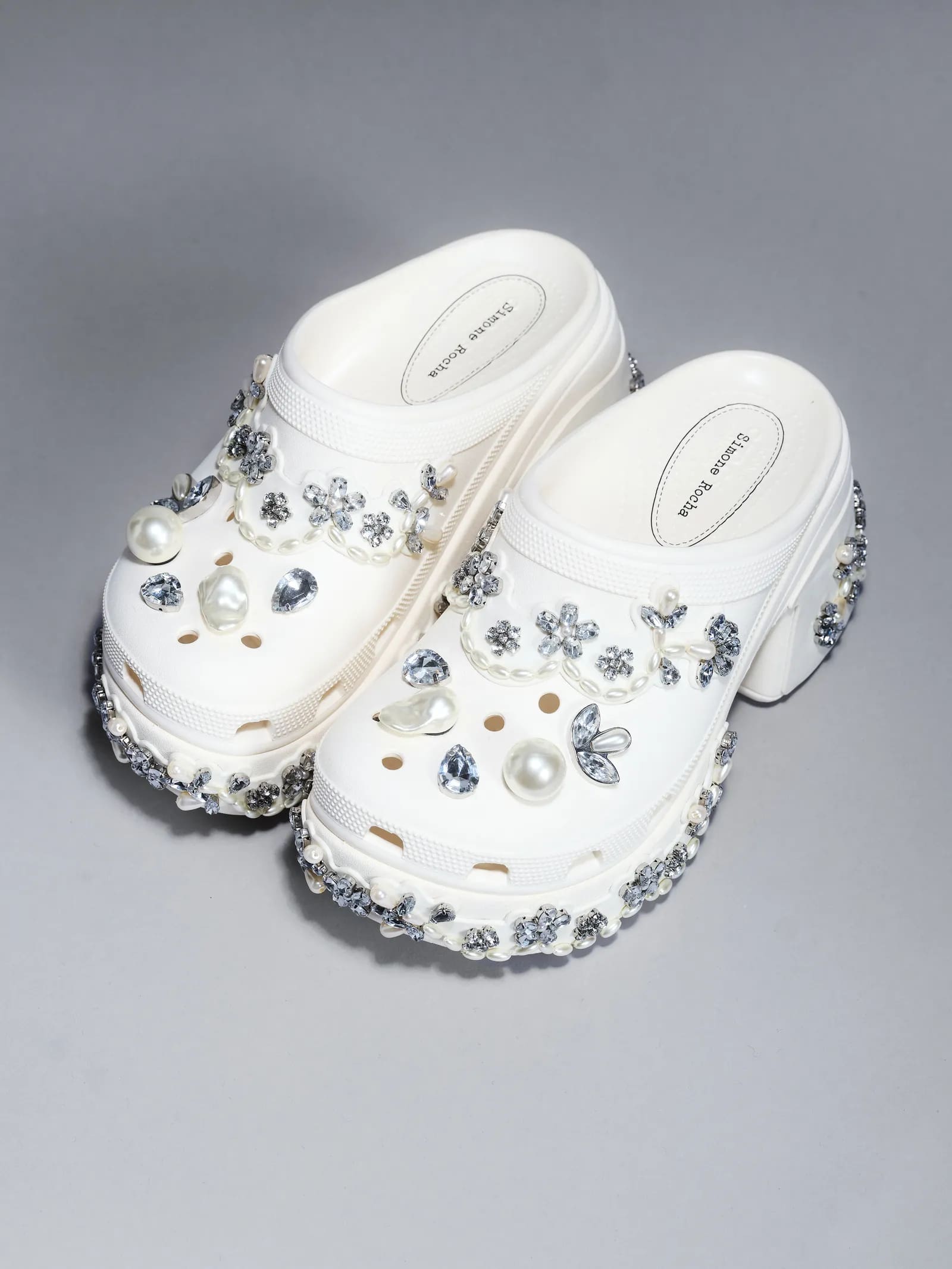 Crocs stocks its very own customisable adornments – known as “Jibbitz” – but Rocha’s designs feature another level of magpie details. See: the shimmering flowers and pearly strands inspired by wedding cake icing on the stacked Siren mules, or the gargantuan protruding pearls and teardrop crystals on the classic clogs, which are also complete with a logo-stamped pearl at the hinge of the heel-strap. (The unabashed maximalism echoes that of her Croc collab predecessor, Christopher Kane, who partnered with the brand for spring/summer 2017.)