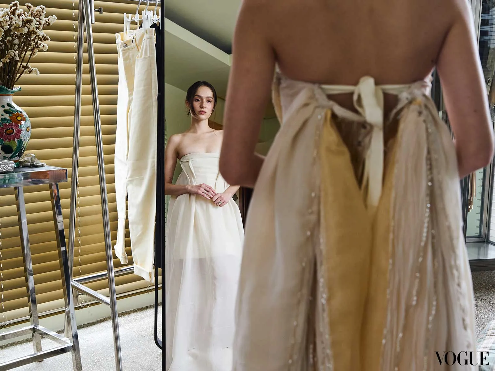 Sicat reworked a trouser silhouette she had begun developing for Christian “a year or a year and a half ago,” which became a modular, comfortable, yet striking piece. “He had seen them back then and said, ‘Let me know when you’re ready to perfect this. I’m into it.” For Siobhan, she imagined her in something “drunk, like Kate Moss,” as the bride self-proclaimed. “That phrase ended up living on the mood board,” Isabel confessed. “We all knew exactly what it meant.”