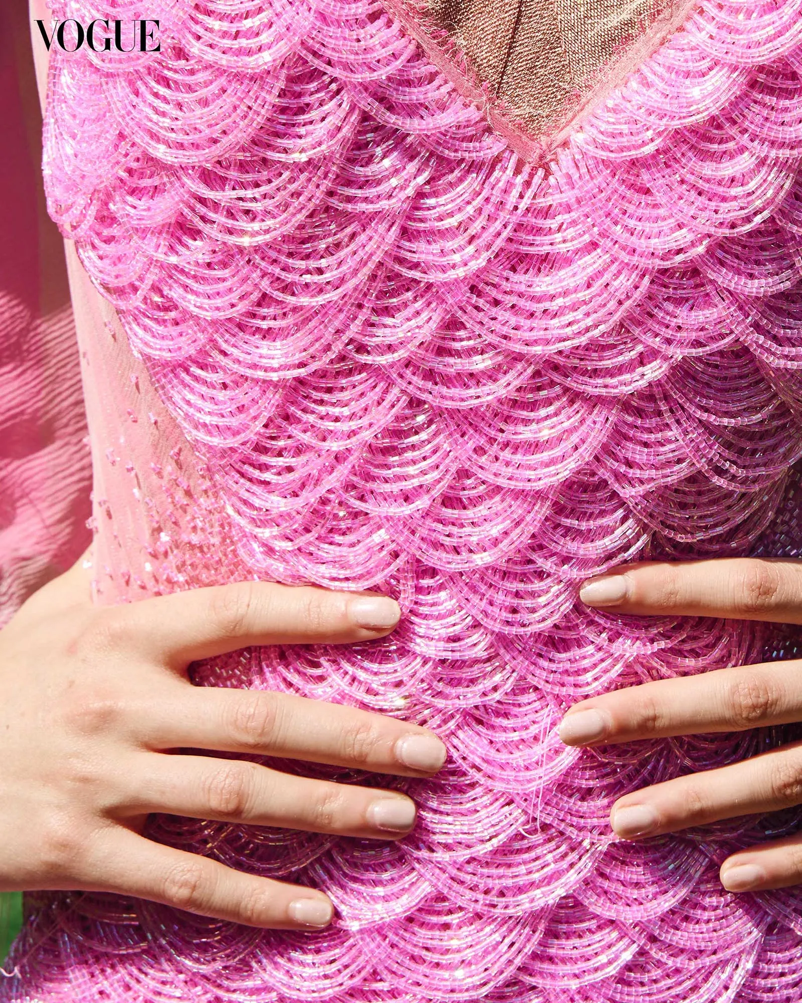 He designed a pink, bias-cut gown evoking the allure of a 1930s silver screen siren. Embroidered with scale-like iridescent glass beads, the design plays against the luminous textures of the silk lamé and mousseline like a mermaid’s tail. “The golden lamé glimmers beneath the changeant mousseline, while the glass beads sparkle in candlelight or flash photography,” he explains.