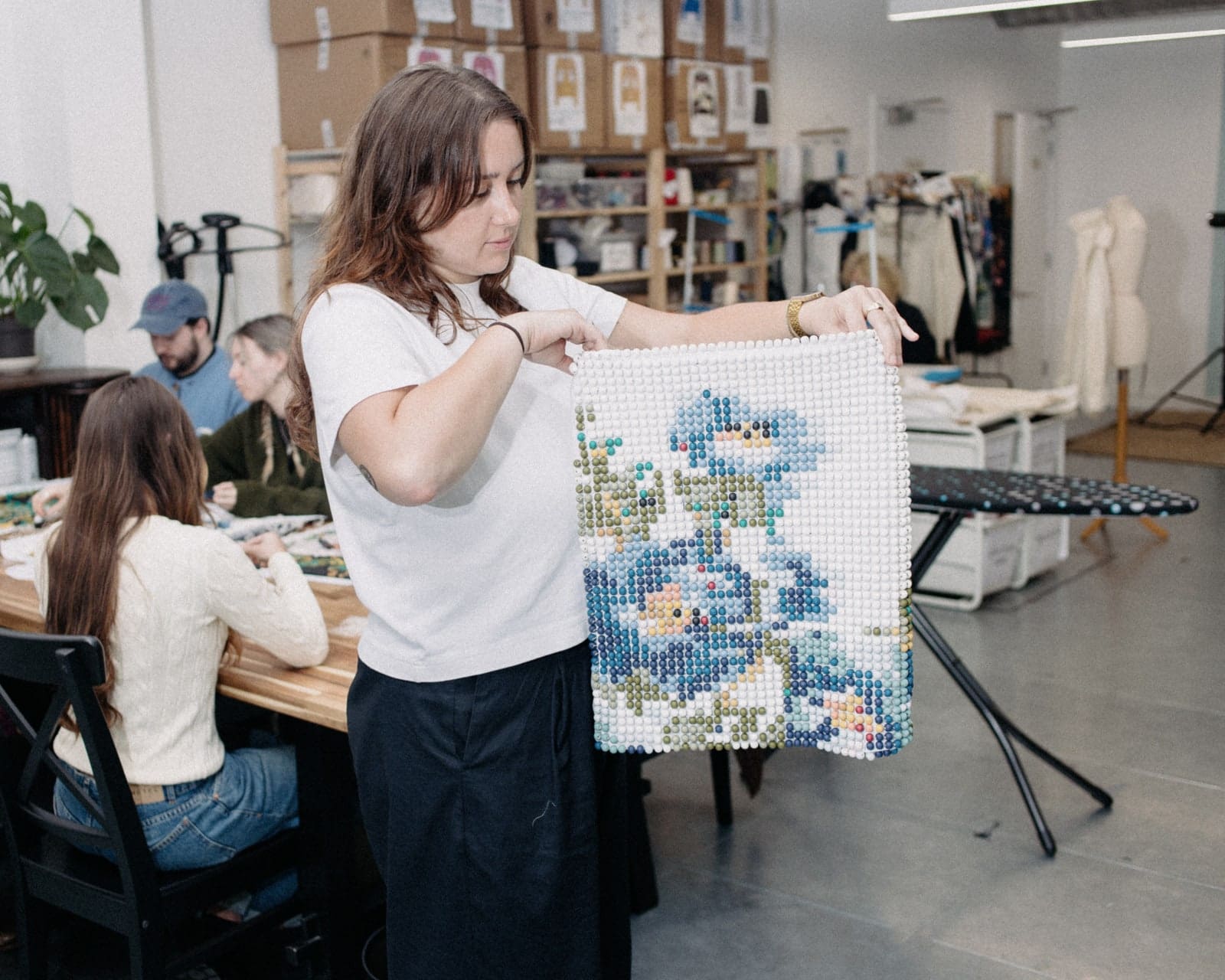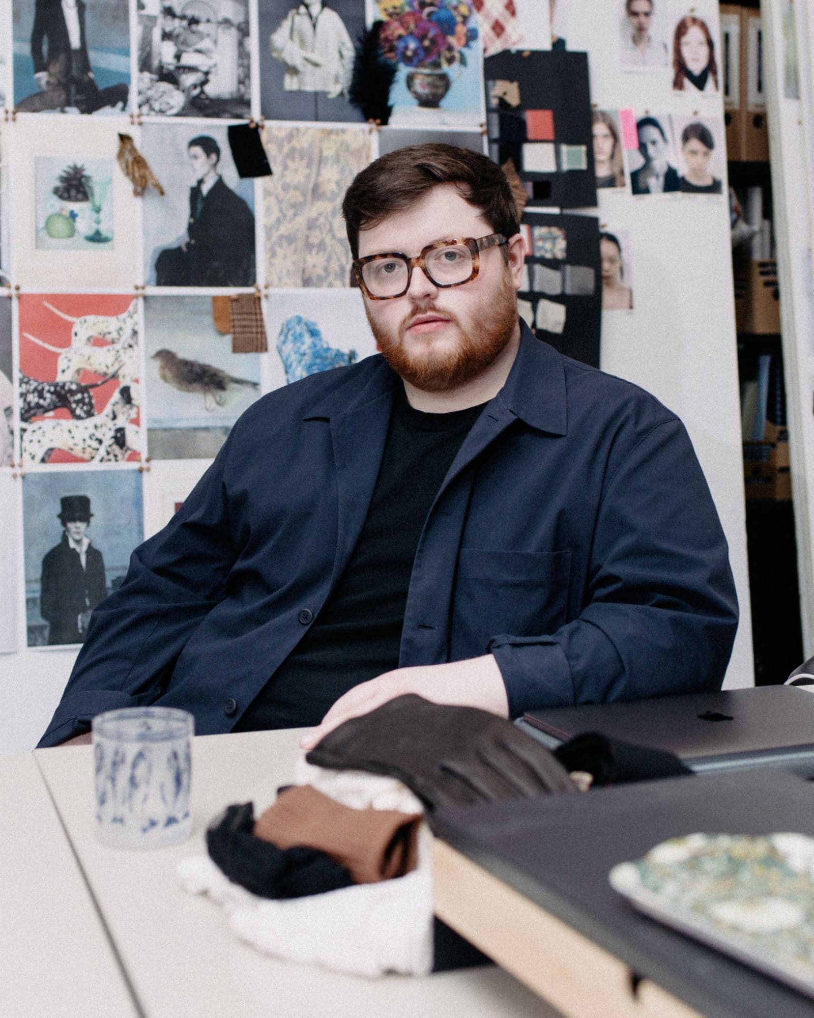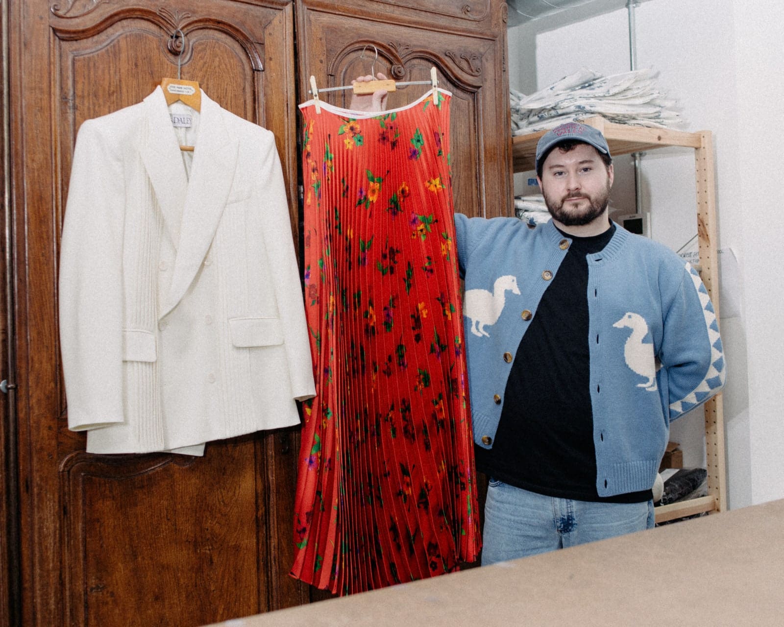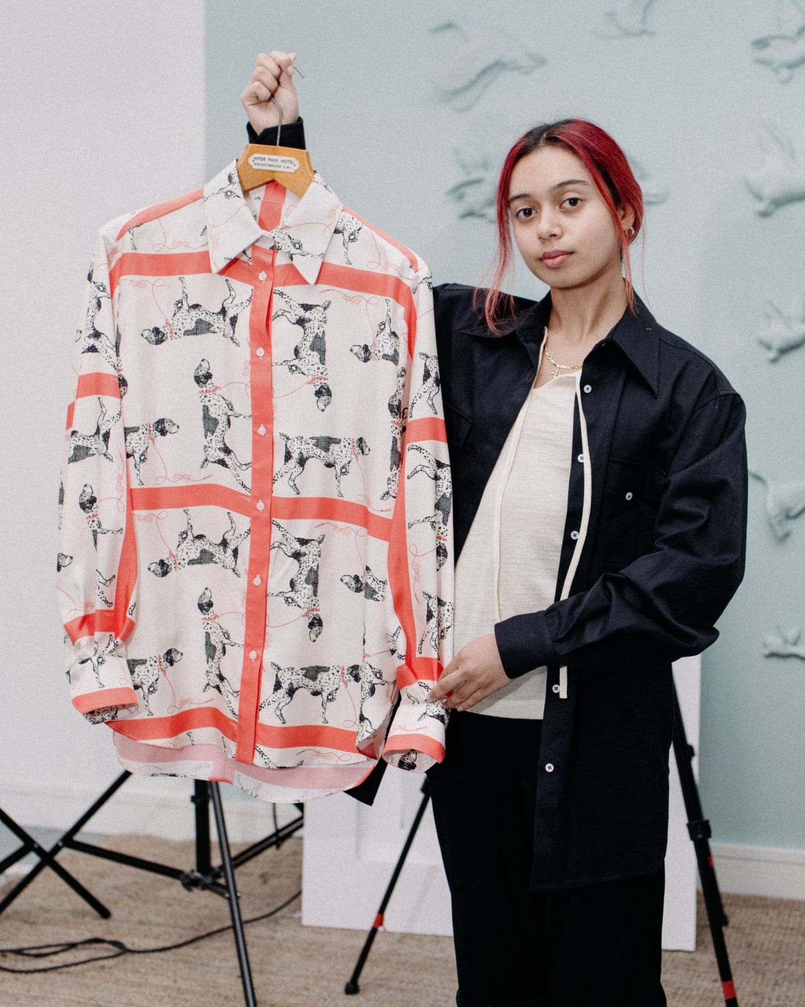Before Gluck’s death in 1978, the creative donated some 70 garments belonging to past lovers—and just one piece of their own androgynous uniform–to the Brighton Museum. These, along with Gluck’s paintings of flowers arranged by Spry, and the quintessential doilies and tablecloths found in tea rooms (Gluck was a descendant of the Lyons family), formed the basis of Stokey-Daley’s latest work. His colourful, abstract suits and painstakingly beaded tops are, in fact, Gluck’s signature bouquets blown up to look like pixelated cross-stitch patterns, while the dog-printed silk blouses were born from a picture donated by one of the archivists Stokey-Daley befriended for the project. How could he say no to a Dalmatian? “We always have points of humour and levity and so, it’s a take on this,” he explains of infusing functional pieces with charm, individuality and, yes, pets.