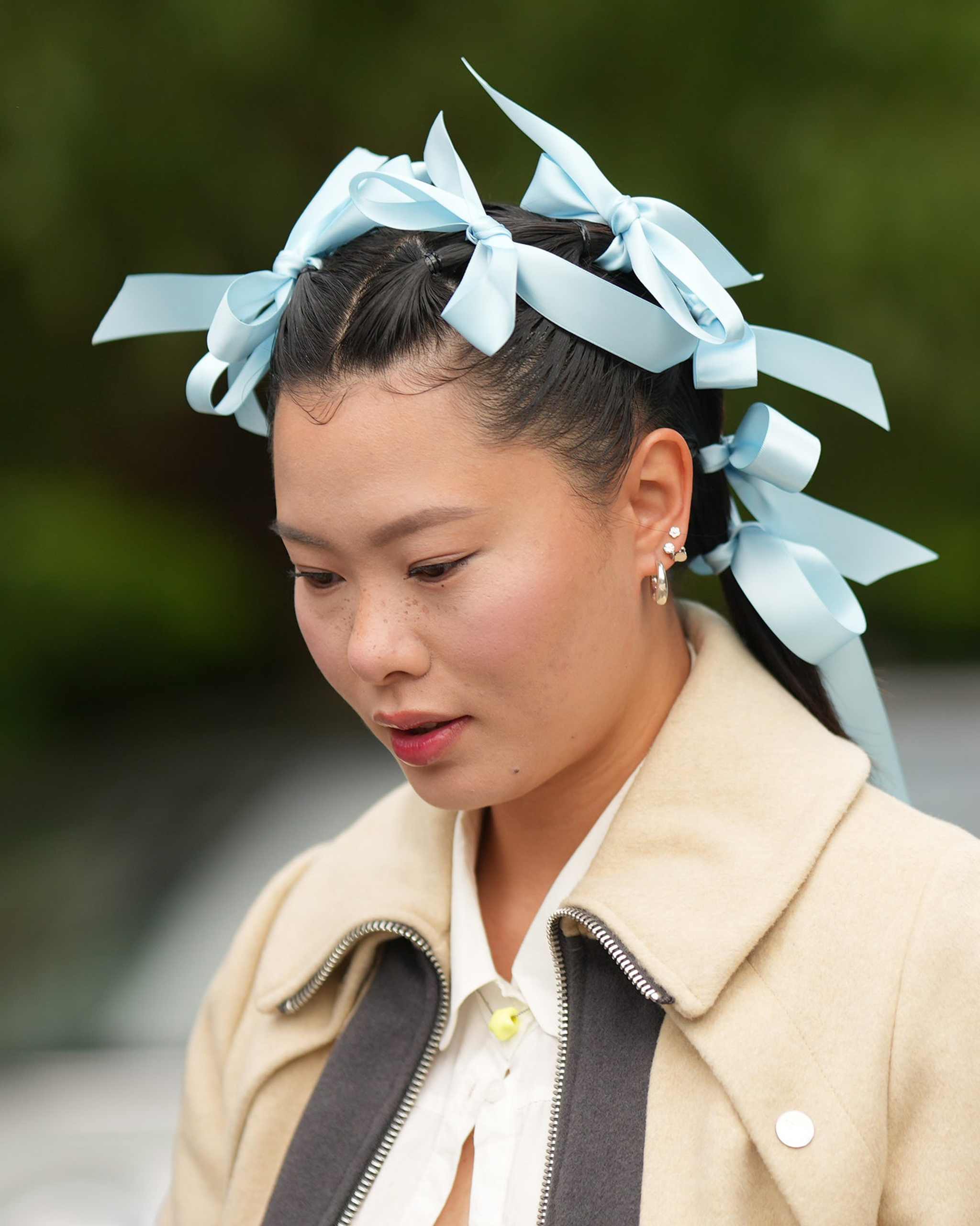 Whether satin, velvet, or grosgrain (a favorite of Sarah Jessica Parker), the beauty of this trend is the ribbon doesn’t have to be a decadent hair accessory to tied into a perfect miniature bow—be it something you just found lying around the house, tore off the hem of a dress, or bought from the fabric store, it’s open to interpretation.