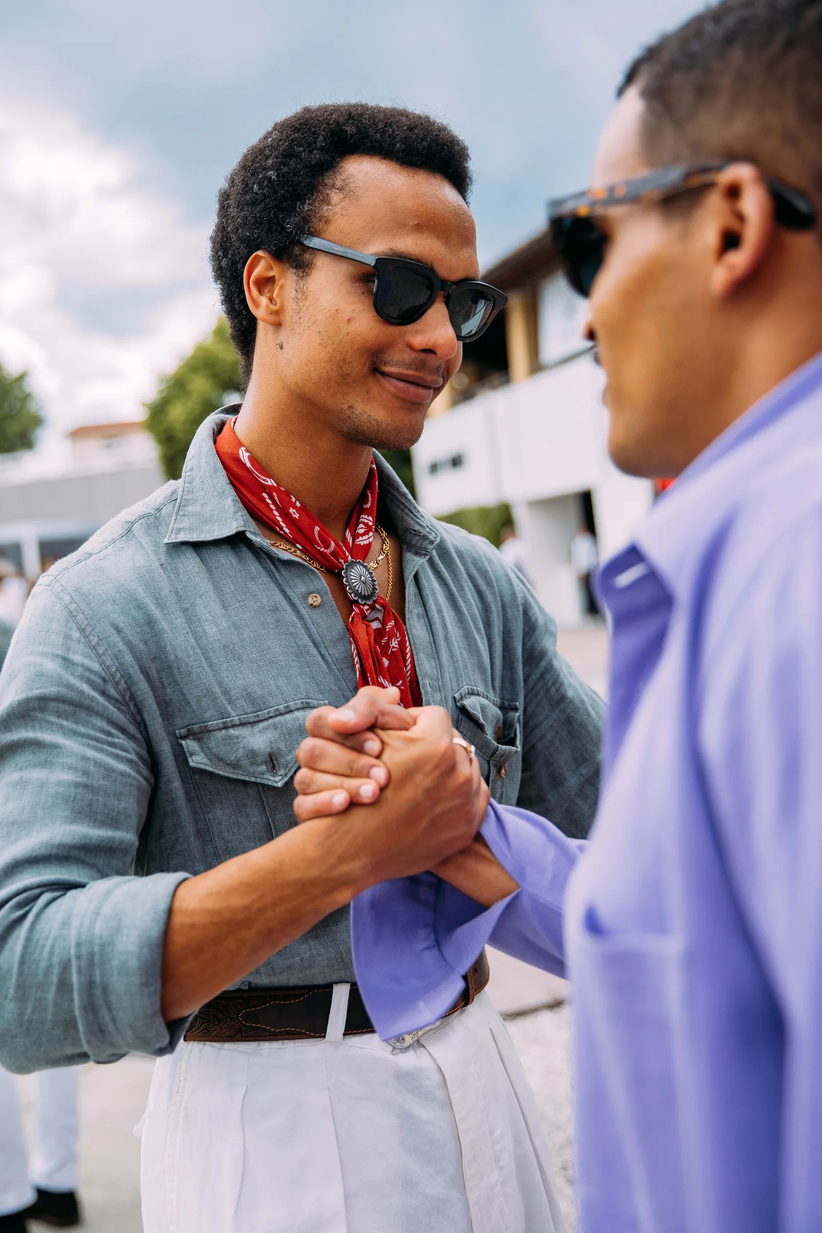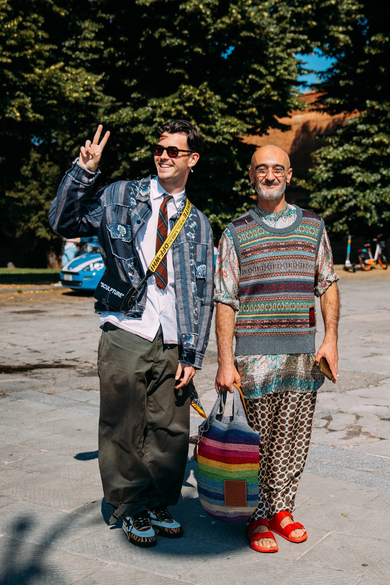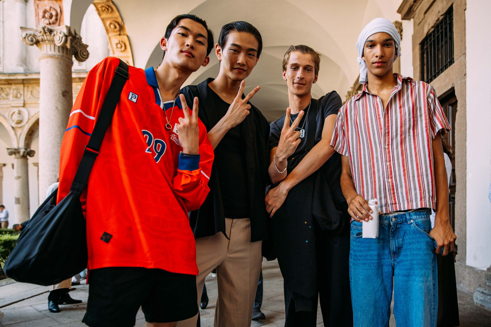 The best way to beat the heat and avoid sunburn is with a bandana tied around your neck. Milan, spring 2024 menswear Photographed by Acielle / Style Du Monde