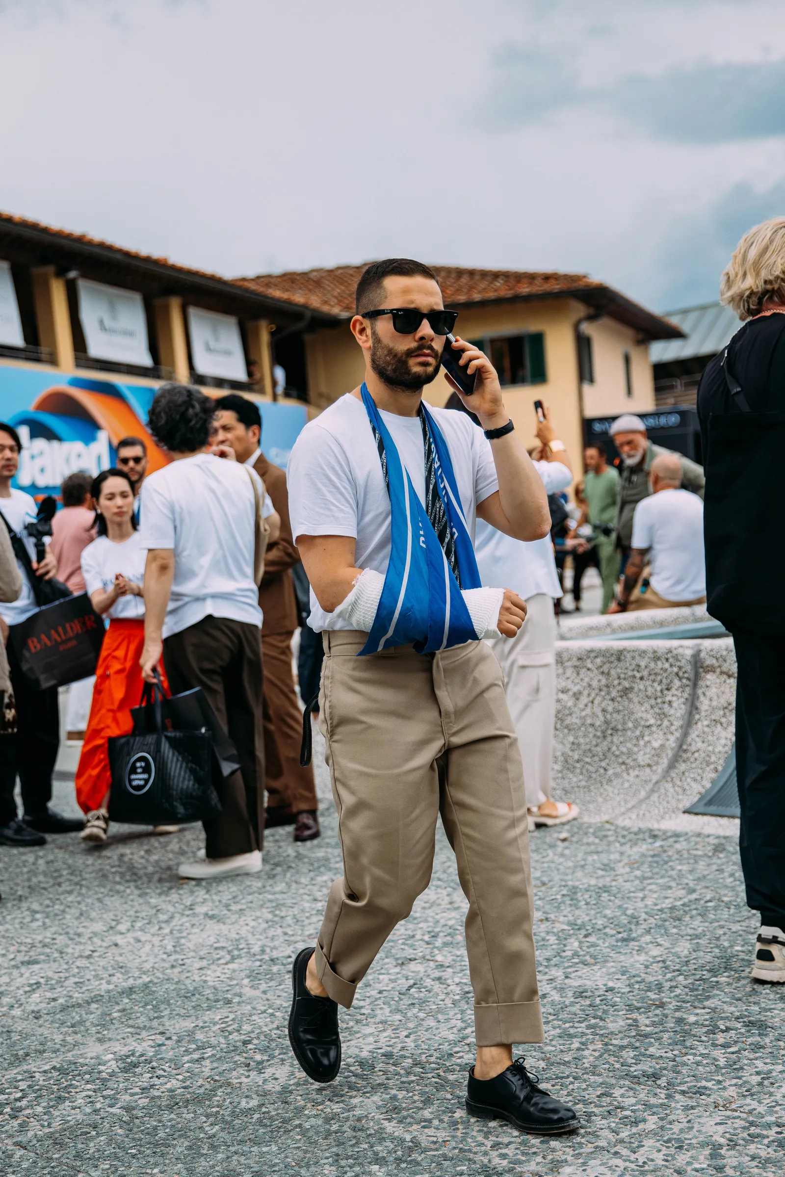 In Florence, a Pitti Uomo fair-goer added an unexpected twist to his outfit, utilizing a bandana as an arm sling. Florence, spring 2024 menswear Photographed by Acielle / StyleDuMonde