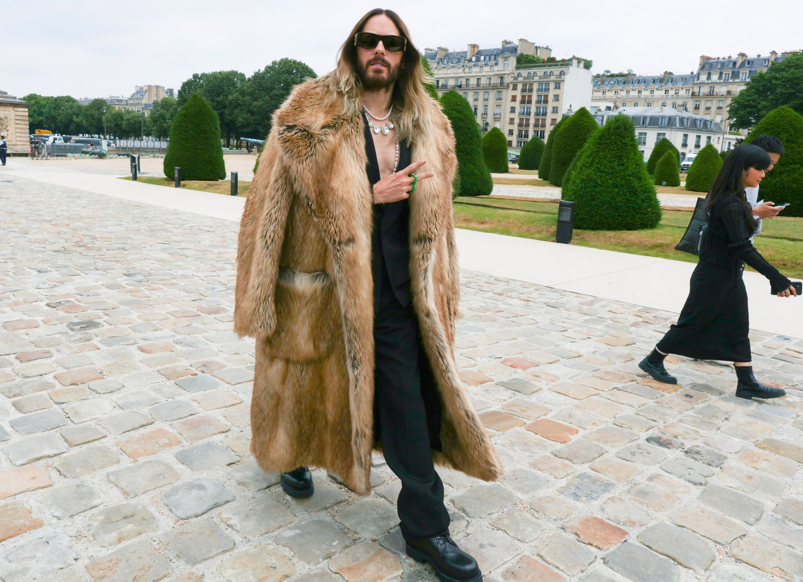 Jared Leto’s bare chest and pearl necklace combo is elevated by an opulent (faux?) fur coat. Paris, spring 2024 menswear Photographed by Phil Oh