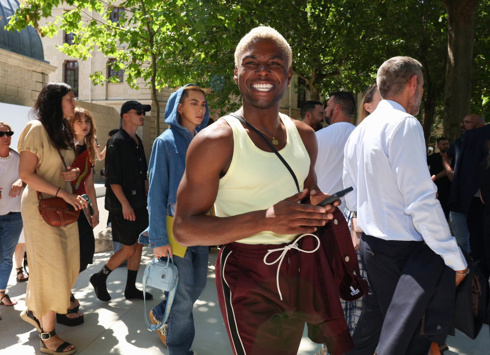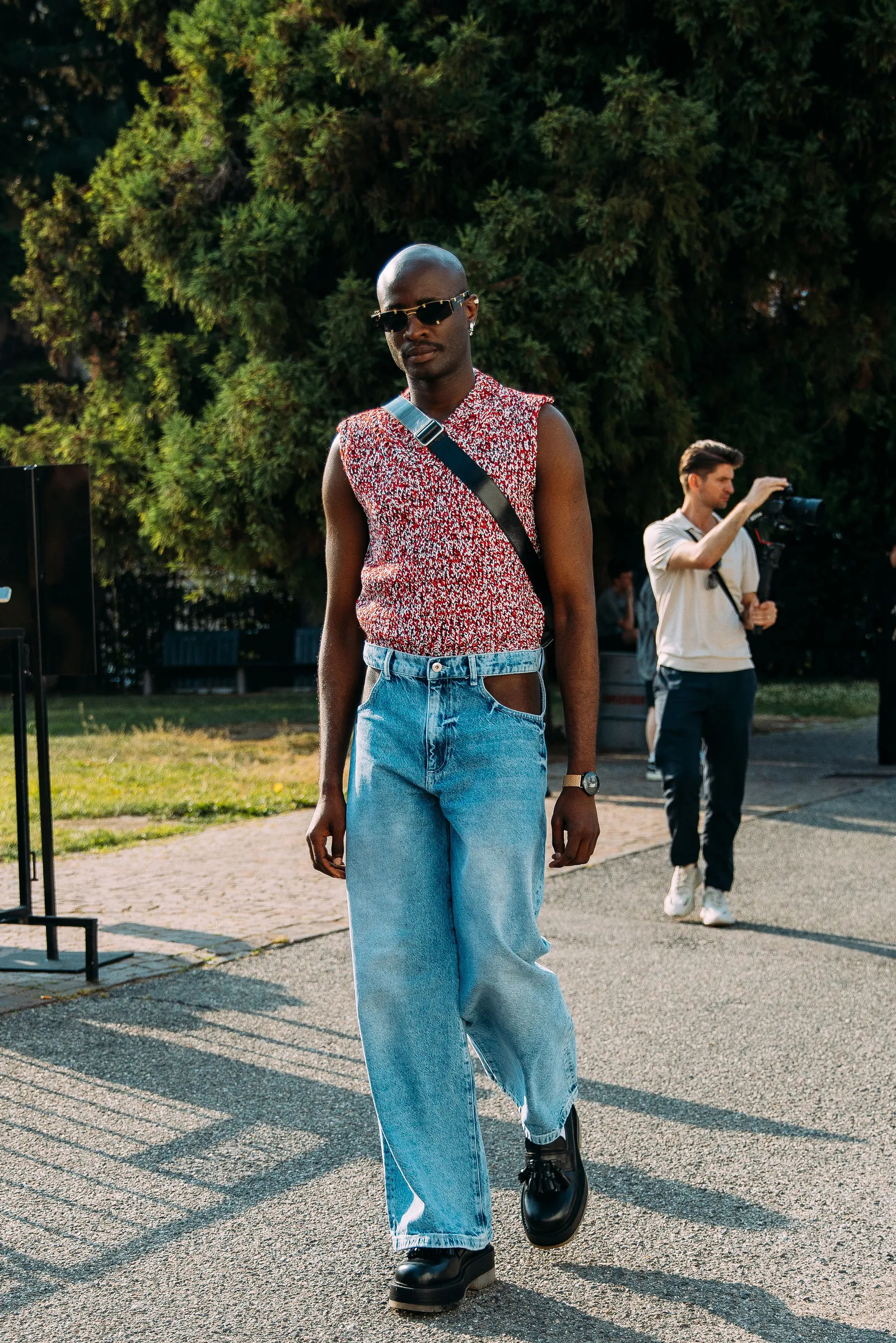 At the Wales Bonner show, a street styler showcased a winning summer look that combined a knit tank and jeans. Paris, spring 2024 menswear Photographed by Phil Oh