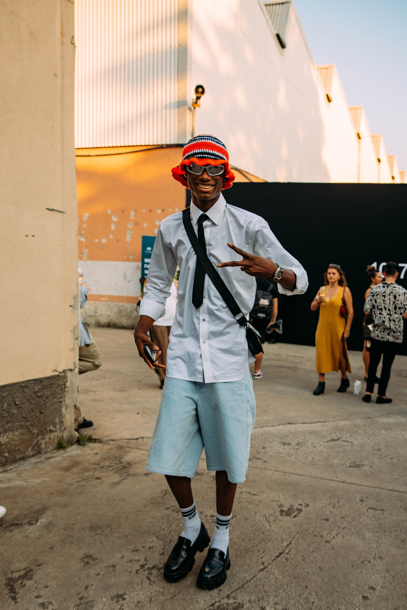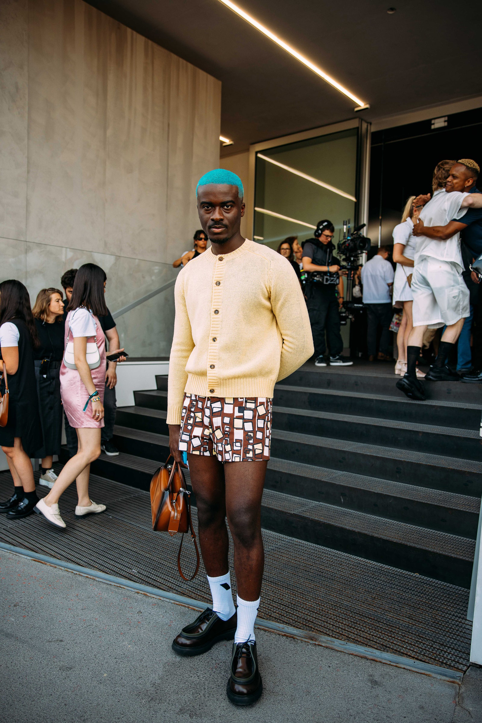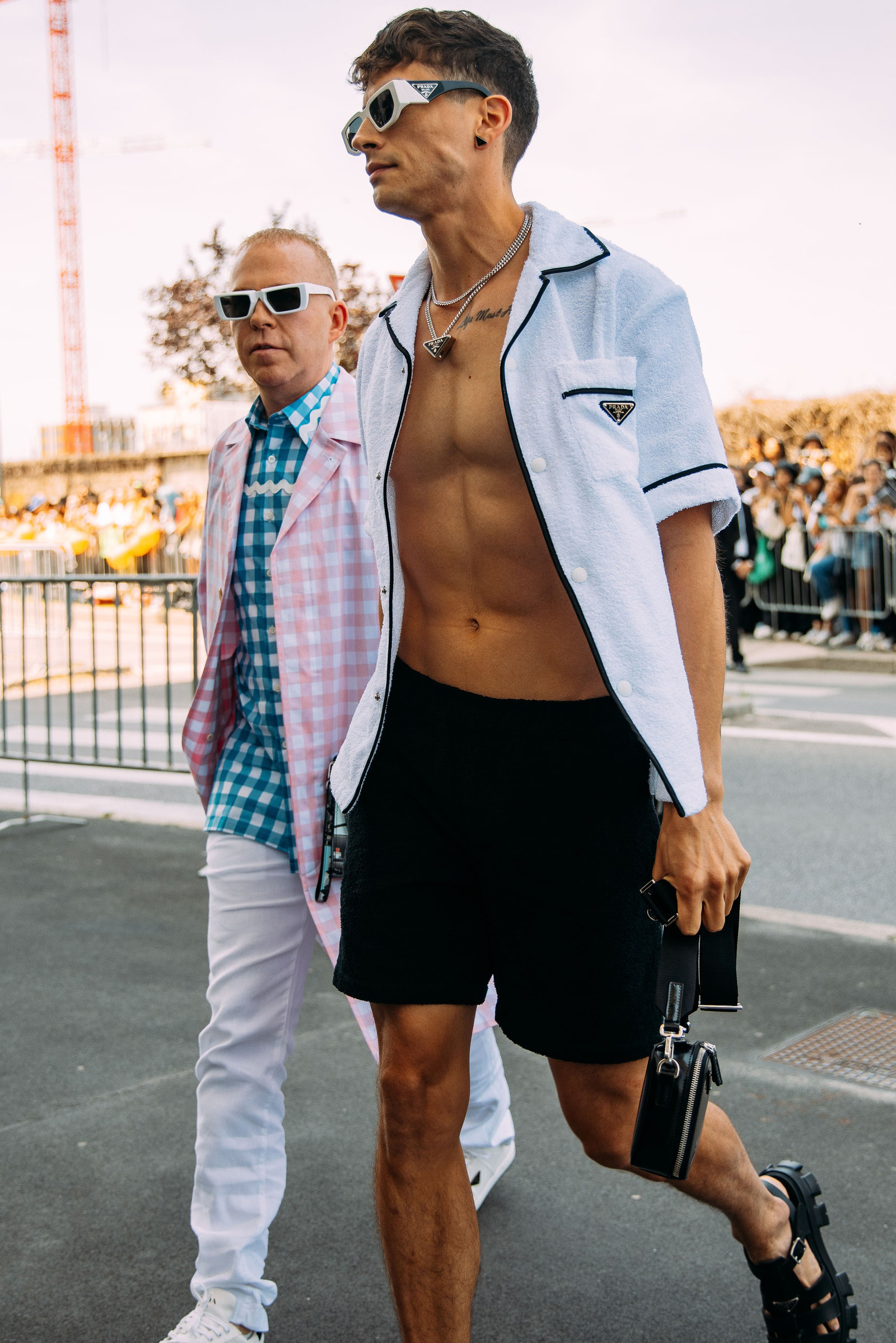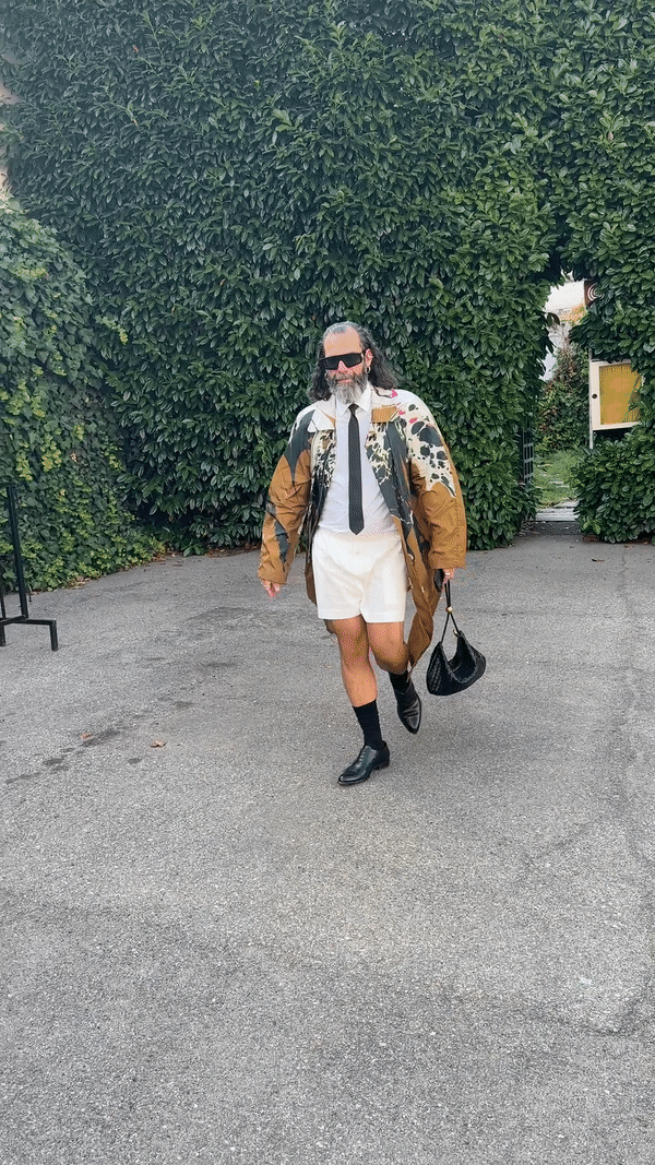 Prada was blazing hot inside and outside the show. Show-goers were spotted in unbuttoned camp shirts and the shortest of shorts. Milan, spring 2024 menswear Photographed by Acielle / Style Du Monde