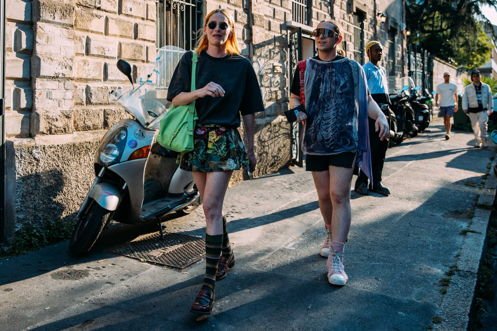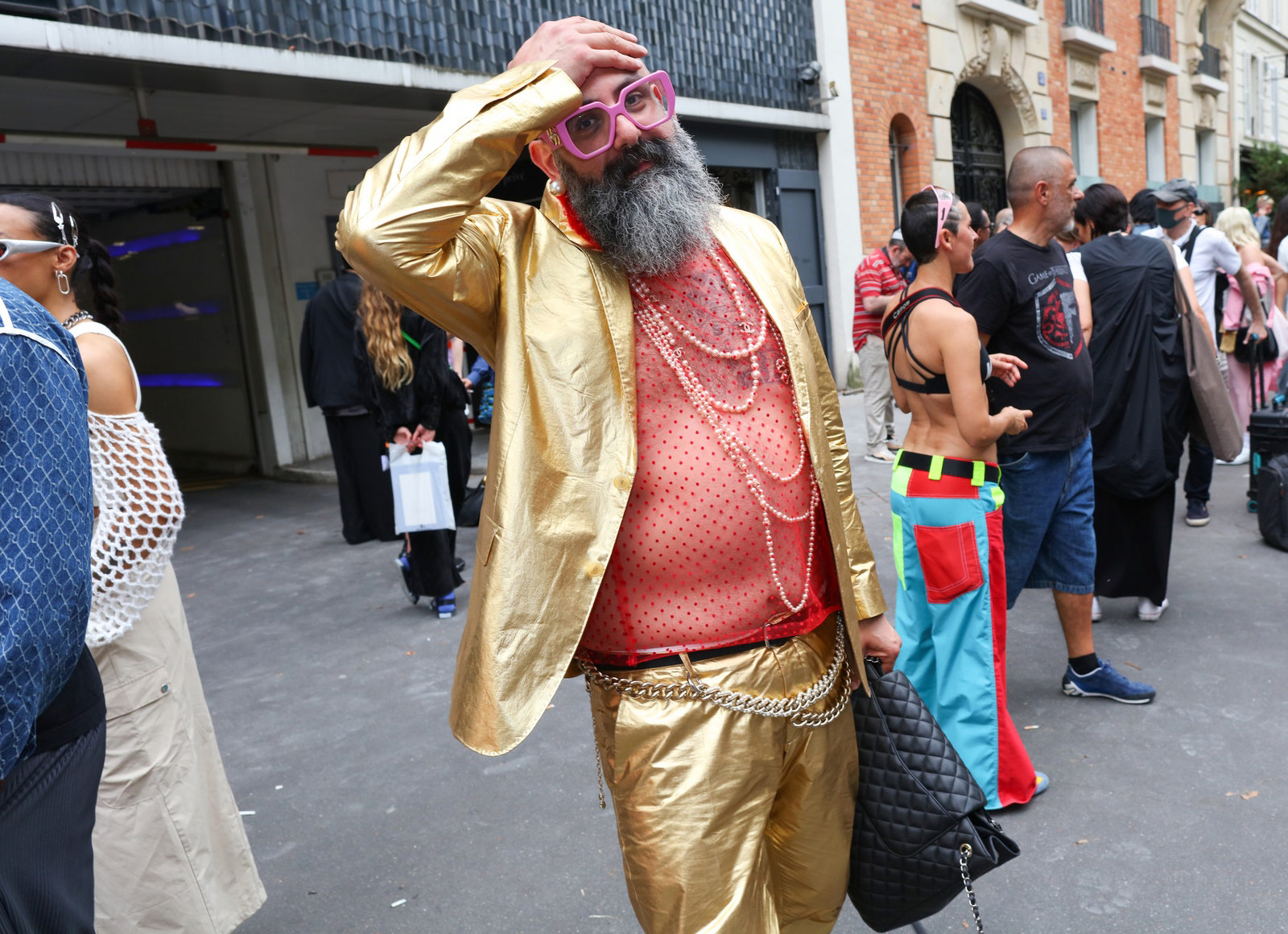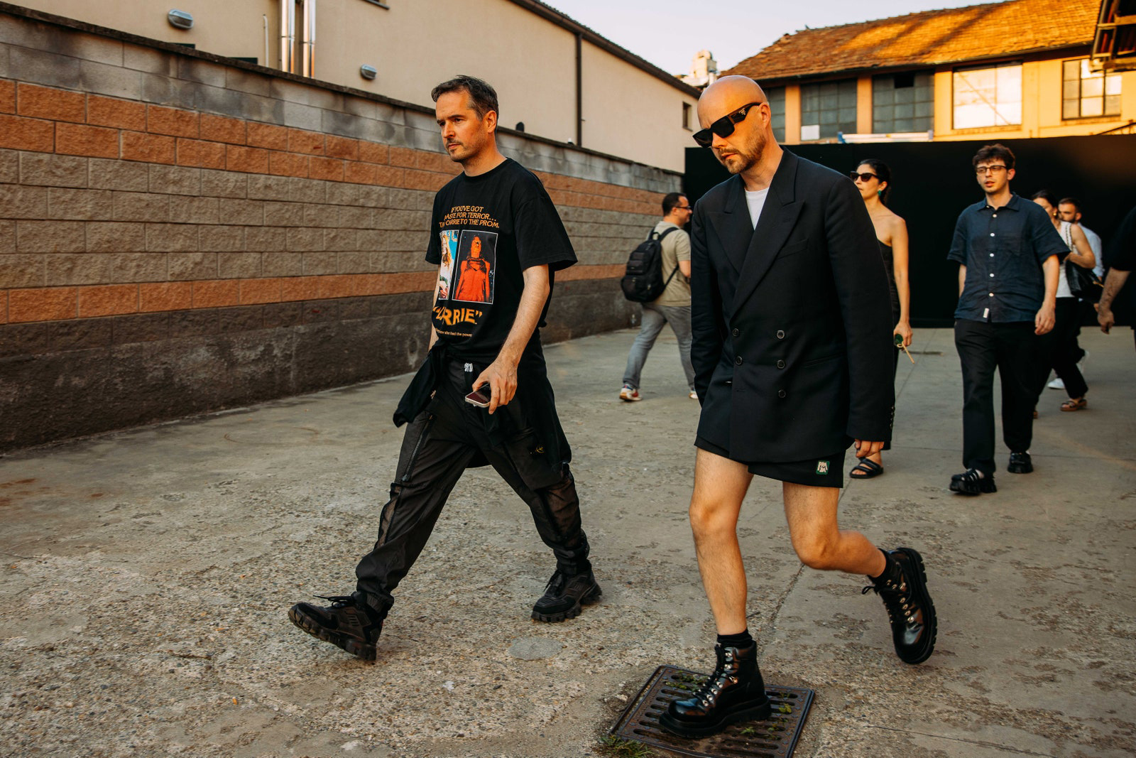 Prada was blazing hot inside and outside the show. Show-goers were spotted in unbuttoned camp shirts and the shortest of shorts. Milan, spring 2024 menswear Photographed by Acielle / Style Du Monde