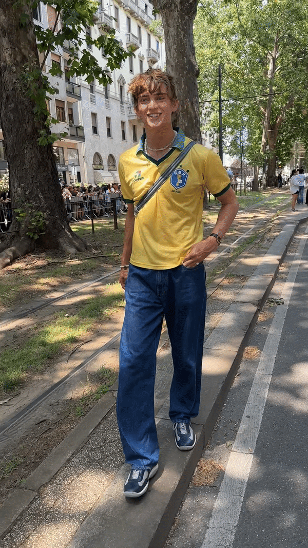 …In Milan, street stylers repped their favorite designer rather than their sports team. Milan, spring 2024 menswear Photographed by Acielle / Style Du Monde