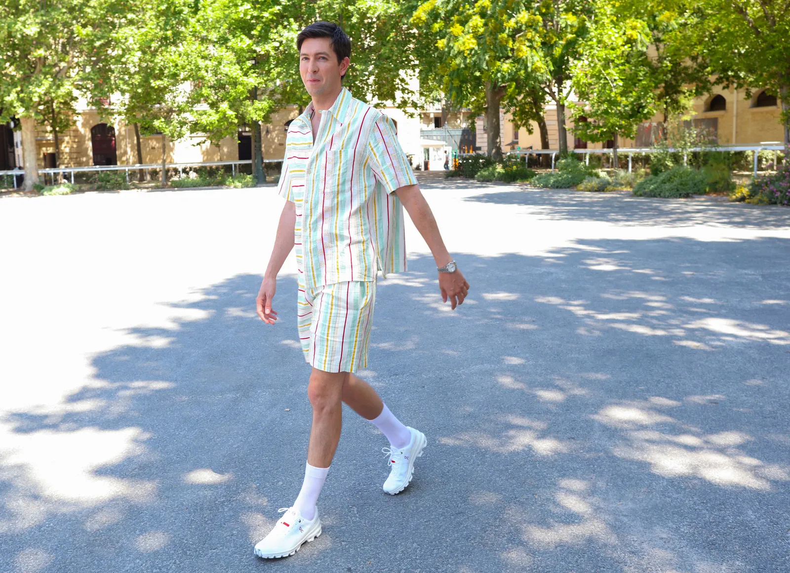 The easiest fashion week outfit is a matching set, as proven by Succession’s Nicholas Braun at the Loewe show. (A pair of finance bro-favorite On Cloud sneakers add a finishing touch.) Paris, spring 2024 menswear Photographed by Phil Oh