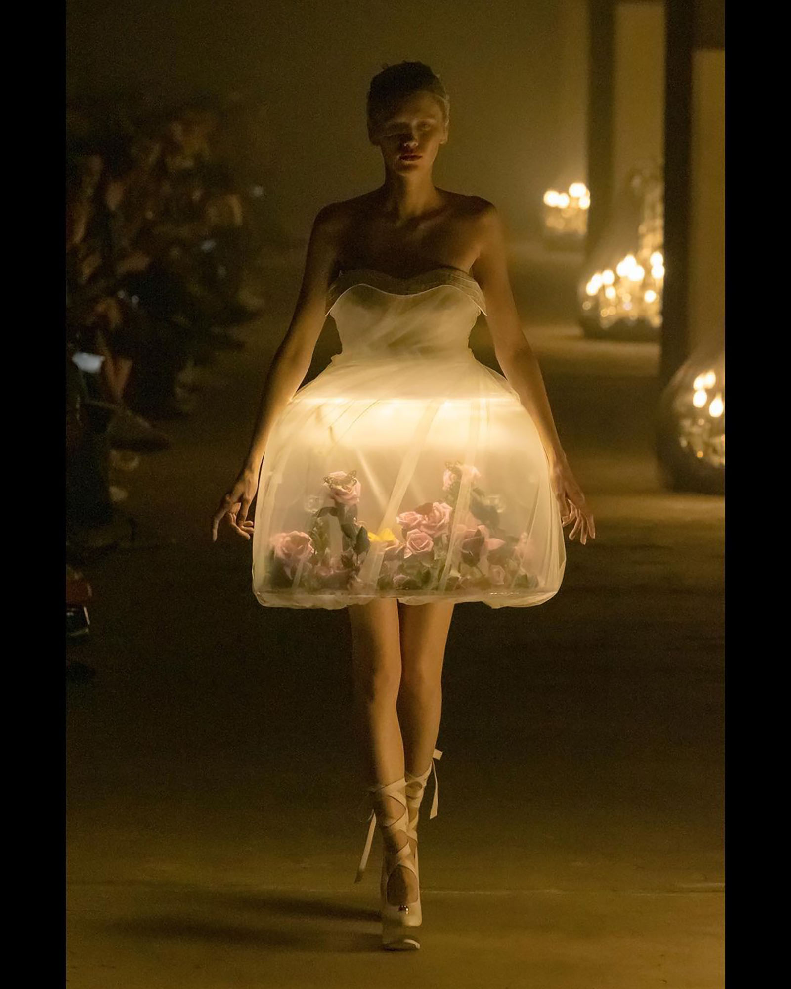 Attendees were in for a surprise with Undercover’s spring/summer 2024 runway show. When the lights dimmed, the tulle-covered chandelier in the middle of the runway lit up, and three models emerged from the darkness wearing glowing terrarium dresses. From a distance, the light emanating from the strapless dresses’ skirts seemed to be image projections — until you get a closer look and see the butterflies moving inside it.