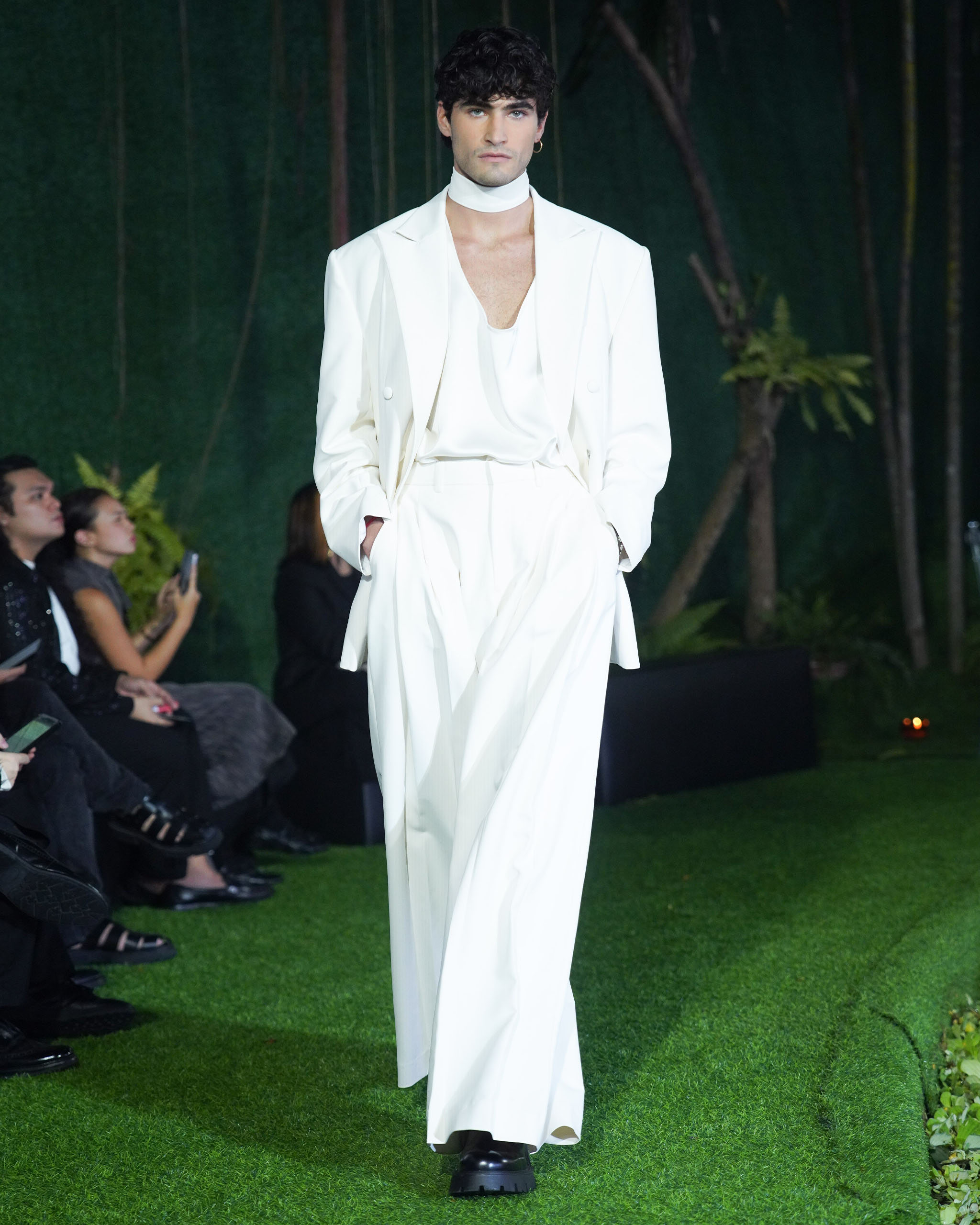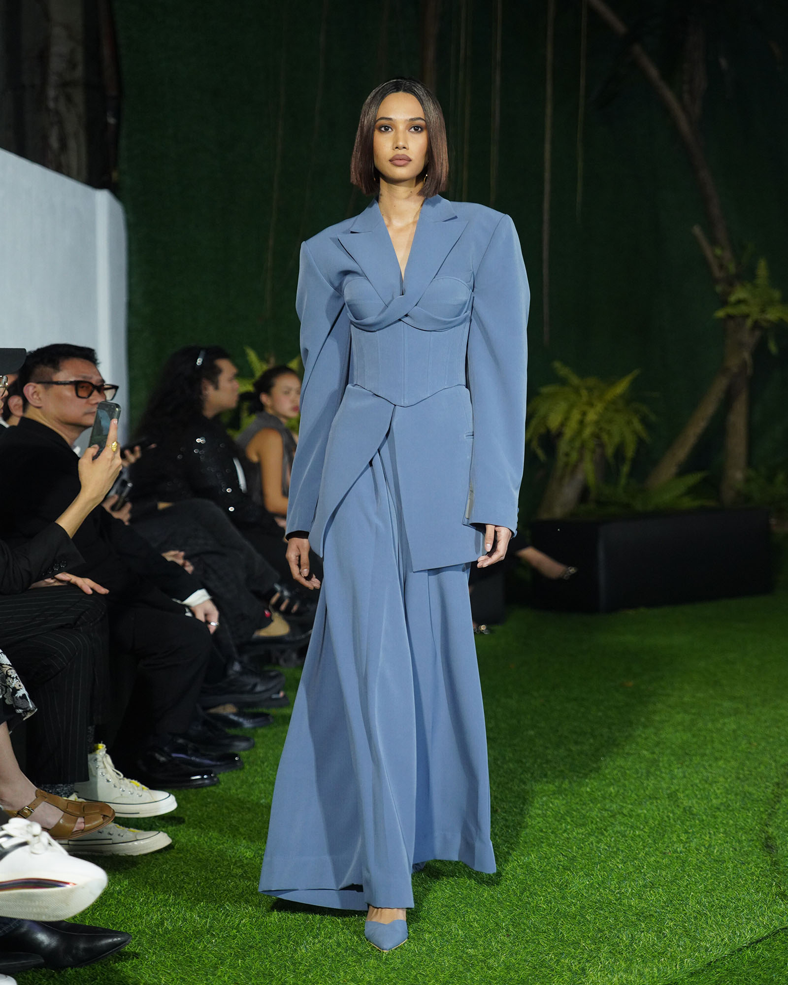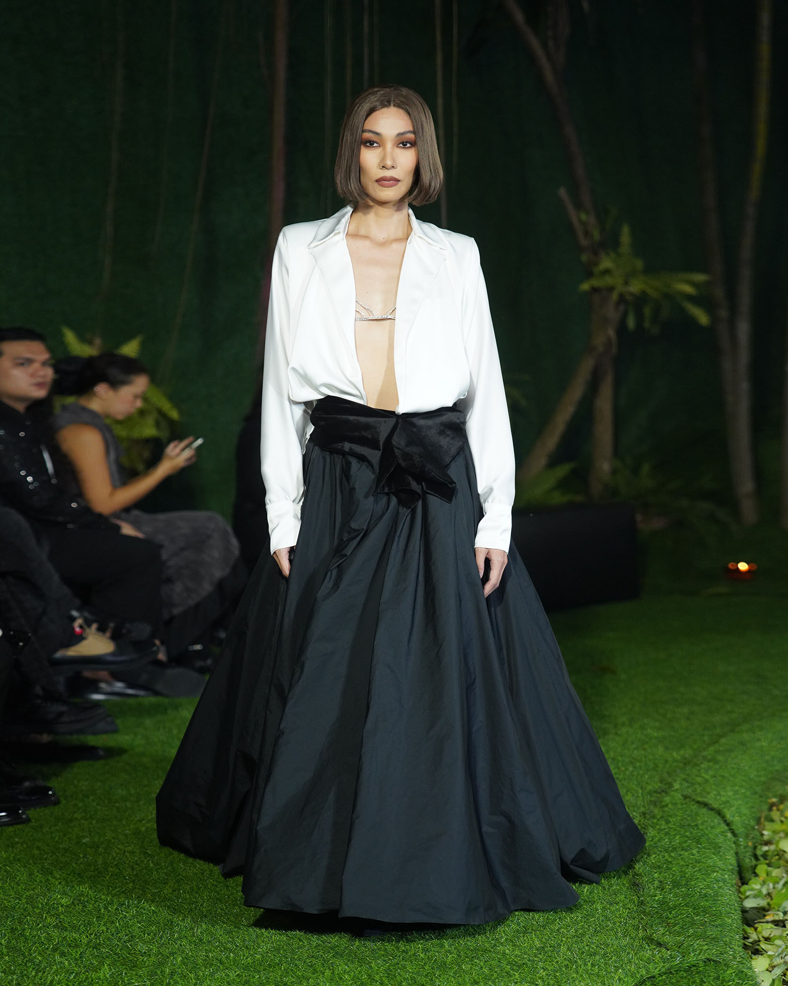 Titled Symphony of Feelings, Anthony’s Spring/Summer 2024 collection is a coalescence of his 15 years in the industry. Known for form-fitting ornamented gowns—one of which was worn by maiden issue cover star Chloe Magno to the Vogue Philippines launch gala—this 30-look assemblage was a renewed point of view of the designer’s signatures. “In this collection, ang challenge ko is to control my style.” [In this collection, my challenge is to control my style.”] He focused on translating a flurry of emotions and ideas into a contemporary point of view, all while maintaining the integrity of his brand, which favors embellishments and sensual cuts.