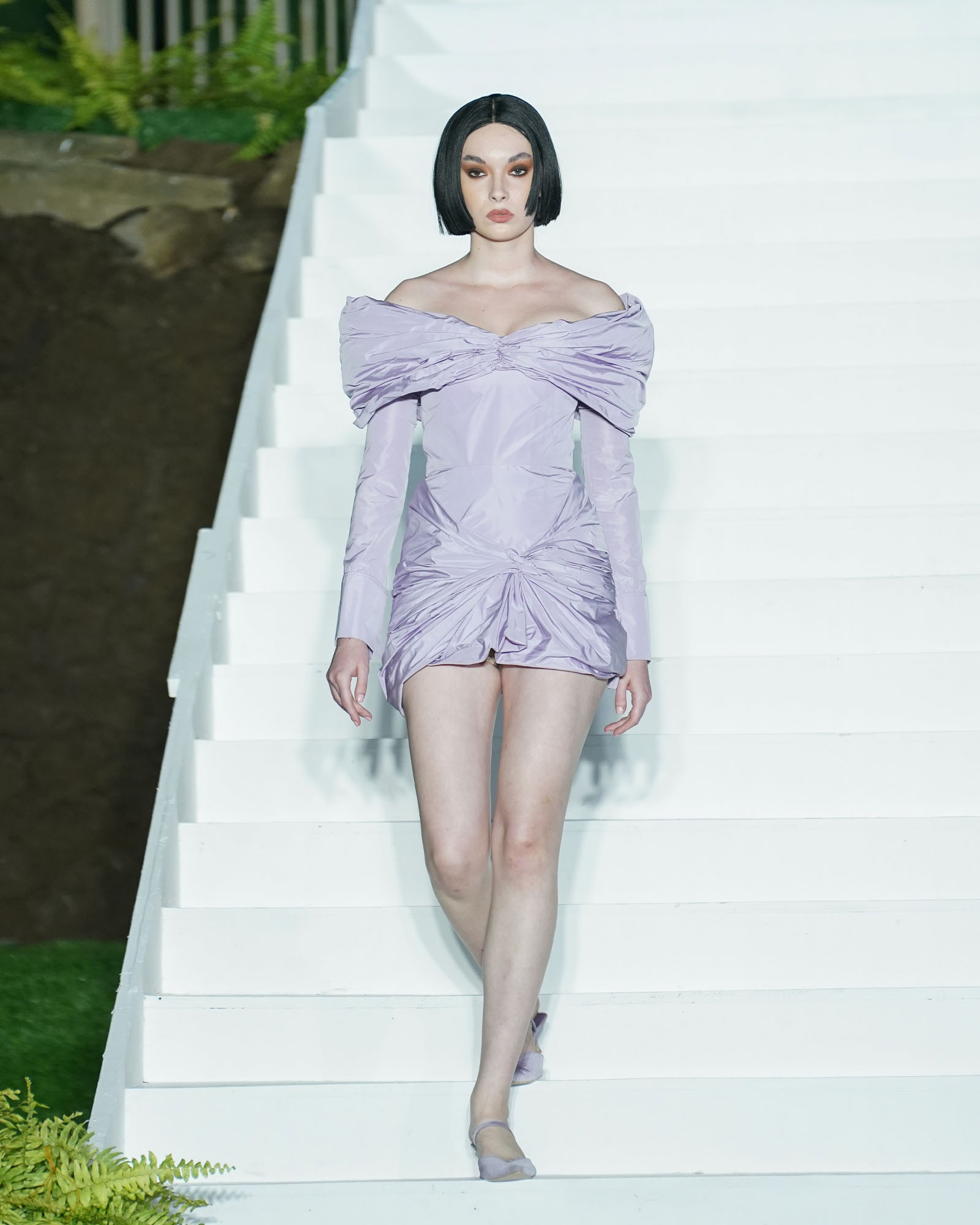 The collection is “a mastery of fit, drapes, and tailoring,” describes Vogue’s fashion associate Renee de Guzman, who was in attendance. “Focusing heavily on construction, [Anthony] is able to celebrate women and their figures through romantic and poetic executions as seen through the cut-outs, textile choices, and drapes.”