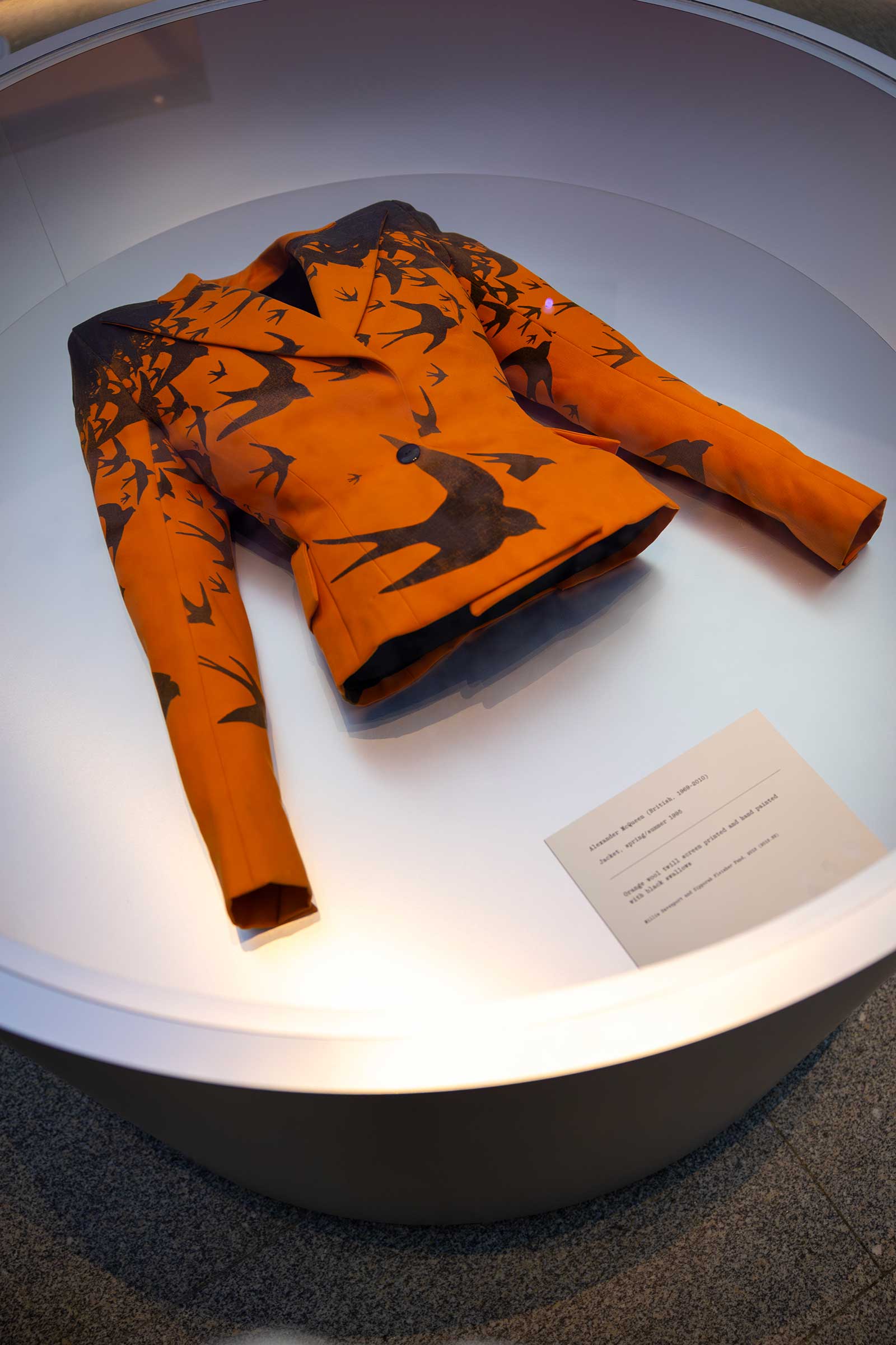 Moreover, Madeleine Vionnet’s handcrafted beadwork was patterned after a family of passerine songbirds, stitched to the black silk tulle overdress. She launched this dress as part of her autumn-winter 1939, a year before the outbreak of World War II. On the other hand, Alexander McQueen’s orange wool twill jacket shares the same features, but his version of the swarm of black swallows—inspired by Alfred Hitchcock’s movie “The Birds”—was screen printed.