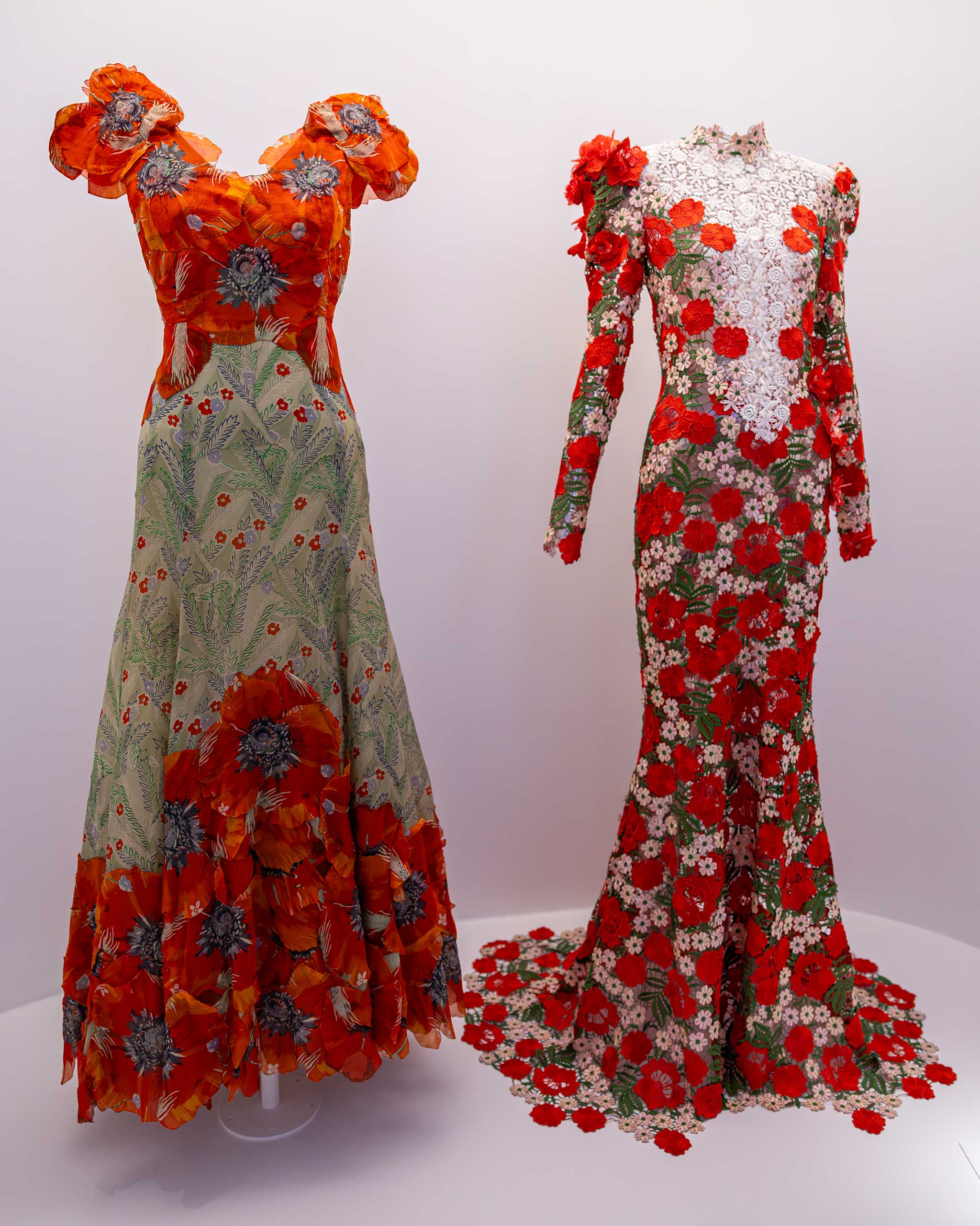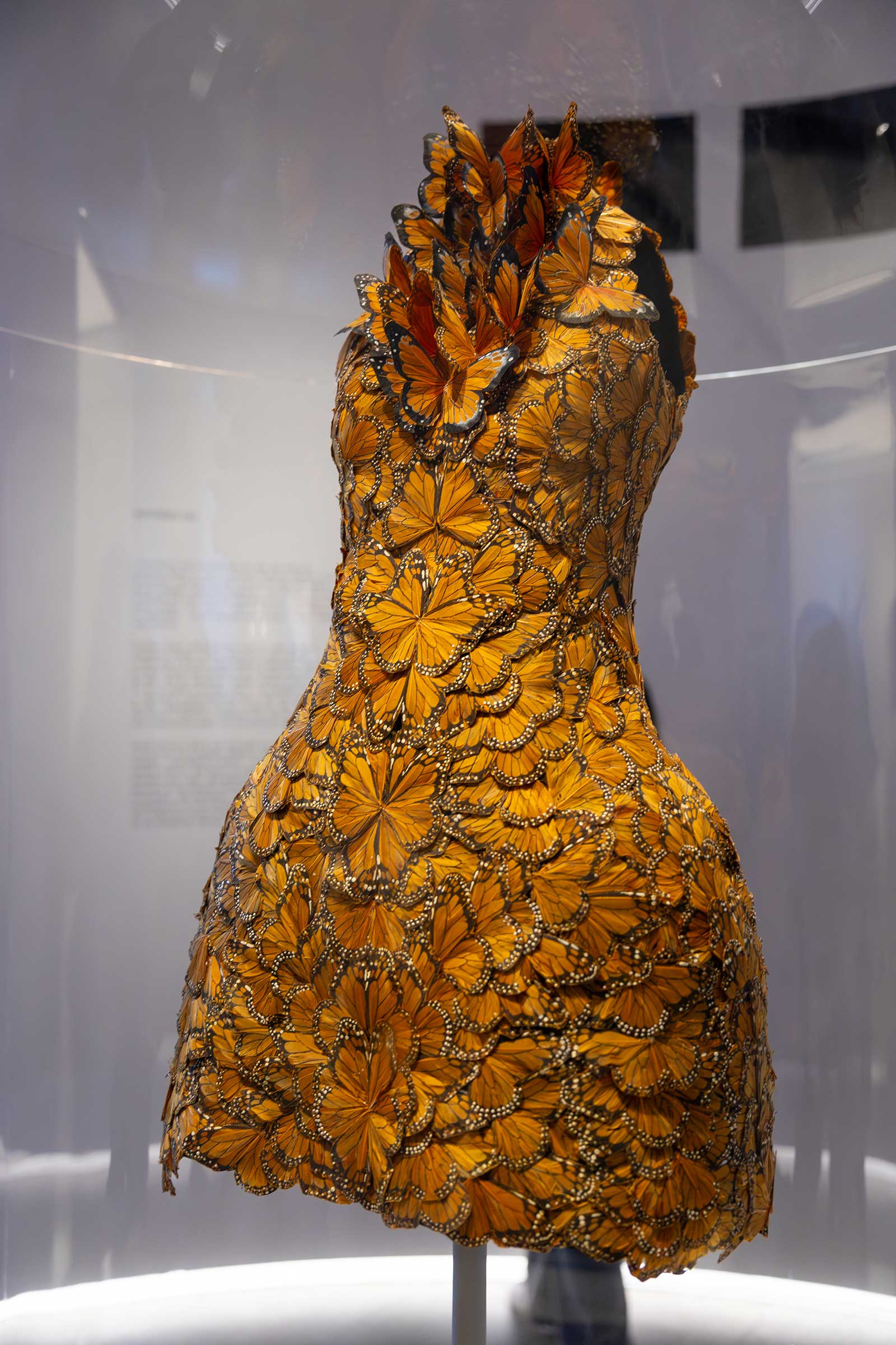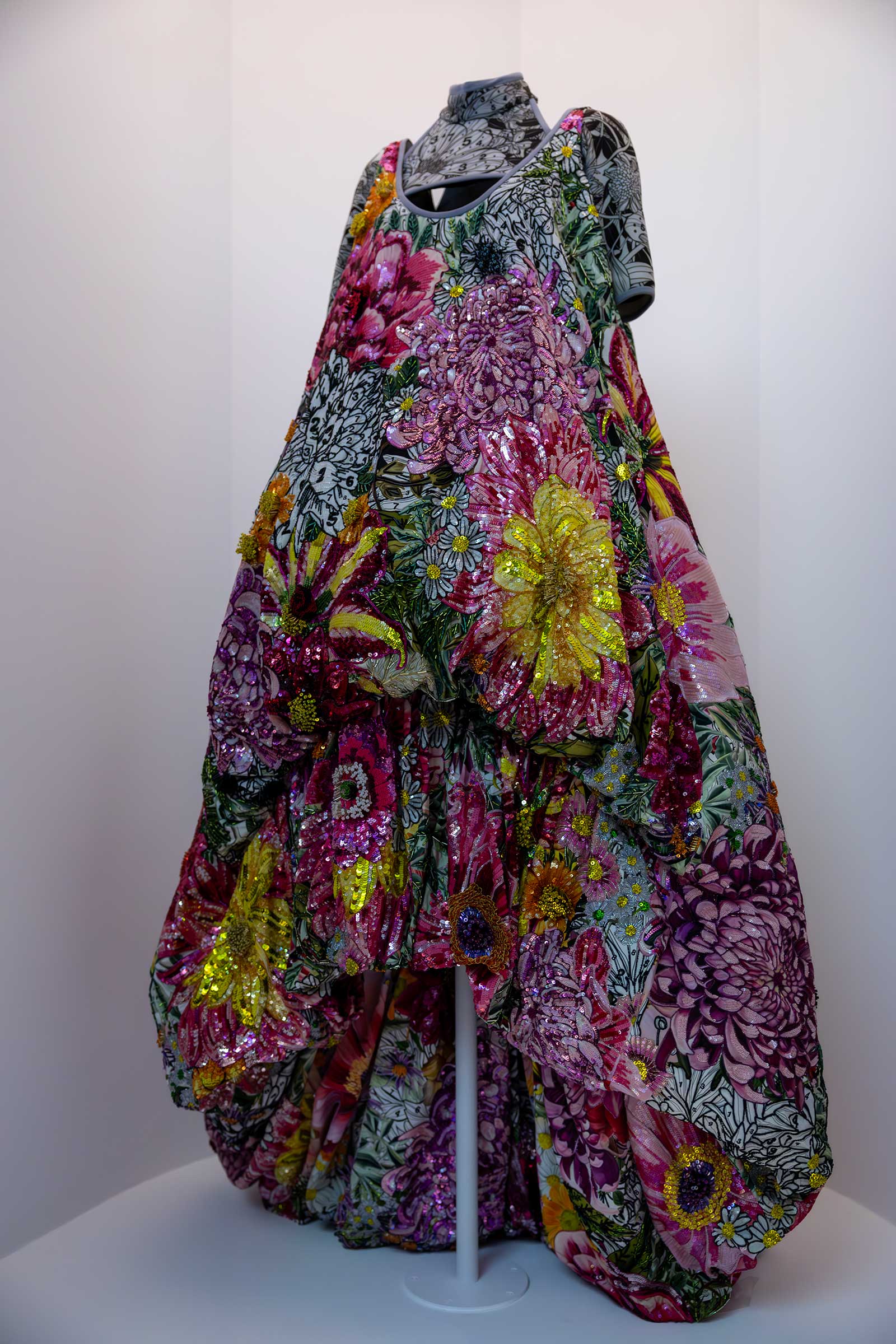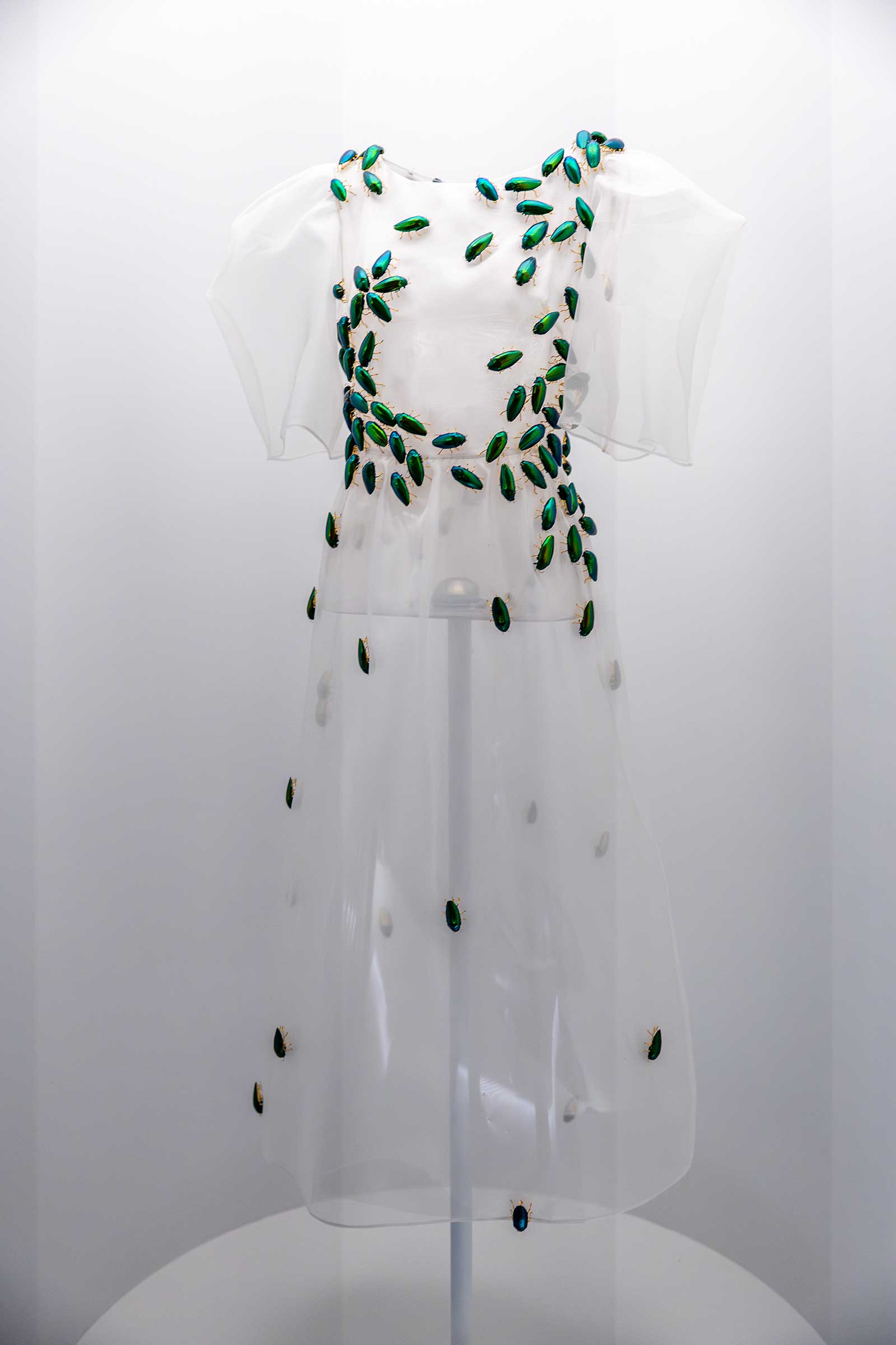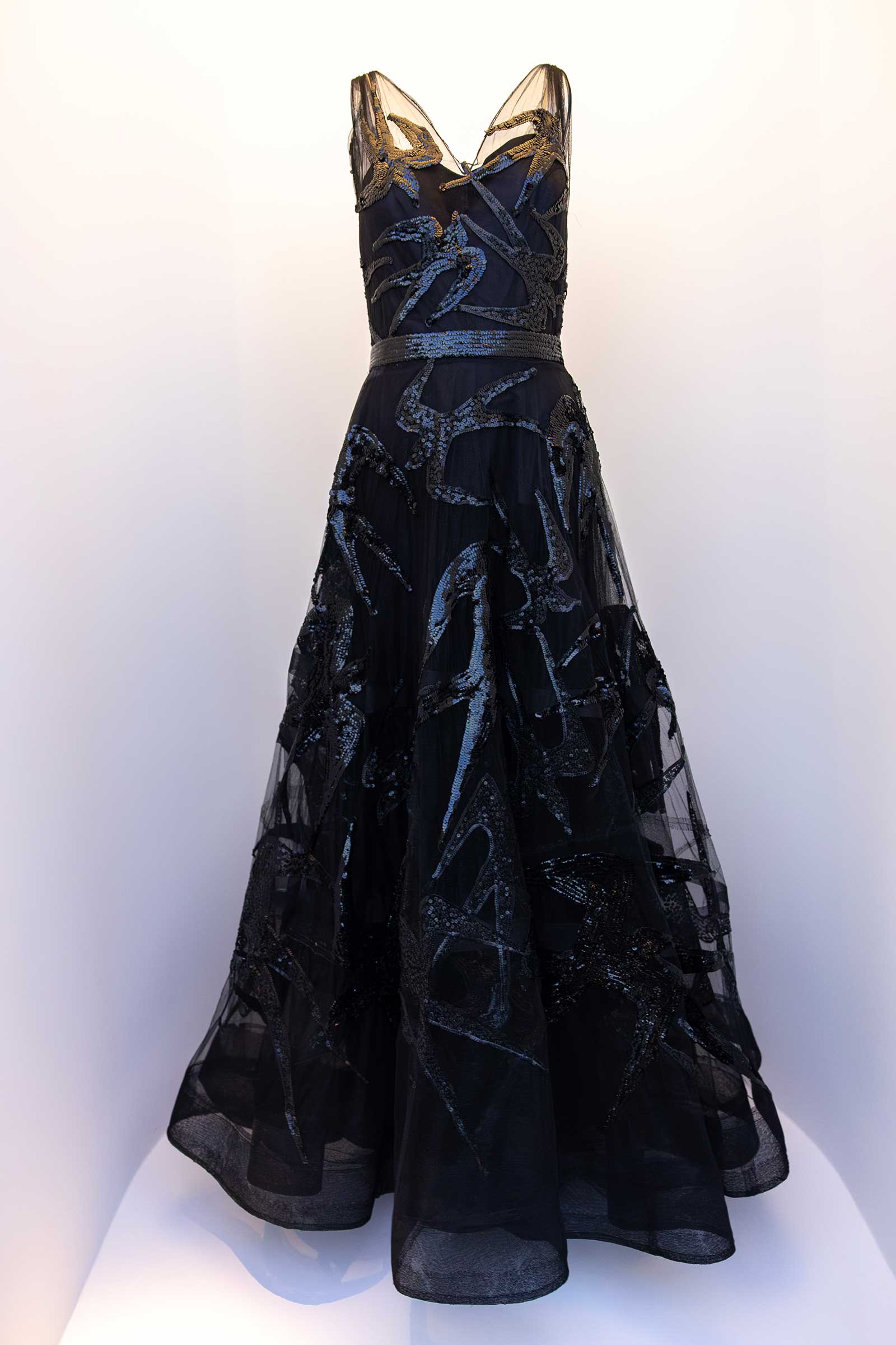 The sisters Kate and Laura Mulleavy of Rodarte designed a pleated sunflower dress inspired by Vincent Van Gogh’s paintings. Fully beaded garments by Gucci’s Alessandro Michele and Mary Katrantzou depicting birds and flowers greet the visitors upon entry. Notable in this concept, too, is the “monarch” dress created by Sarah Burton during her tenure at Alexander McQueen in 2011 and Iris van Herpen’s “Nautiloid” cocktail dress in an amorphous, free-flowing silhouette.