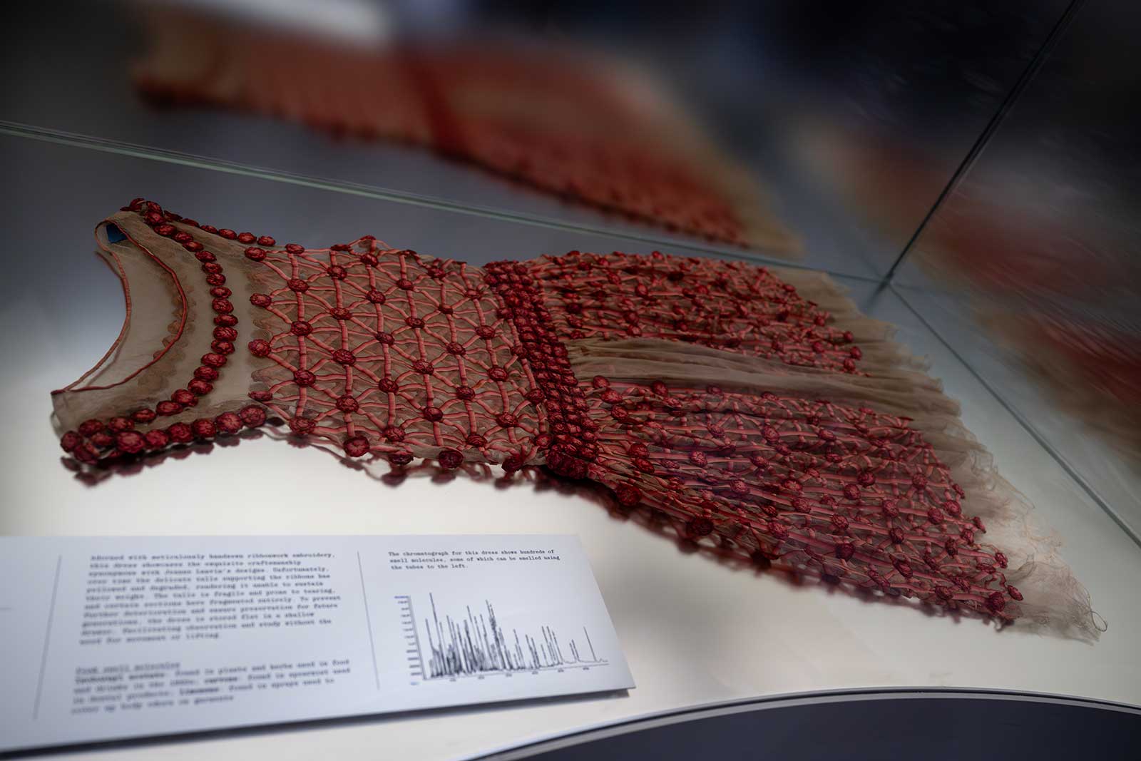 In the case of the cotton summer dress that Elsa Schiaparelli designed in 1937, Sissel detected estragole, a molecular component in fruits and plants while she found squalene (human skin oil) and caprolactam (the presence of nylon) in the strapless Christian Dior ball gown made in 1953. In the same manner, she has distinguished synthetic fabrics like polyester, nylon, and acrylic in the yellow evening dress Alber Elbaz designed in 2008.