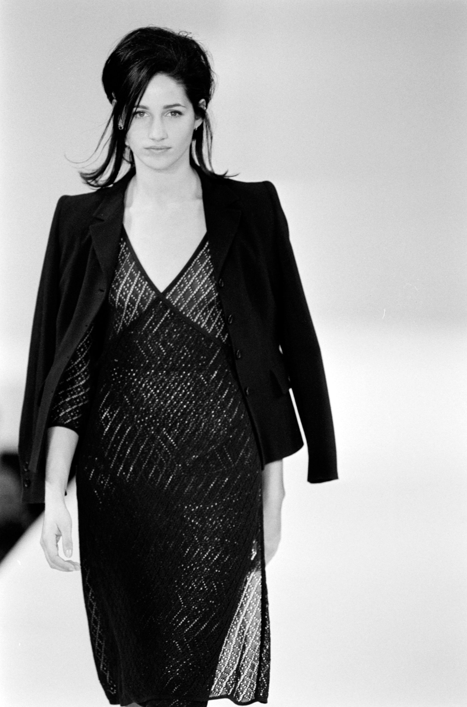After being spotted in McDonald’s on Oxford Street by Corinne Day – legendary British photographer and an architect of the grunge movement that blew through fashion in a whirlwind of slip dresses and smudged liner in the ’90s – Ferguson was cast as the first face of Mrs Prada’s new diffusion brand following its launch in 1993. Day captured the rangy brunette in grainy black and white, dressed variously in briefs under a leather coat, a barely-there babydoll dress, or fishnet tights and Mary-Janes. The spring/summer 1994 campaign found the model lounging on an unmade bed in a drab flat, wearing denim hot pants and a plain grey tee.
