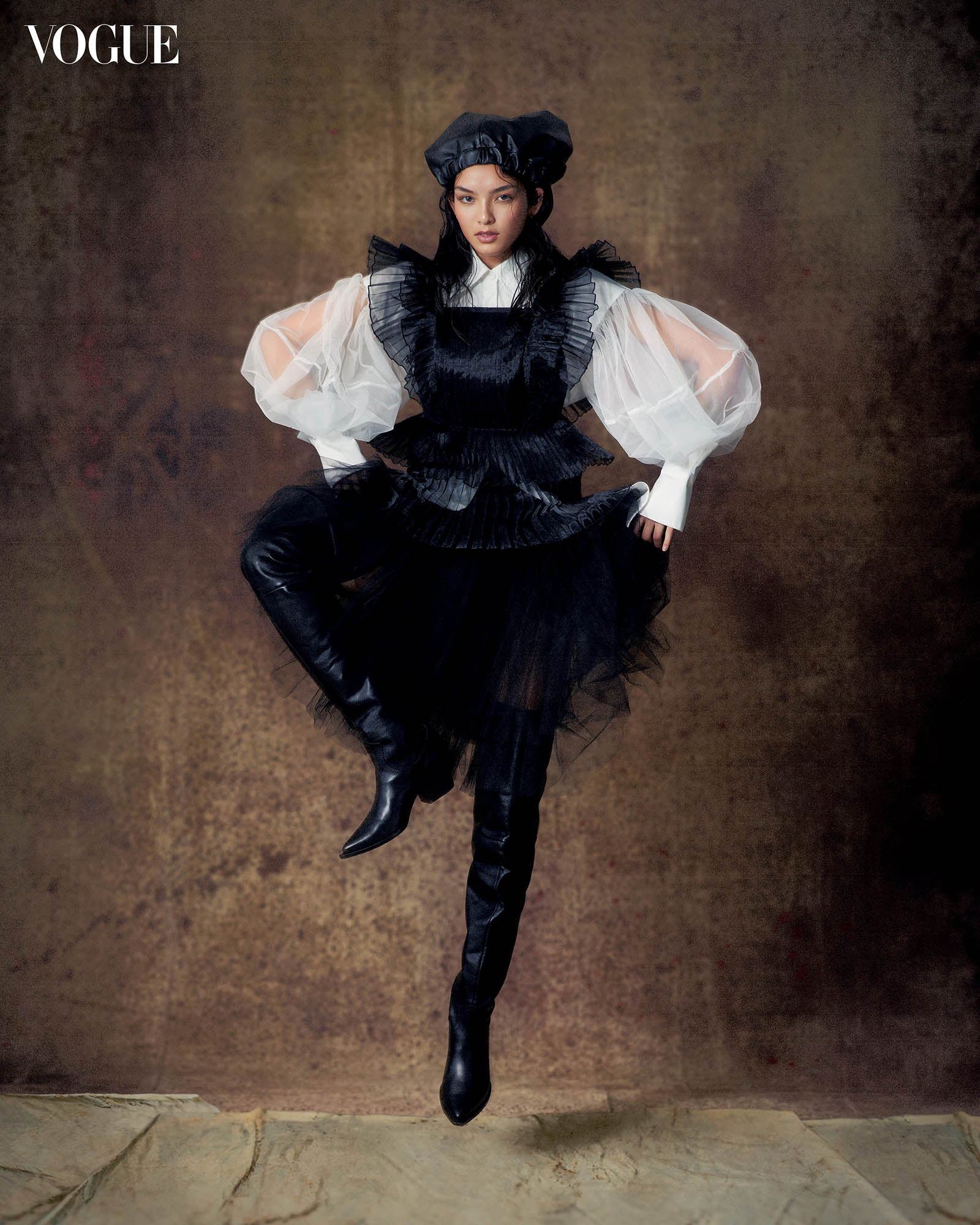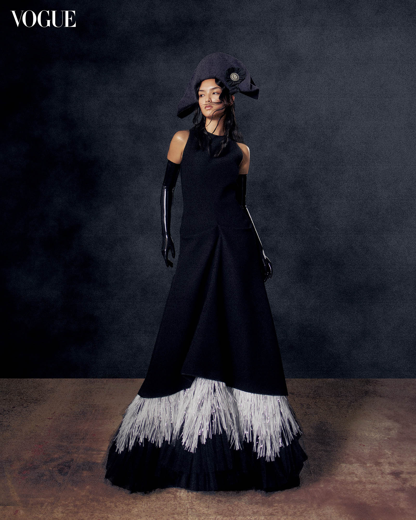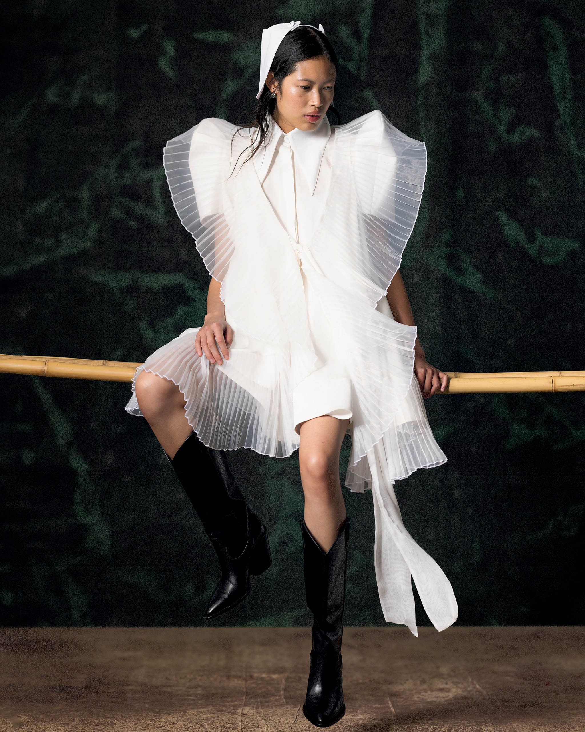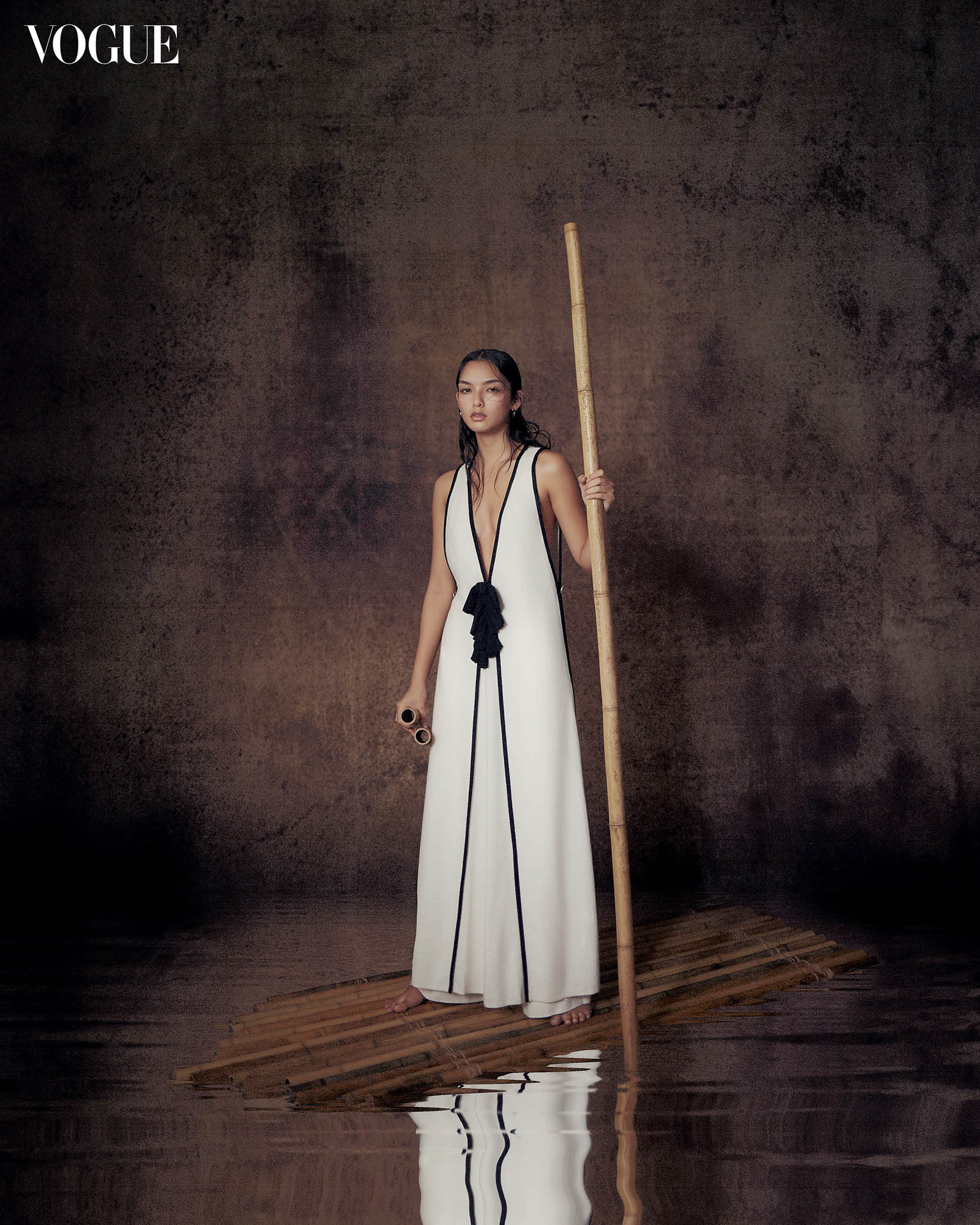 That would explain the bamboo. “This spread was focused on storytelling first and fashion secondary,” shares stylist Carlos Mangubat, whose sartorial curation of airy, flowing garments revolved around the props. Hōne offers that the bamboo stalks can be viewed as metaphors for what Filipinos are bringing into Western culture. For example, he associates bamboo with Tinikling, a traditional Philippine folk dance patterned after birds dodging bamboo traps set by farmers on rice fields.