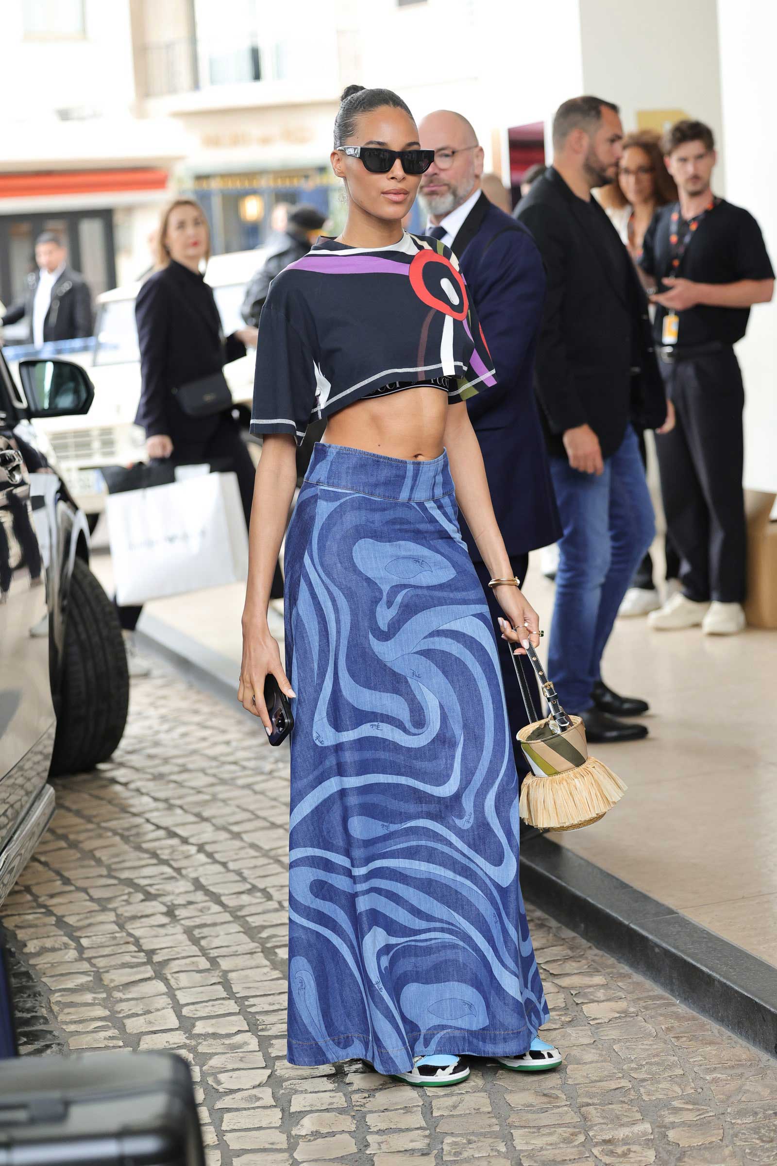 Denim dresses and skirts had their moment on the red carpet, as well. At the photo call for Moi Aussi, French star Tess Barthelemy chose a pocketed denim day dress, while model Cindy Bruna rocked a swirly-printed denim skirt from Pucci—styled with a crop top, of course. So, what gives? Why all the jeans representation at Cannes, a place that has long represented the height of glitz and glamour?