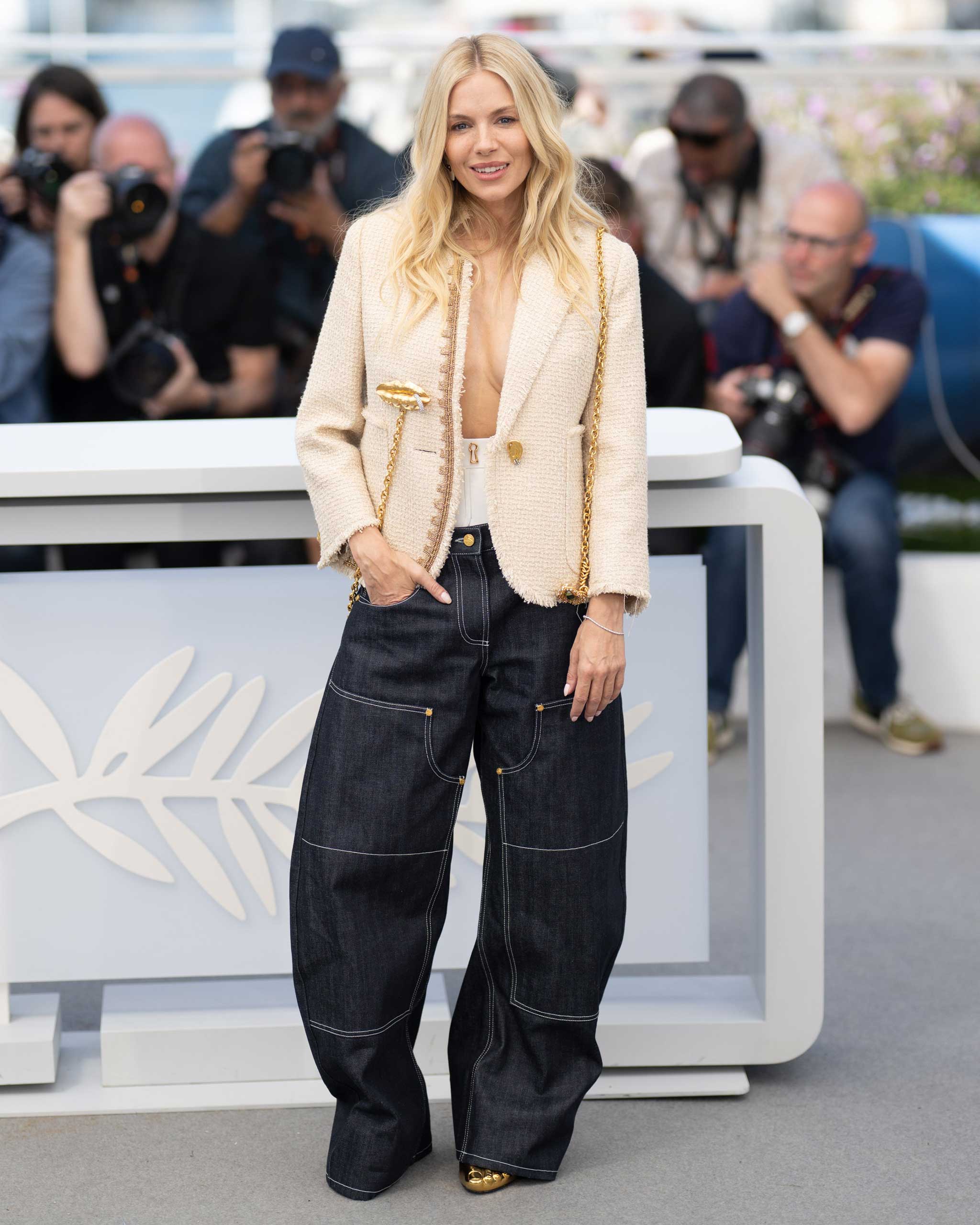 Sienna Miller, for one, donned a pair of baggy, pocketed jeans from Schiaparelli at her photo call for Horizon: An American Saga, dressing up the pants with a tweed-style blazer with gold embellishments (and even a pair of keyhole briefs peaking out over the top). The end result? Incredibly chic. French singer Yseult also pulled off wide-leg jeans, wearing them with a denim jacket for the full Canadian Tuxedo treatment. (Model Abbey Lee Kershaw did this, too, though her version was a sharp-shouldered Gucci suit.)