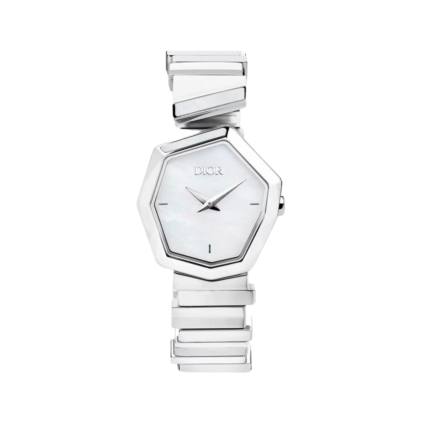 In 2021, Victoire de Castellane, creative director of Dior Joaillerie, introduced the open, clasp-less cuff watch Gem Dior with its asymmetrical octagonal case in gold and diamonds, but also a minimalist version combining steel and a mother-of-pearl dial for a (relatively) affordable price of £3,900.