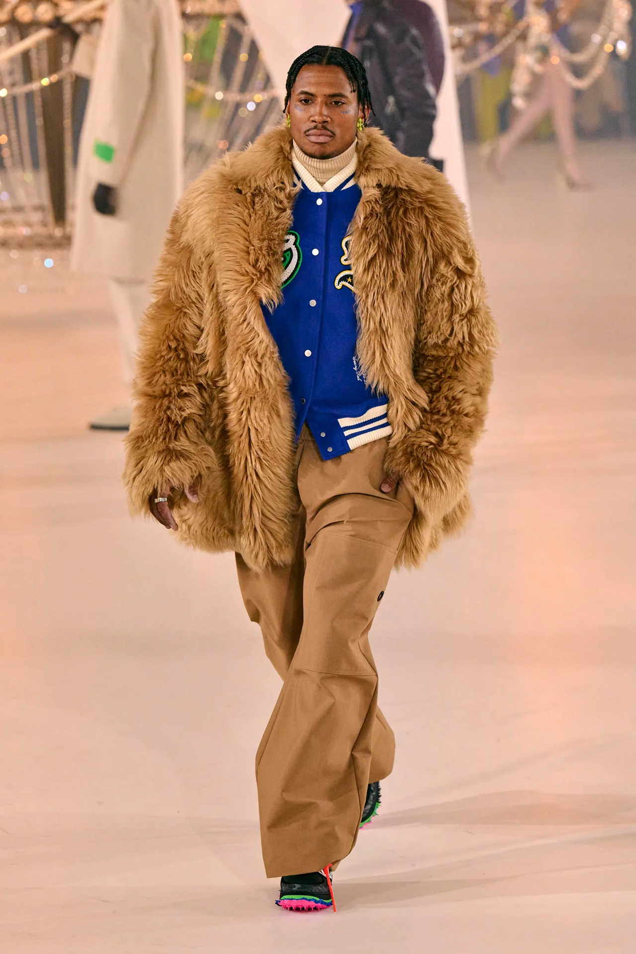 Several varsity jackets featured at Abloh’s final autumn/winter 2022 menswear show for the house: look 51 comprised a bright red and cream bomber emblazoned with illustrations, while look 16 comprised a bright purple varsity bomber adorned with LV patches and logos. The latter was worn by A$AP Rocky, a friend of Abloh’s, for Rihanna’s Fenty Beauty launch in February. (Rihanna herself is a varsity jacket enthusiast and wore a longline Raf Simons style last summer.)