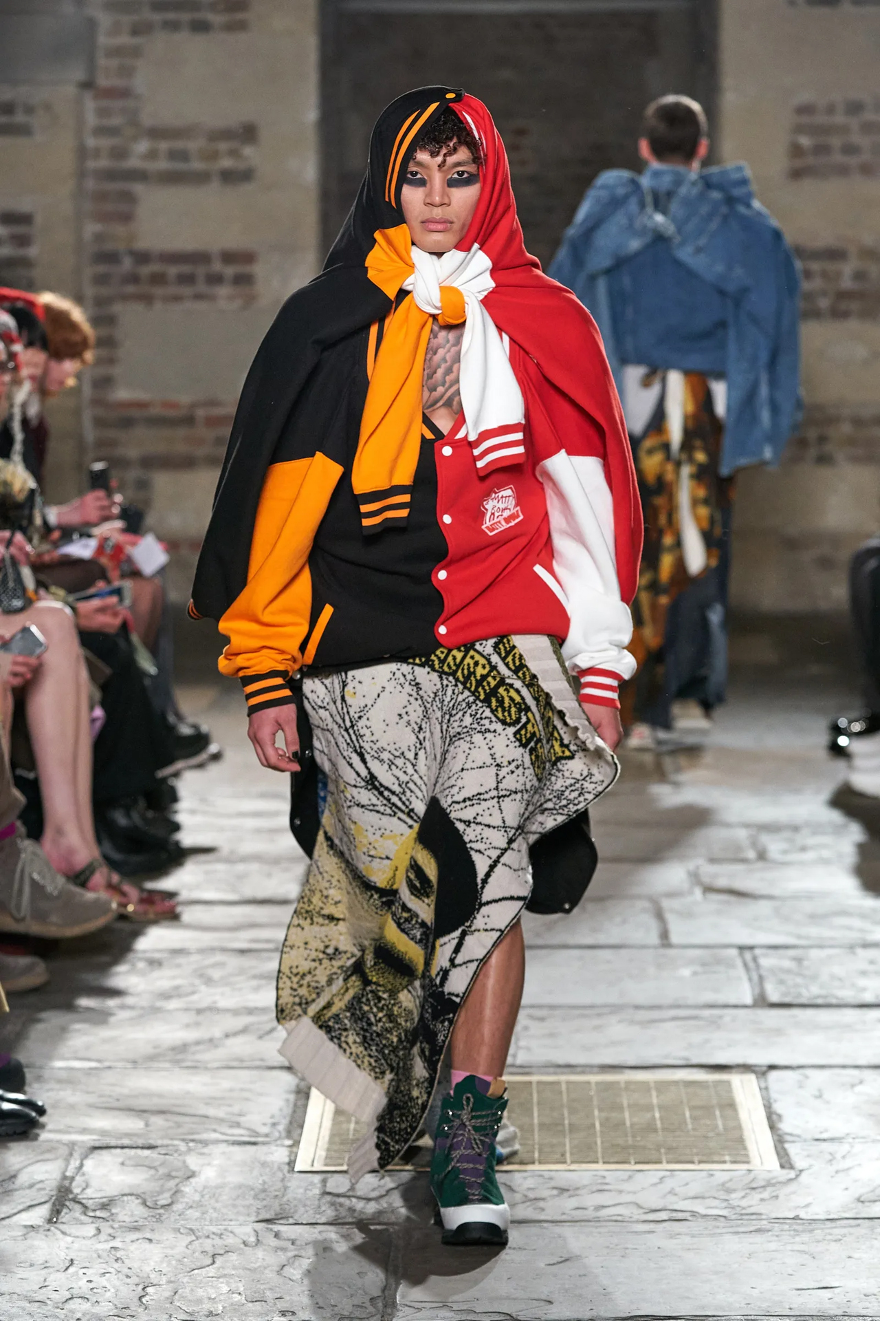 The collection riffed on collegiate style, epitomised by a red and cream varsity jacket – look 68 – that was worn with a voluminous ombré pleated skirt, a corseted bodice and trainers, while the model carried a skateboard as they walked. A poppy blue version also featured, styled with a fuzzy coat and trousers.