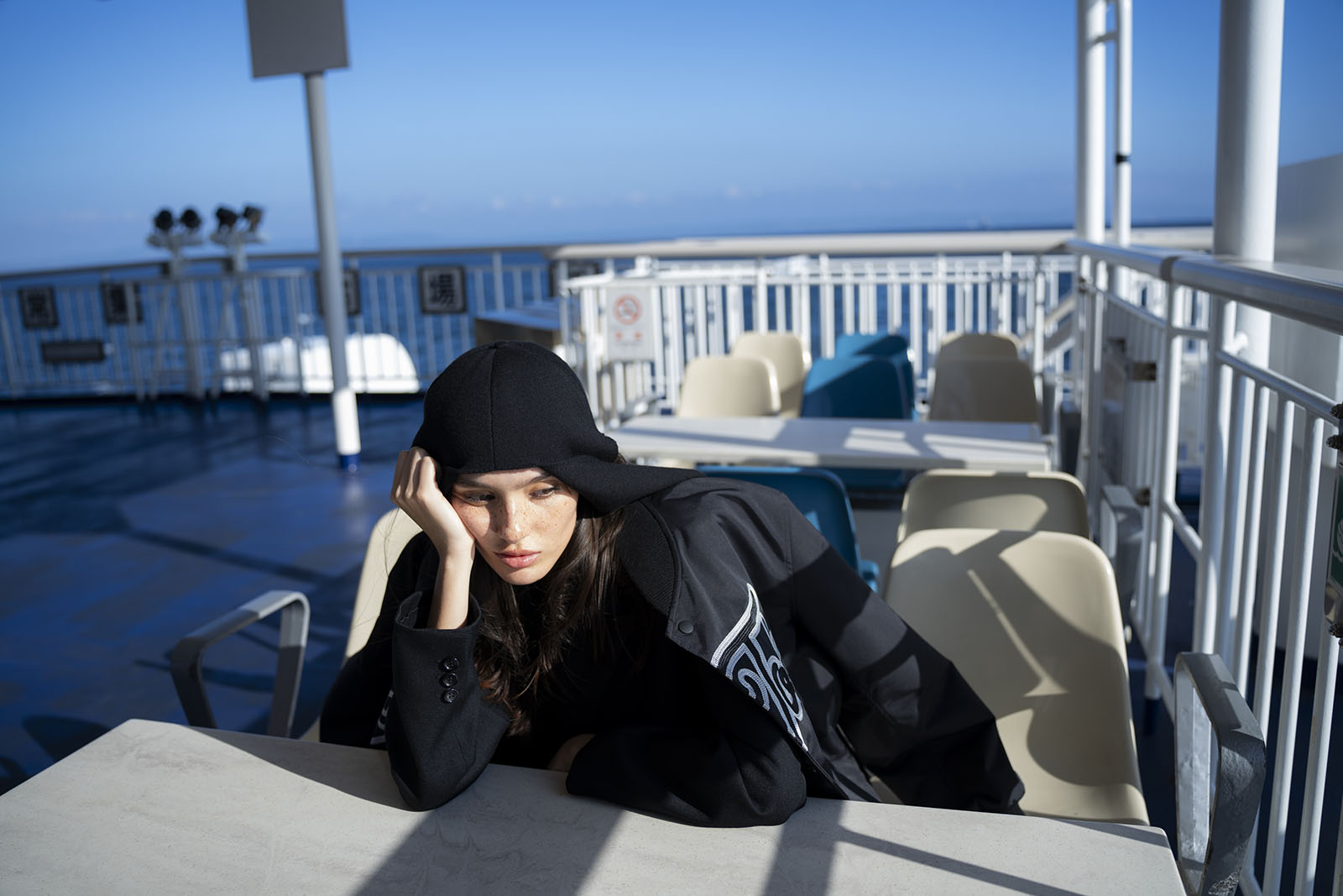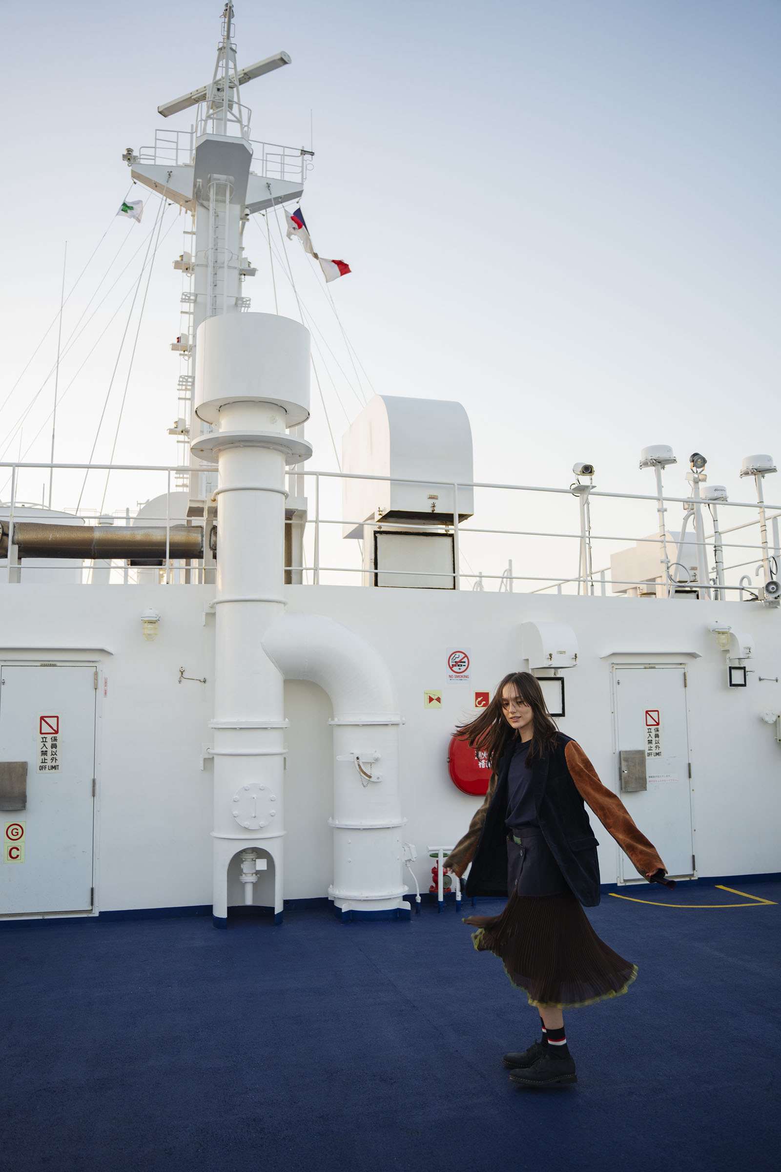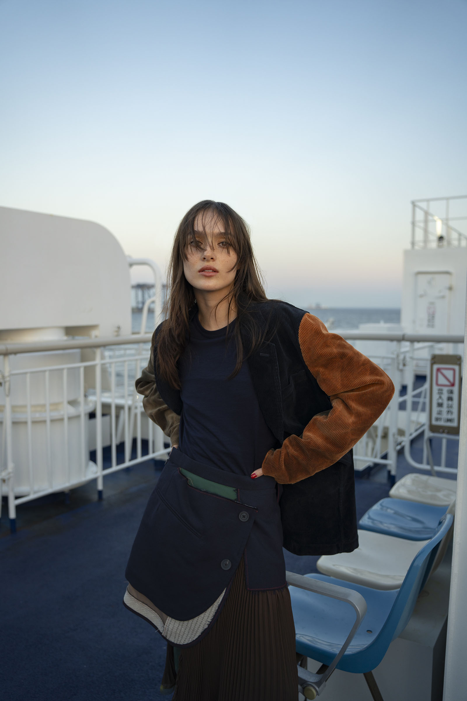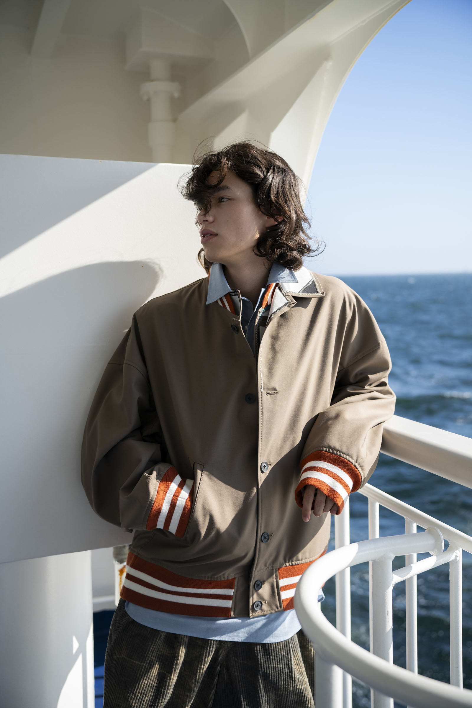 A pair of travelers make the hour-long trip from Tokyo by ferry, passing time in the new nautical: contemporary streetwear paired with experimental tailoring.