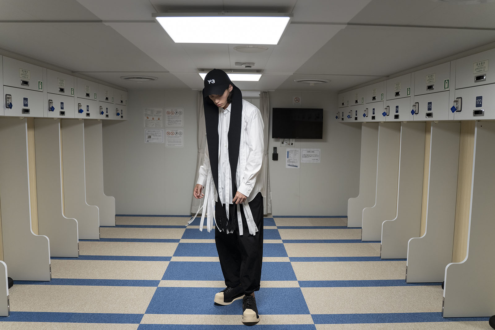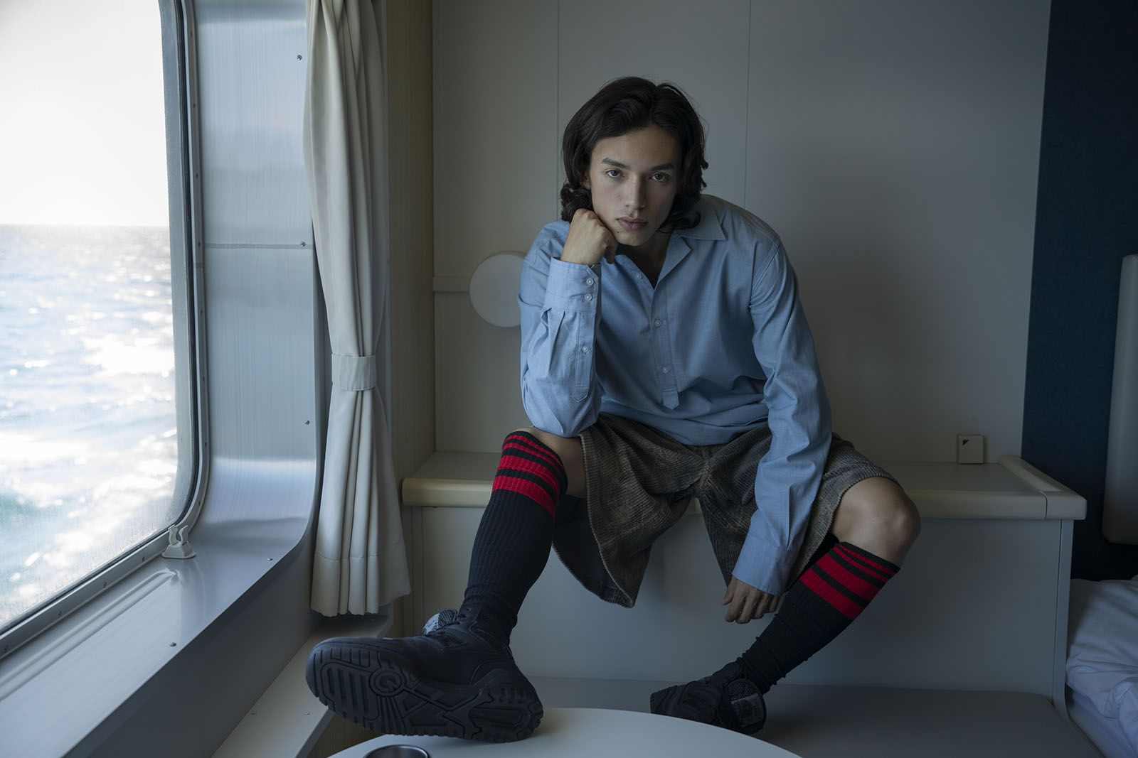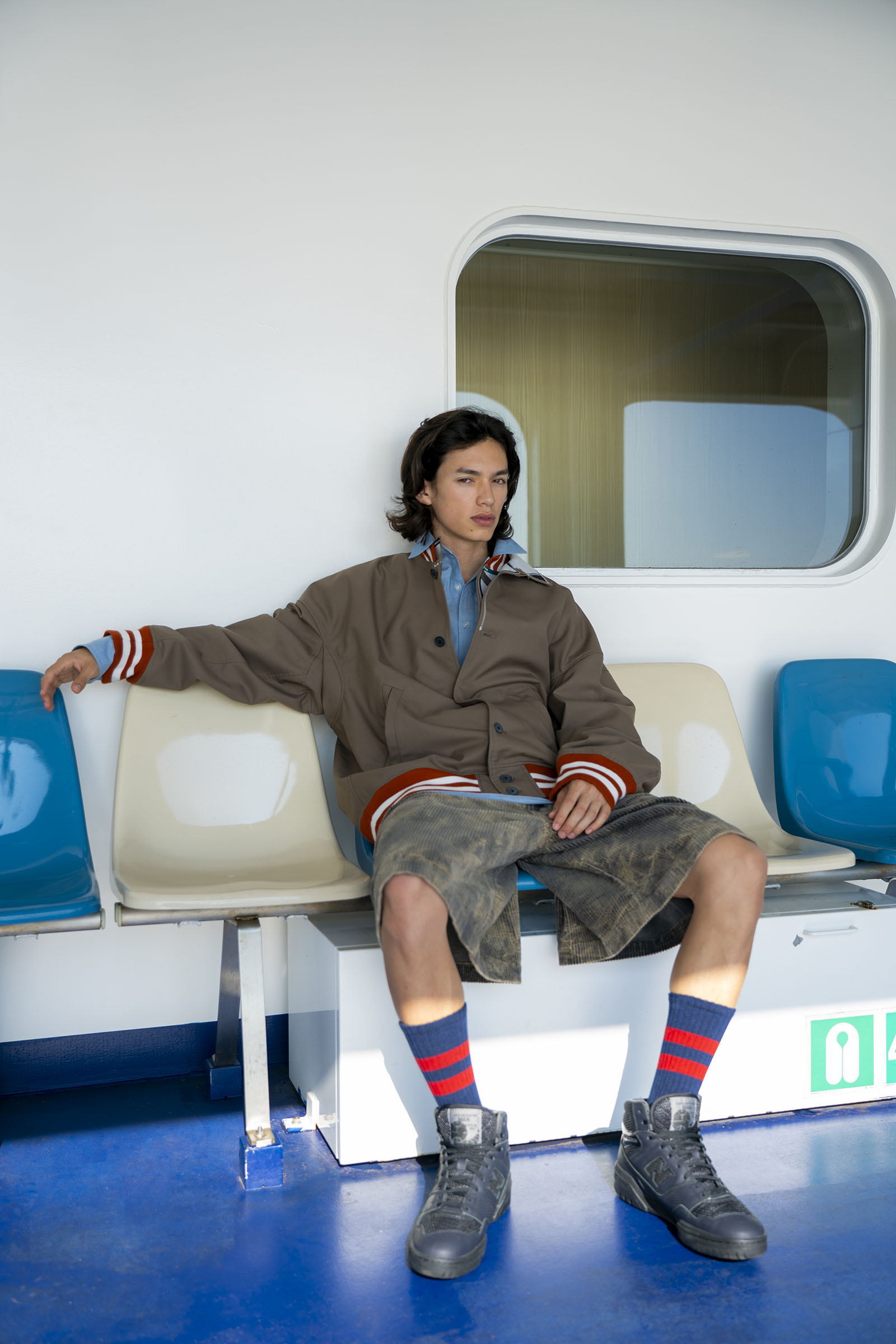 A pair of travelers make the hour-long trip from Tokyo by ferry, passing time in the new nautical: contemporary streetwear paired with experimental tailoring.