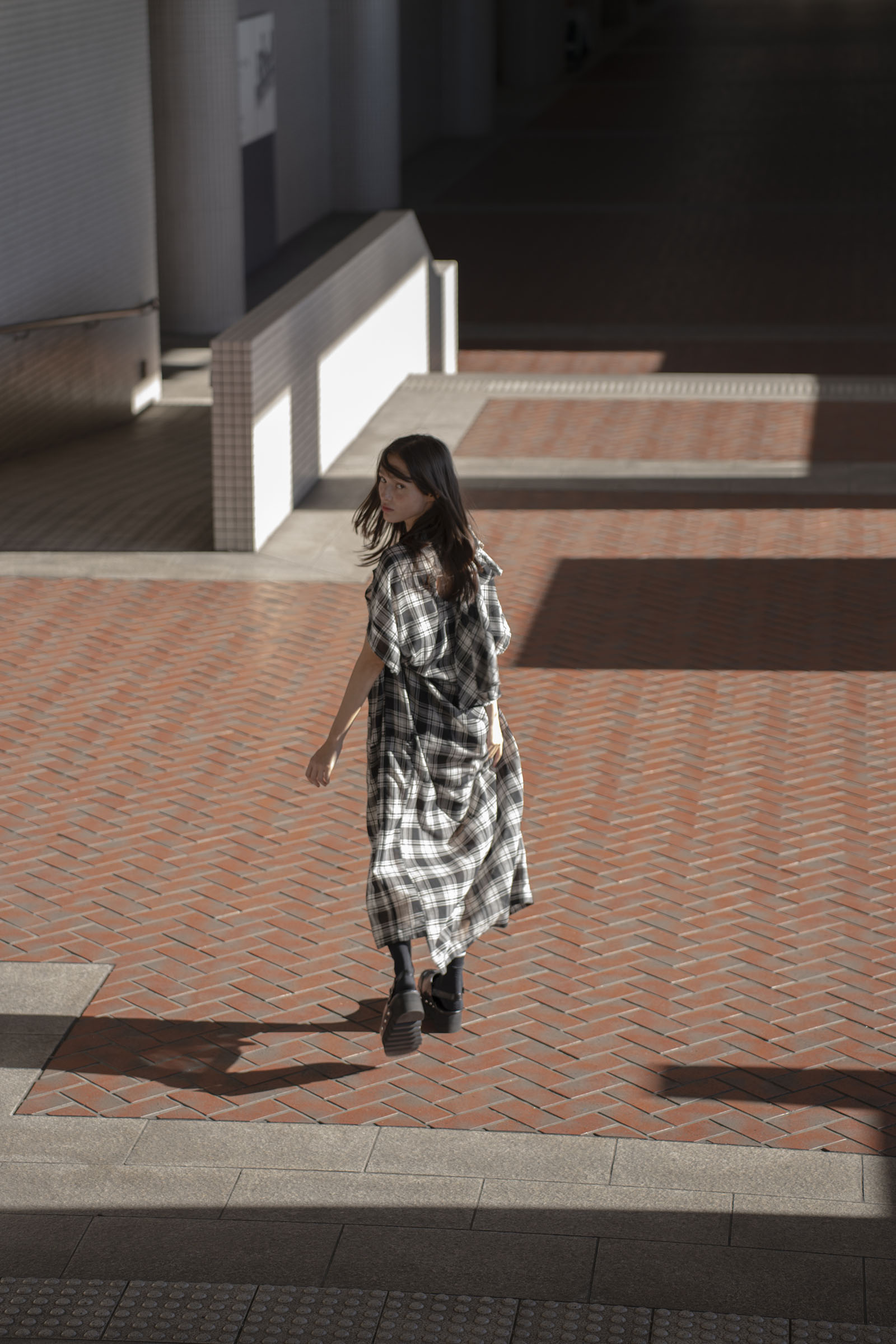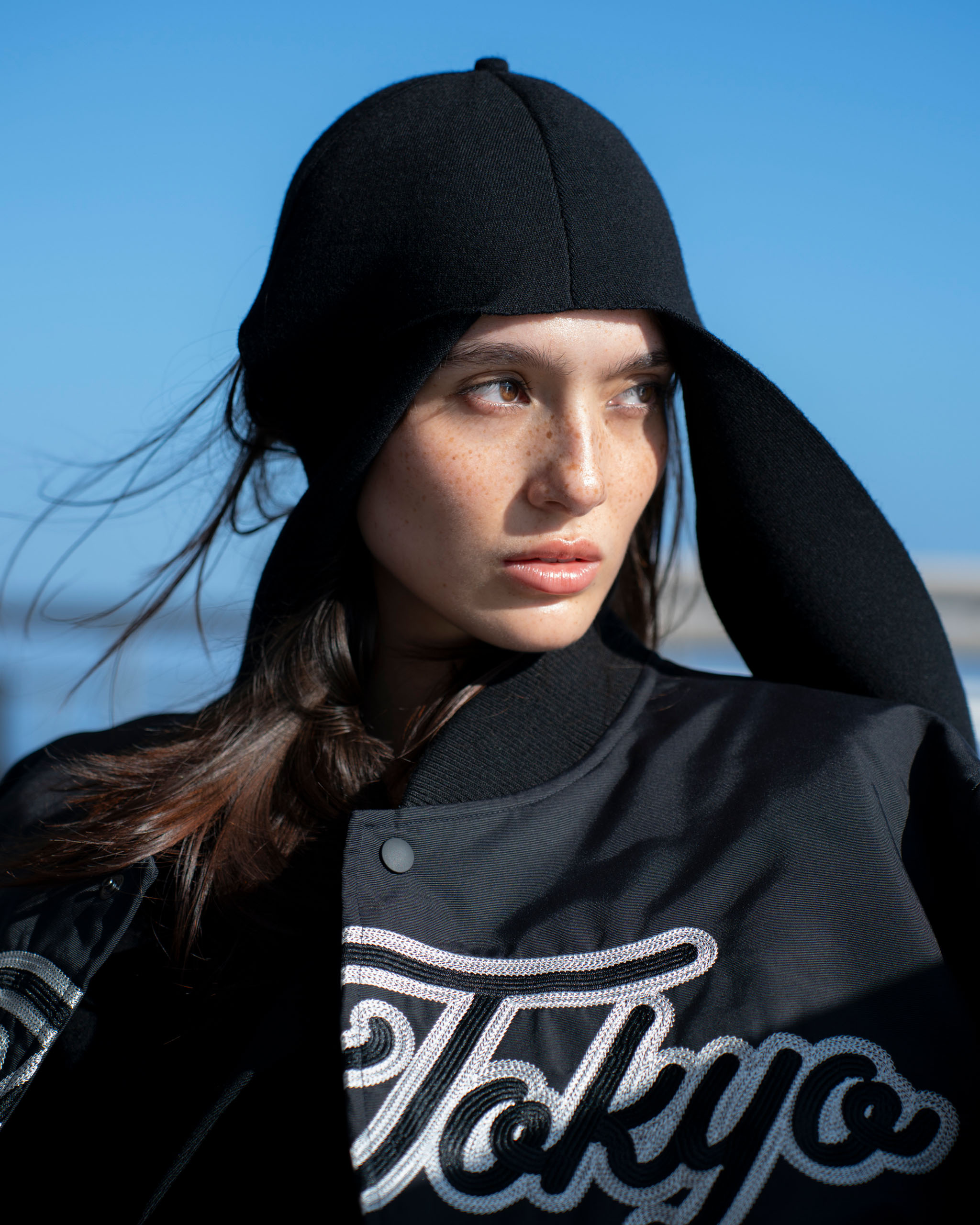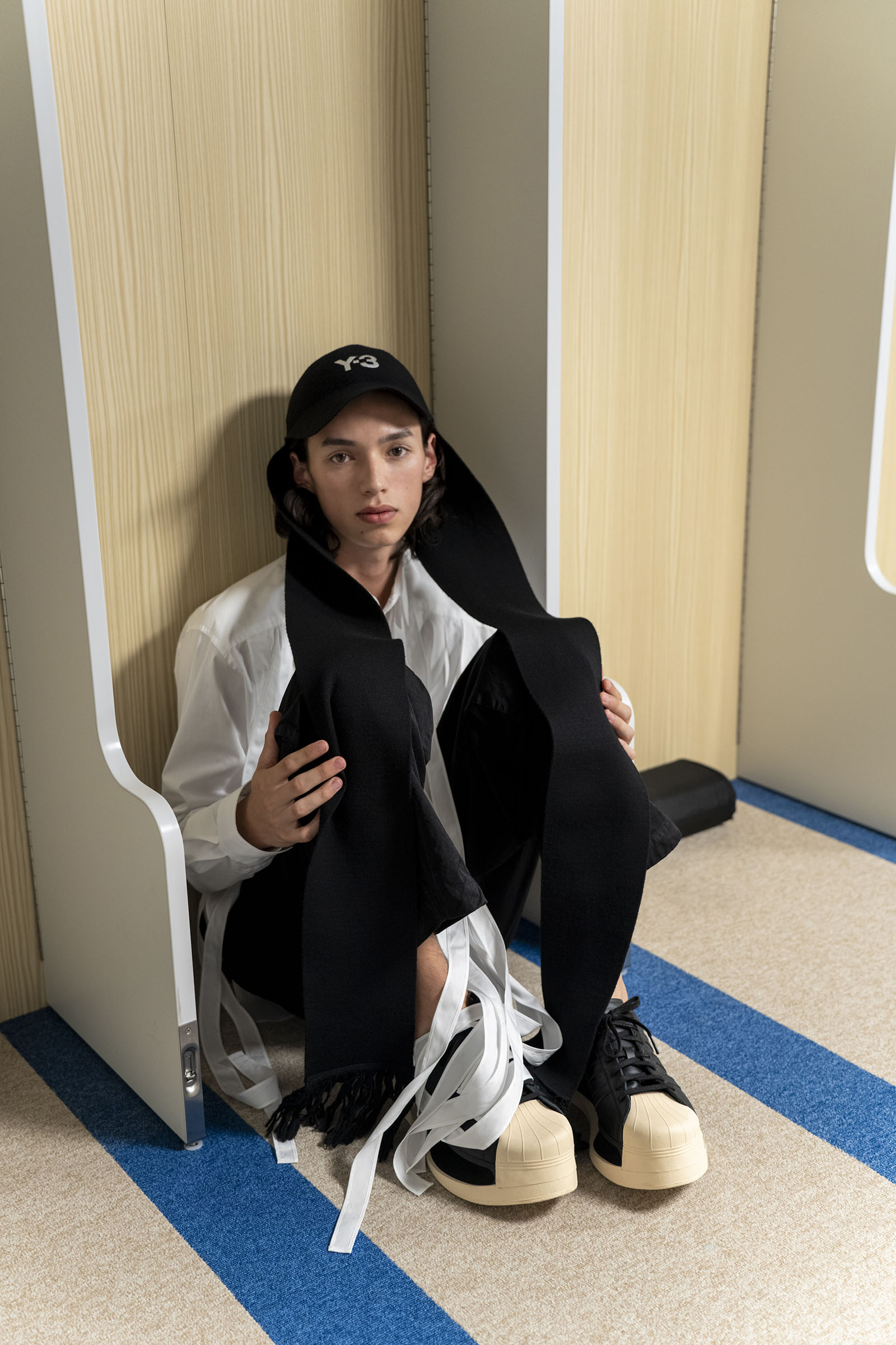 Y-3 scarf cap, Tokyo Team jacket, 3-stripe pants, and TAO wingtip studded slingback platforms. Courtesy of UNIVERS