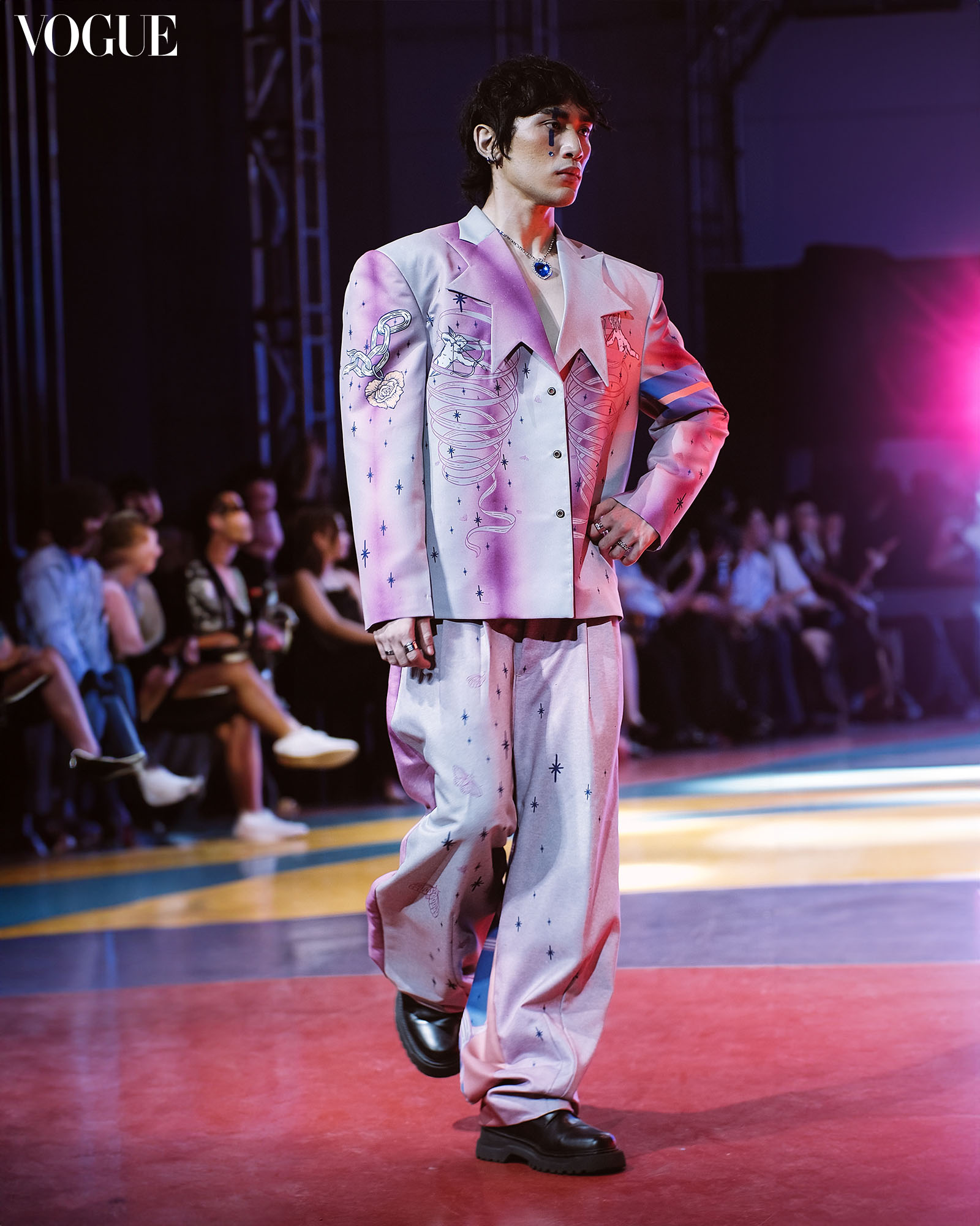At Randolf, designer RJ Santos was inspired by a sleepy diner staff worker helming the night shift. He presents forms straight out of a fever dream, splicing the traditional codes of the Filipiñiana, barong, and Western suit with playful juxtaposition. Amid embroidered stretch-jersey separates and jacket collar-affixed denim pants, find sharp-toothed lapels on vivid printed suits, a fusion of the alampay and the barong, and tailored cropped jackets paired with loose, floor-grazing trousers.