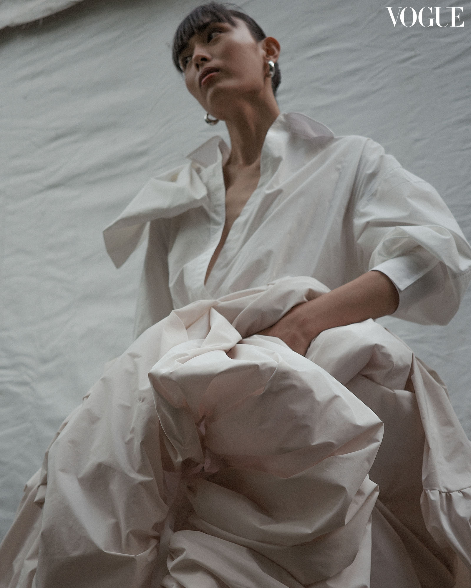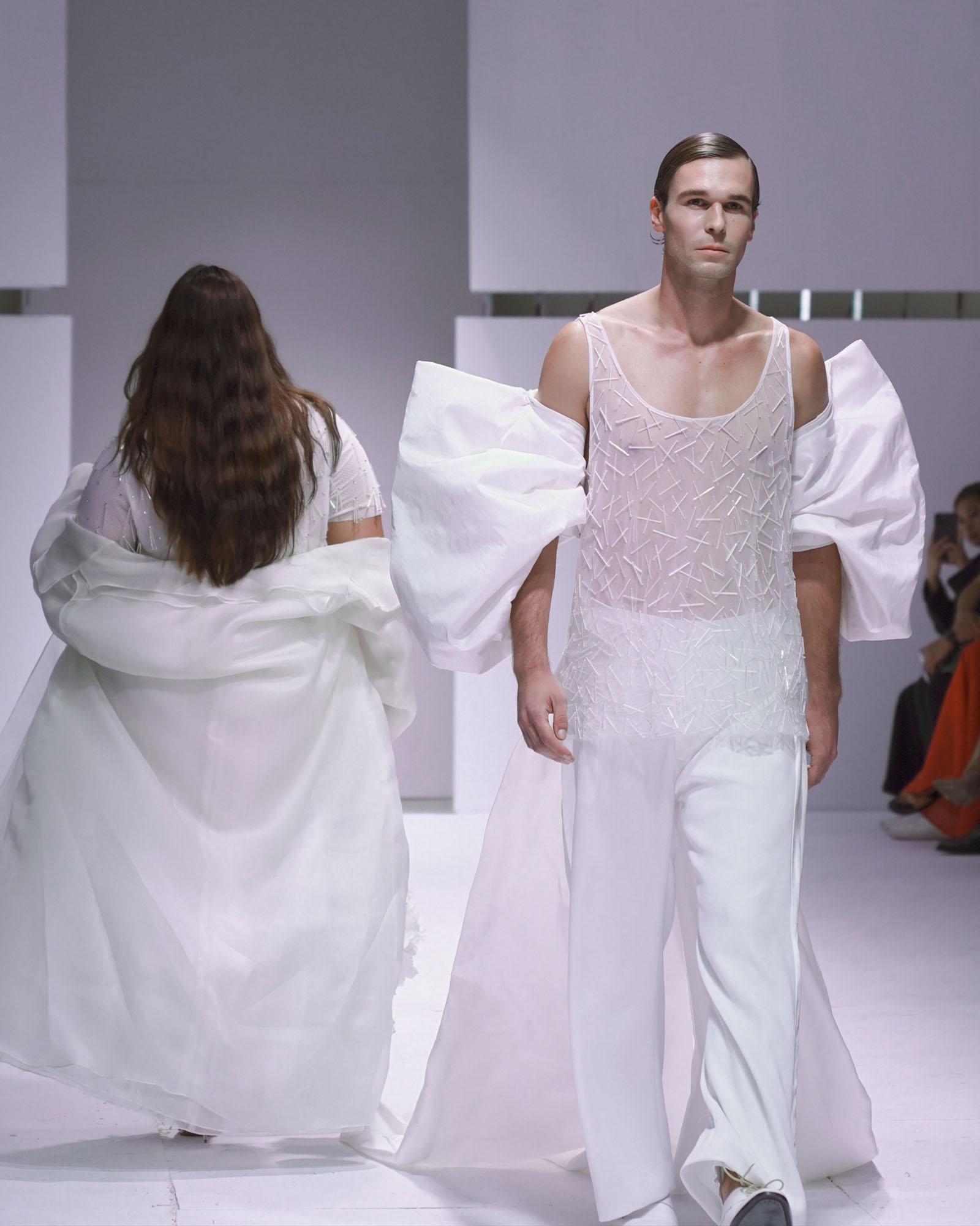 HA.MU, led by the design duo Abraham Guardian and Mamuro Oki, showcased a delightful blend of maximalist and minimalist silhouettes and motifs, from tulle tutus affixed above embellished pants, exaggerated balloon hems, and a playful mix-and-match of prints.