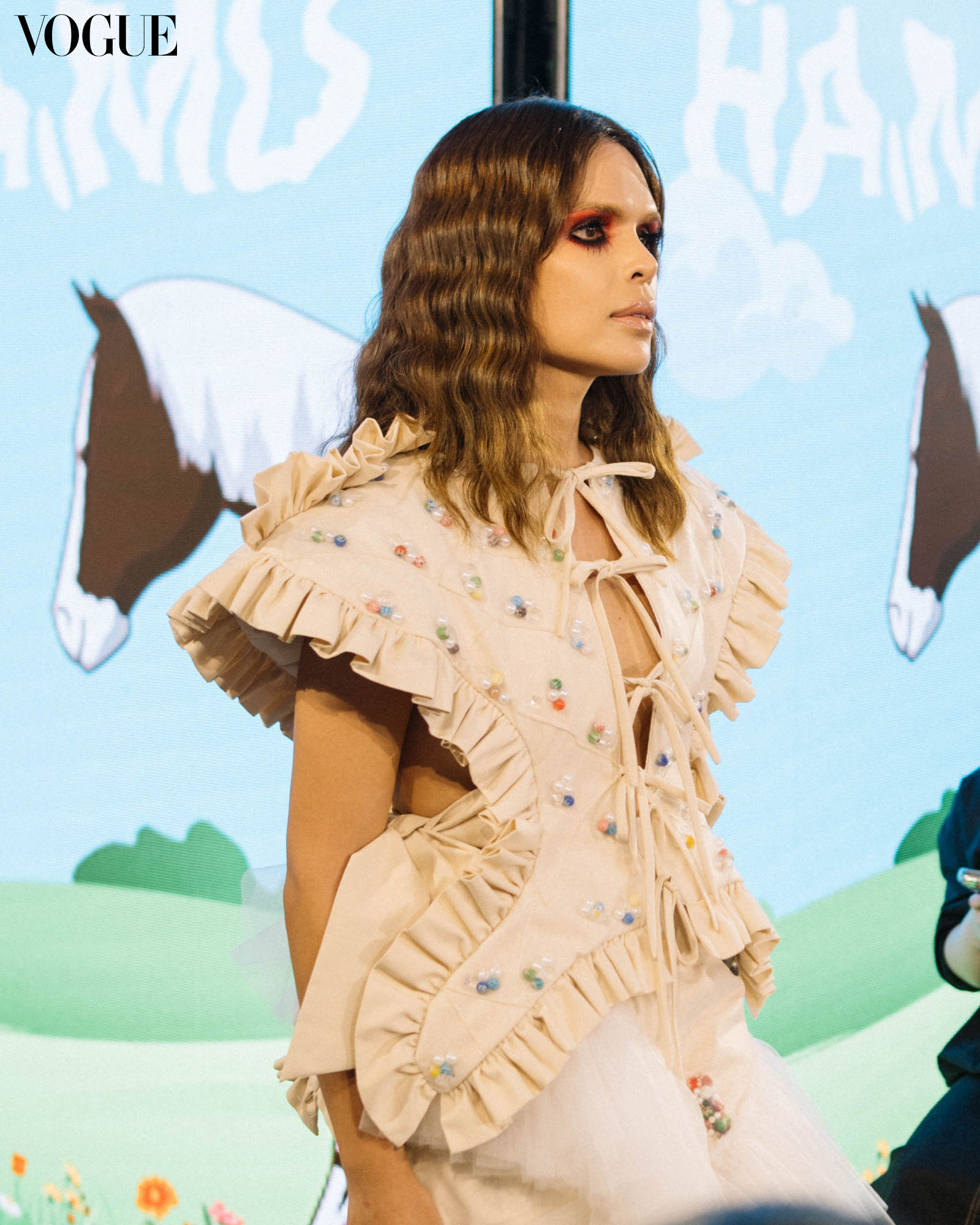 “[The ‘Merry-Go-Round of Life’ collection is] inspired by the cycle of life and how things are always just revolving around and around,” Guardian said. Candy-colored beads, organic, trailing lines of ruffles, and the hand-drawn quality of the delicate floral appliqués conveyed the wide-eyed wonder of childhood.