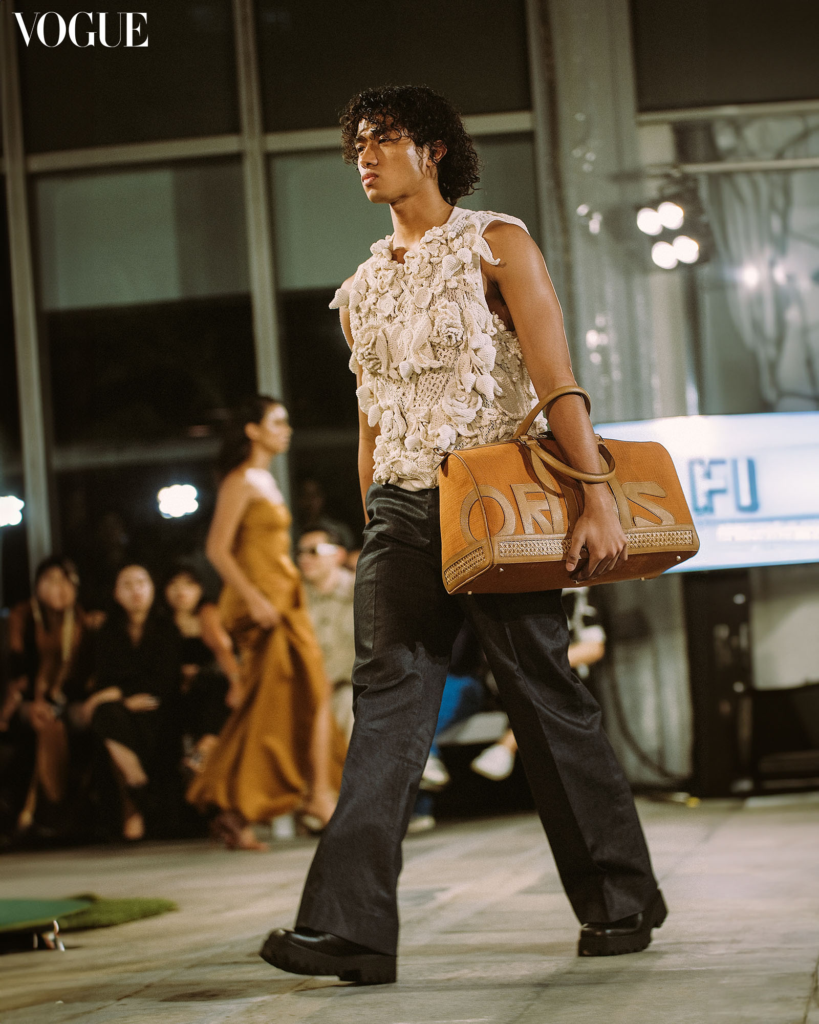 Orias Studios’ homespun vessels hauled vivid blooms along the runway. For his first solo show, designer Vin Orias presented his signature design in new exciting shapes: crescent moons, barrels, orbs, and book totes in a plethora of sizes. His use of dark leather, Japanese denim, and high-twist wool was inspired by Metro Manila. Paired with the sunburst pattern of the solihiya weave, the bags are effectively telling of the city’s ever-shifting landscape.